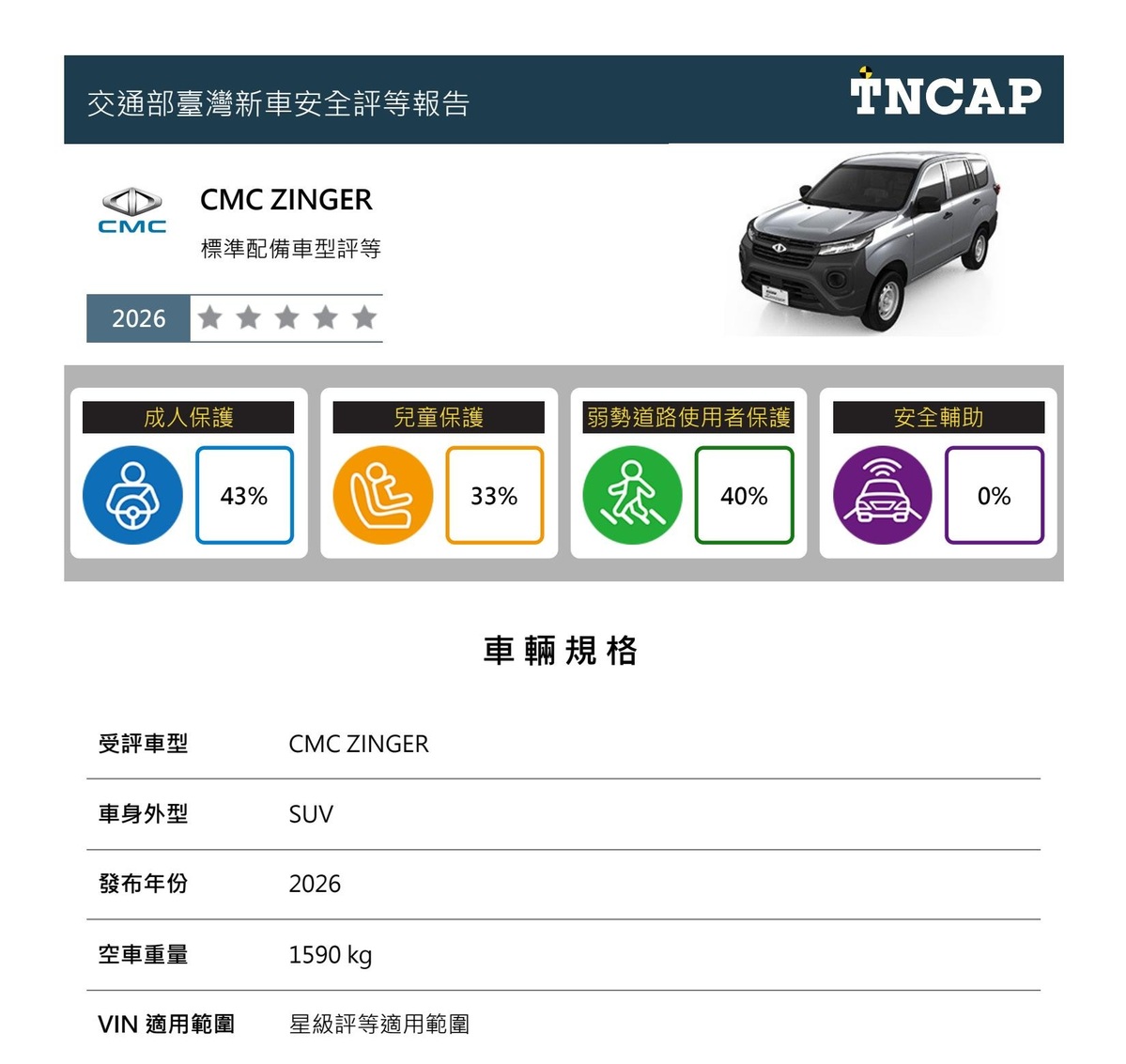 二、CMC ZINGER於四大安全領域得分率中分別獲得成人保護43%、兒童保護33%、弱勢道路使用者保護40%及安全輔助0%,依據星級評等平衡標準規定,ZINGER車型整體星級評等為零顆星。