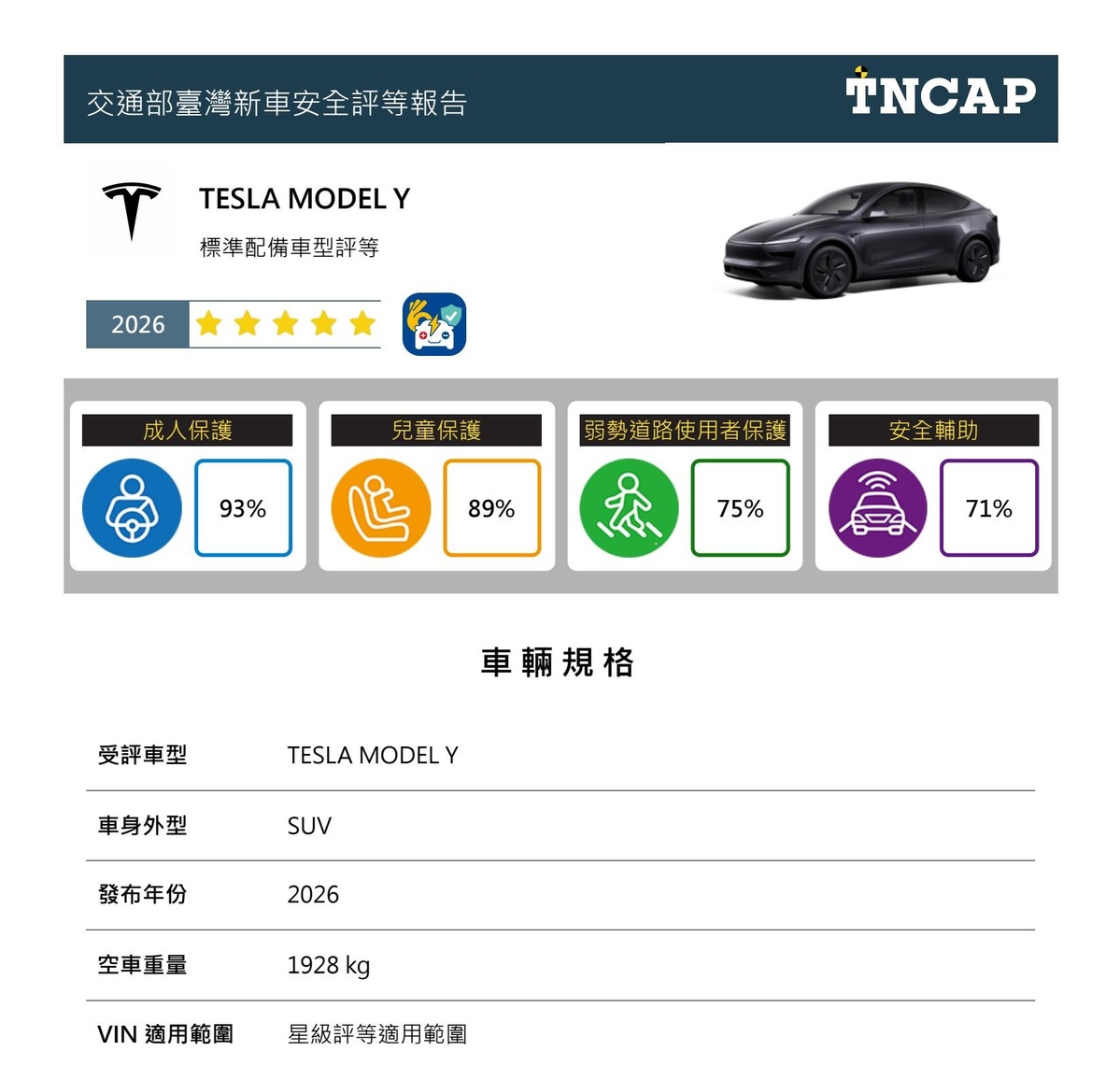 TNCAP執行機構指出,於去(114)年依序公告11車型TNCAP第一版評等結果後,自112年至114年共累積25車型第一版評等結果。今(115)年針對第一季二車型(TESLAMODEL Y及CMC ZINGER),依「交通部執行臺灣新車安全評等作業要點」及「交通部臺灣新車安全評等規章第二版」執行TNCAP主動、被動安全評等試驗,辦理完成計分及轉換星級評等,結果說明如下,本次揭露二車型第二版評等詳細內容可至TNCAP專屬網站參閱相關安全資訊(網址https://www.tncap.org.tw/SafetyRatings/):一、TESLA MODEL Y於四大安全領域得分率中分別獲得成人保護93%、兒童保護89%、弱勢道路使用者保護75%及安全輔助71%,依據星級評等平衡標準規定,MODEL Y車型整體星級評等為五顆星;另該車型符合電動車觸電保護規範並給予符合性標識。