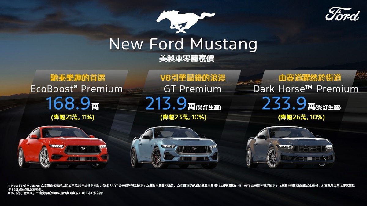 ※ 〔註一〕New Ford Mustang立享價自公布起立即適用於25年式指定車型。依據「ART 台美對等貿易協定」之美製車零關稅政策,立享價為提前反映美製車零關稅之優惠價格;待「ART 台美對等貿易協定」之美製車關稅政策正式生效後,本專案所適用之優惠價格將不另行調整或退還差額。