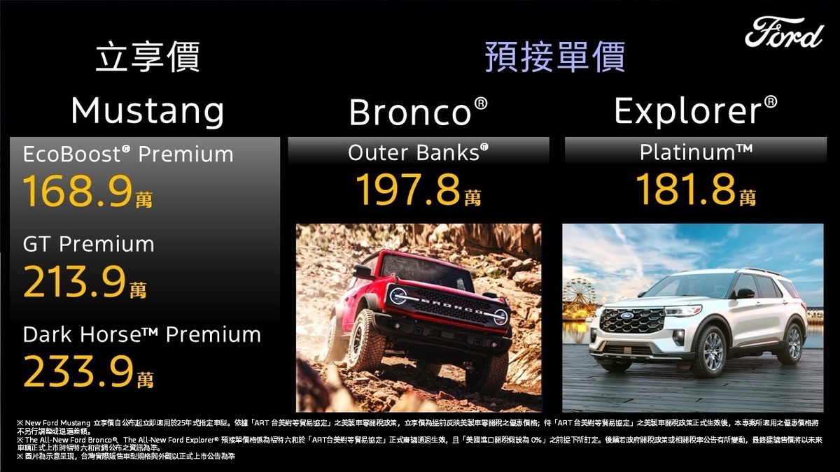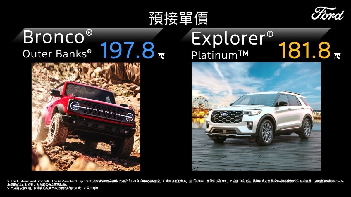 另一方面,Ford揭露首波導入熱銷全球市場的The All-New Ford Bronco® Outer Banks®與The All-New Ford Explorer® PlatinumTM,顯示其未來美製車導入台灣市場的戰略布局野心,並同步啟動預接作業。本次同步公布預接單參考價,其中The All-New Ford Bronco® Outer Banks®為197.8萬元、The All-New Ford Explorer® Platinum™為181.8萬元;前述價格係以零關稅條件提前進行試算,作為未來導入的重要參考基準〔註二〕;為回應市場的熱烈期盼,現階段消費者僅需支付部分定金5,000元(定金總額為10萬元),即可搶先預約車輛排序〔註三〕。如想了解更多訊息,歡迎至Ford 官方網站資訊頁留下聯繫資訊,Ford銷售顧問將與您聯繫、為您服務。福特六和誠摯邀請渴望突破框架的品味玩家,把握契機,以從容之姿,率先入主美式經典駕馭。
