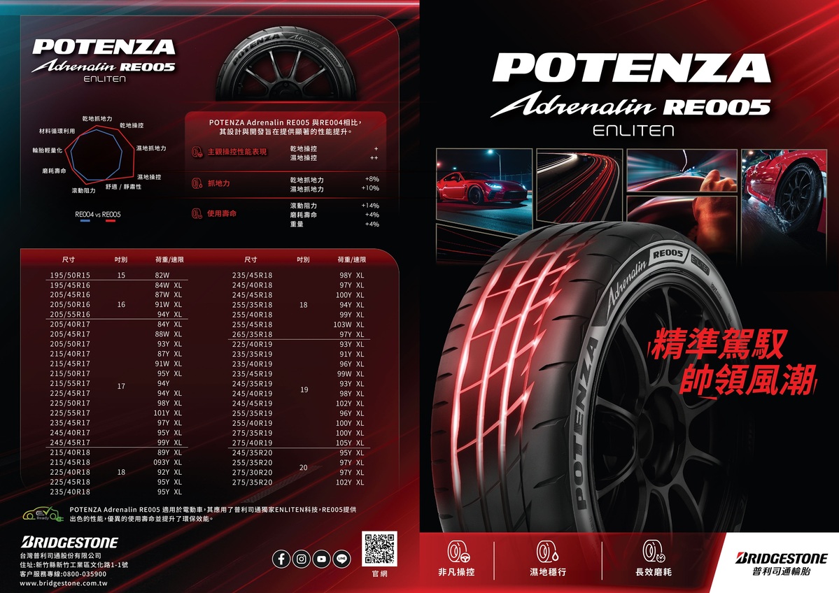 BRIDGESTONE POTENZA Adrenalin RE005 今於台灣市場提供 15 至 20 吋的多元選擇,適用於各種乘用車型,實際供應規格將依各通路而有所不同。
