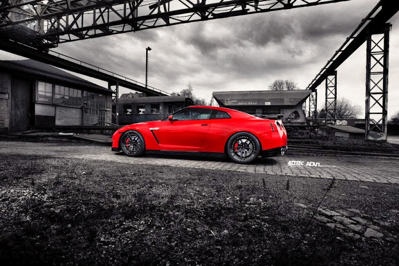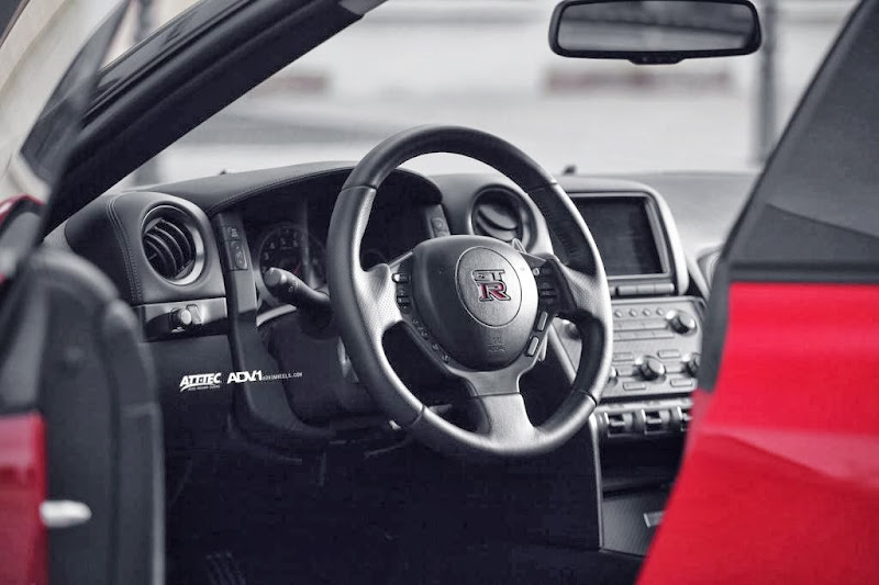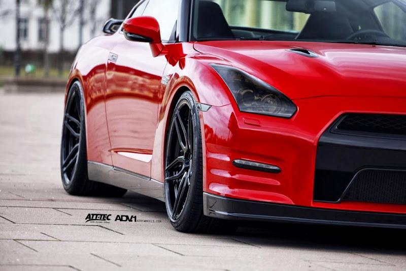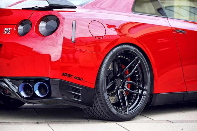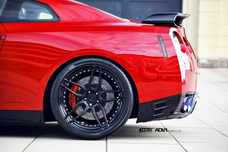 輪圈選用知名輪圈品牌ADV.1 Wheels出品、型號ADV005 MV2 SL的款式,並以亮黑色塗裝呈現,尺寸為前21x10.5J、後21x12.5J的配置。另外,為了增進這部紅色Nissan GTR的操控性,選用KW V3高低軟硬可調式避震器組,也同時將車身降低造就動感的視覺效果。
