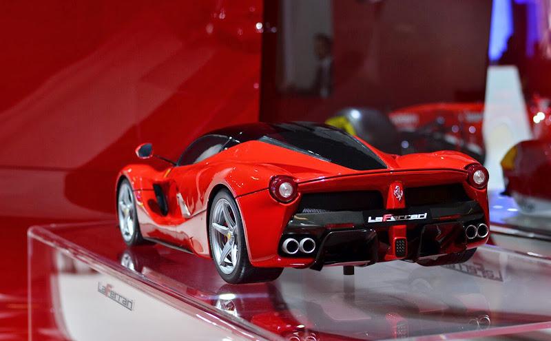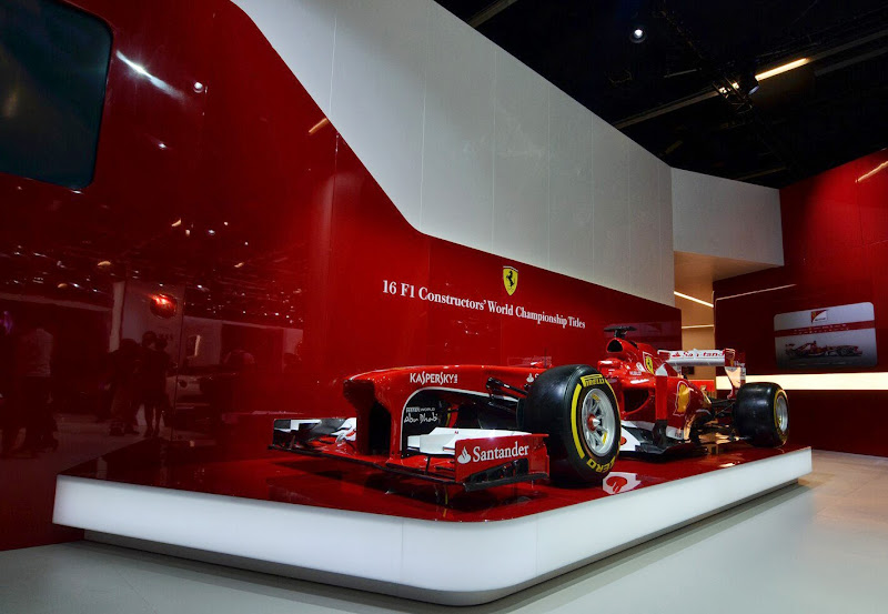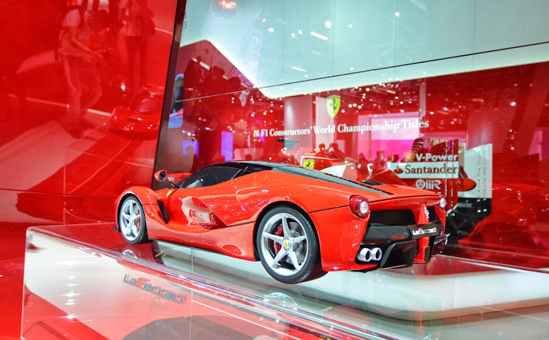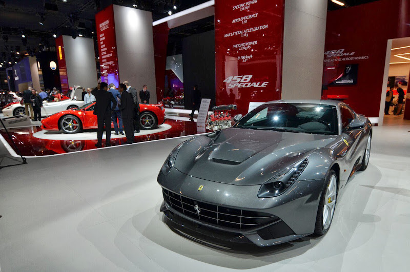 另外,Ferrari選擇了Grigio Silverstone鐵灰色塗裝的Ferrari F12 Berlinetta、Nero Pastello黑色塗裝的Ferrari 458 Spider與Bianco Avus白色塗裝的Ferrari California擔綱演出;有 " The Best Shooting Brake " 美名的Ferrari FF則是以優雅的Rosso Mugello酒紅色塗裝出現,終極油電混合超級跑車Ferrari LaFerrari則是以模型車的形式現身,另外搭配F1賽車陳列展示。誠然,今年Ferrari展示區的人氣王,理當非Ferrari 458 Speciale莫屬!