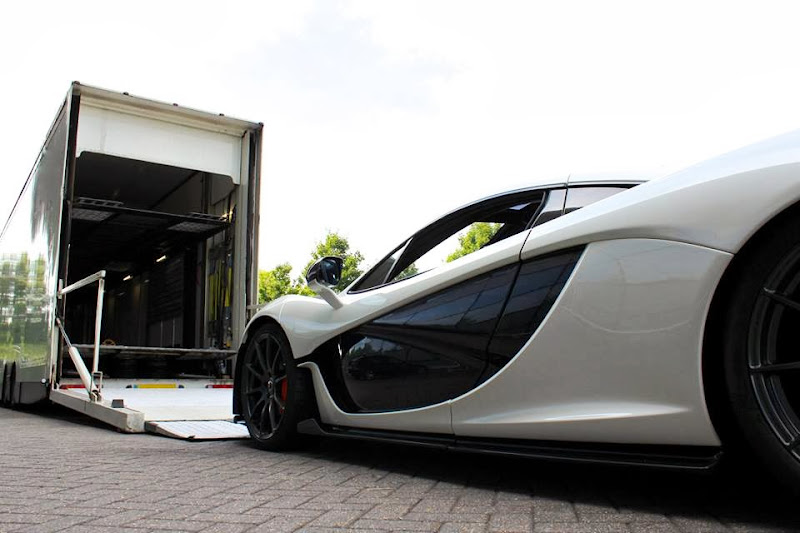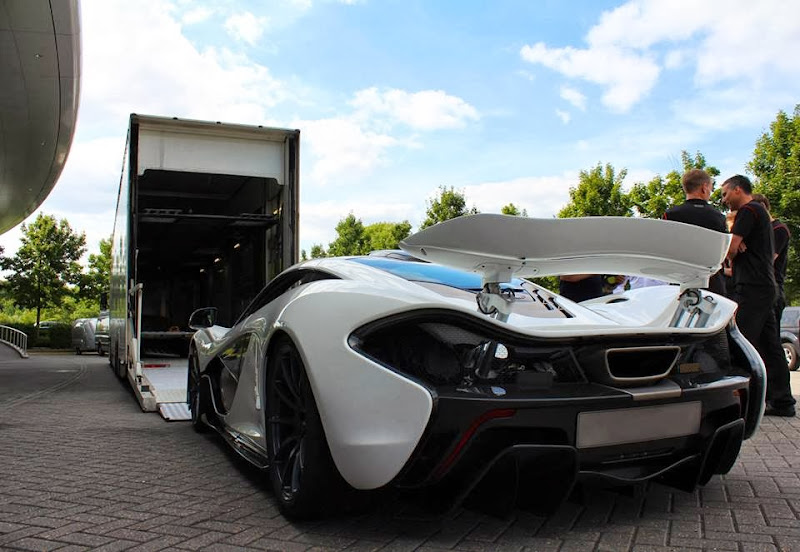 經銷商的合約才剛簽訂完成,眼前這部珍珠白色塗裝的McLaren P1便已經準備要運往大陸。McLaren P1身為McLaren最新、最強悍車款,搭載3.8升雙渦輪增壓八缸引擎與電動馬達,以油電混合動力之姿,達到916HP的最大綜效馬力,百里加速3秒內,而在德國(Germany)紐柏林賽道(Nurburgring)中更是繳出七分內的成績。這些照片是國外媒體於英國McLaren科技總部(McLaren Technology Center)外所拍攝,而相信不久之後,這部油電混合超級跑車便會在內地出現。