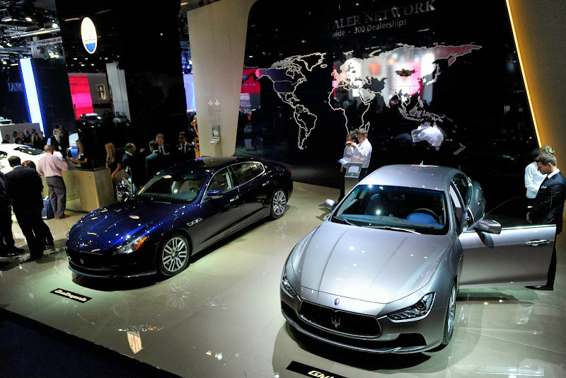 這次車展中,Maserati展示了多部最新不同版本的車款,包含全新款式的Maserati Quattroporte兩部、中型車款Maserati Ghibli與最新式樣的Maserati Gran Turismo MC Stradale。