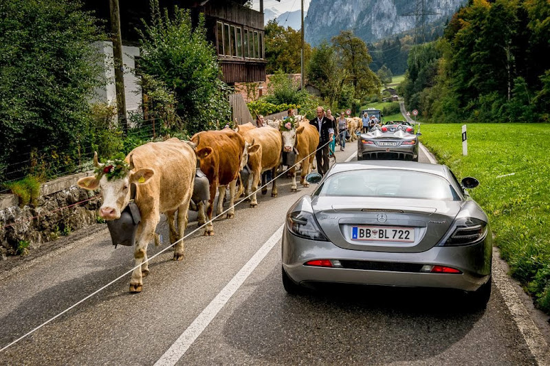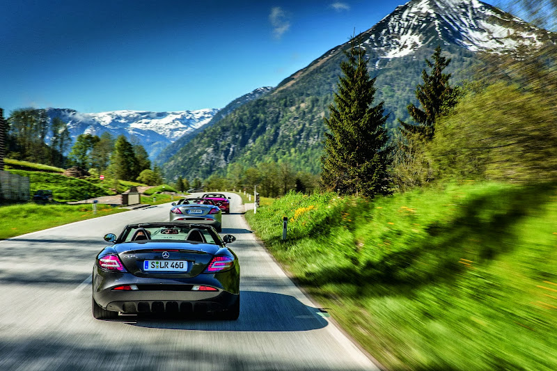 2003年的時候,德國Mercedes Benz與英國超級跑車廠McLaren聯手推出絕世美型的Mercedes Benz SLR McLaren,其中SLR三個英文字母乃Sport Light Racing的縮寫,七年間總共生產約3,500部。發表這款跑車之時,Mercedes Benz集團擁有McLaren大約40%的股份,也是促成這項經典合作案的主要原因之一。時至今日,要在路上目睹Mercedes Benz SLR McLaren風采的機率並不大,更不用說是一群SLR車隊,尤其是場景拉到瑞士(Swiss)的鄉間小路時。