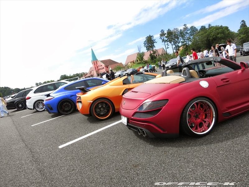 由於Office-K所操刀改裝過的車款數量非常多,而其中有許多車主乃收藏等級的玩家,所以現場來了超過100部各式改裝車款,無論新舊,大都將保存得相當完好。另外,由於Office-K為數個知名品牌的重要經銷商,所以現場彷彿戶外的東京改裝車展般,出席的包含兩部LB Performance寬車體版本的Lamborghini Murcielago LP640、少見的紅色塗裝Lamborghini Aventador LP700-4、全車Hamann完整式樣的Mercedes Benz SLS AMG Hawk Roadster、Ferrari 458 Spider、全車Techart精品的Porsche 997 Turbo、經典跑車Mercedes Benz SLR McLaren與中型頂級豪華轎車Rolls-Royce Ghost等。