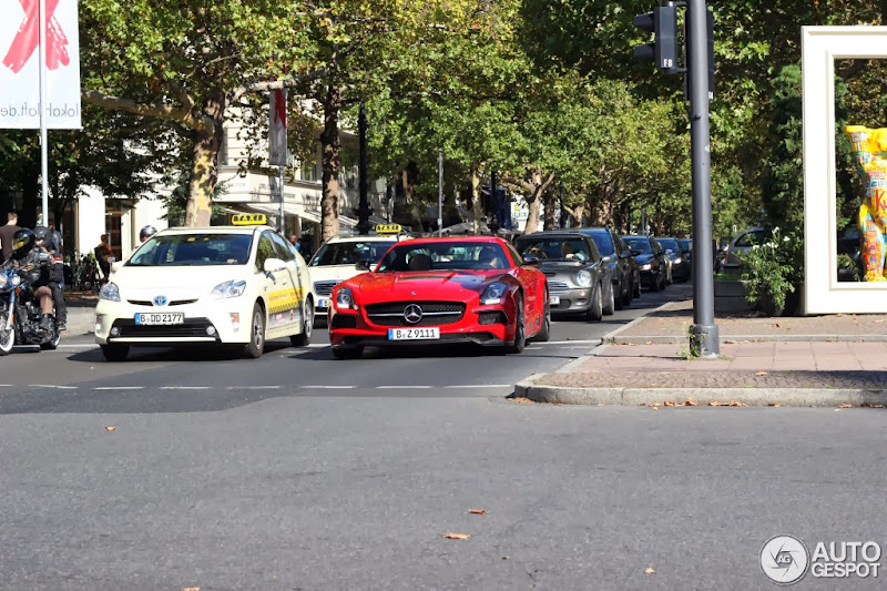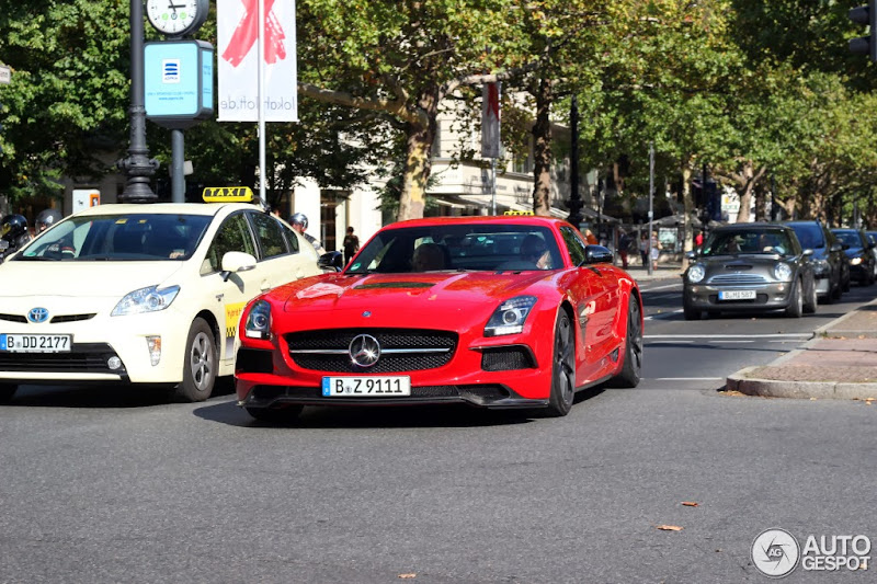 哪個國家的計程車有紅色的? 香港、日本、新加坡與美國都有可能,但是把紅色Mercedes Benz當家超級跑車SLS AMG當作計程車的應該罕見至極,更不用說是進階版本的SLS AMG Black Series! 親愛的朋友們,你們沒看錯,由來自德國(German)網友於知名網站Autogespot提供的這張照片中可以看到,火紅色的SLS AMG Black Series在等紅綠燈時與身旁的計程車並停,在某個角度看去好像車頂裝有計程車頂燈,的確是照片開了一個小玩笑,見此我們也不得不介紹一下這部目前Mercedes Benz量產車生產線中的最速車款。