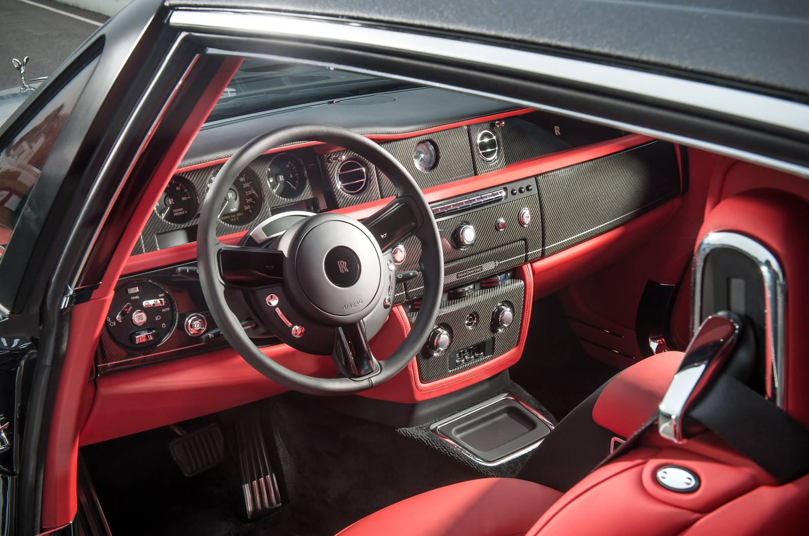 除了車身外觀以外,內裝部分,2014 Rolls-Royce Phantom Bespoke Chicane Coupe更是捨棄常見的頂級木紋飾板而採用與賽道風格相匹配的碳纖維飾板與紅黑雙色真皮內裝,同時在座椅部分繡上專屬國旗徽飾,而門檻也有專屬銘板以示尊榮身分。