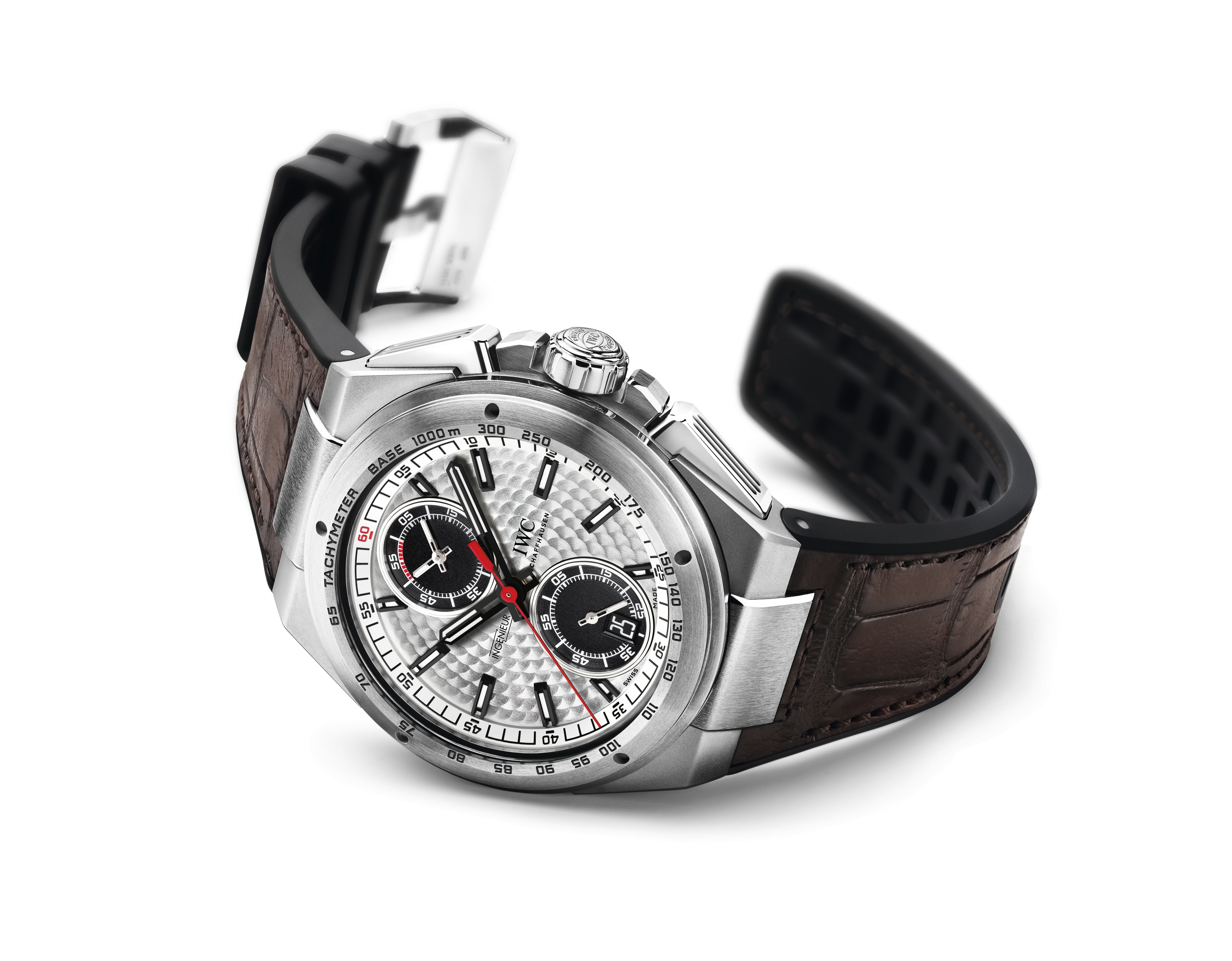 動力強勁的IWC萬國錶自製89361型機芯是當今高級鐘錶的最佳作品之一。記錄的小時和分鐘可如同讀取錶盤時間一樣在小錶盤上輕鬆讀取。中間的秒針則測量一分鐘以內的計時時間。借助這一功能還可在測速刻度上以1000米為參照距離測量速度。對於賽道上的所有人員來說,利用飛返功能,在比賽中測量進站時間也十分簡便易行。只需按下歸零按鈕,計時指針即可歸零並可隨即開始新的計時。這樣一來就可以節省終止、歸零、啟動三個複雜步驟。經進一步改良的比勒頓上鏈系統在短時間內可積累長達68小時的動力儲備。它的雙棘爪自動上鏈機制的效能比阿爾伯特•比勒頓的設計高出30%——一個想必會令這位天才發明家頜首稱讚的進步。此外,走時速率既不會受到計時干擾,也不會受到飛返功能的影響。
