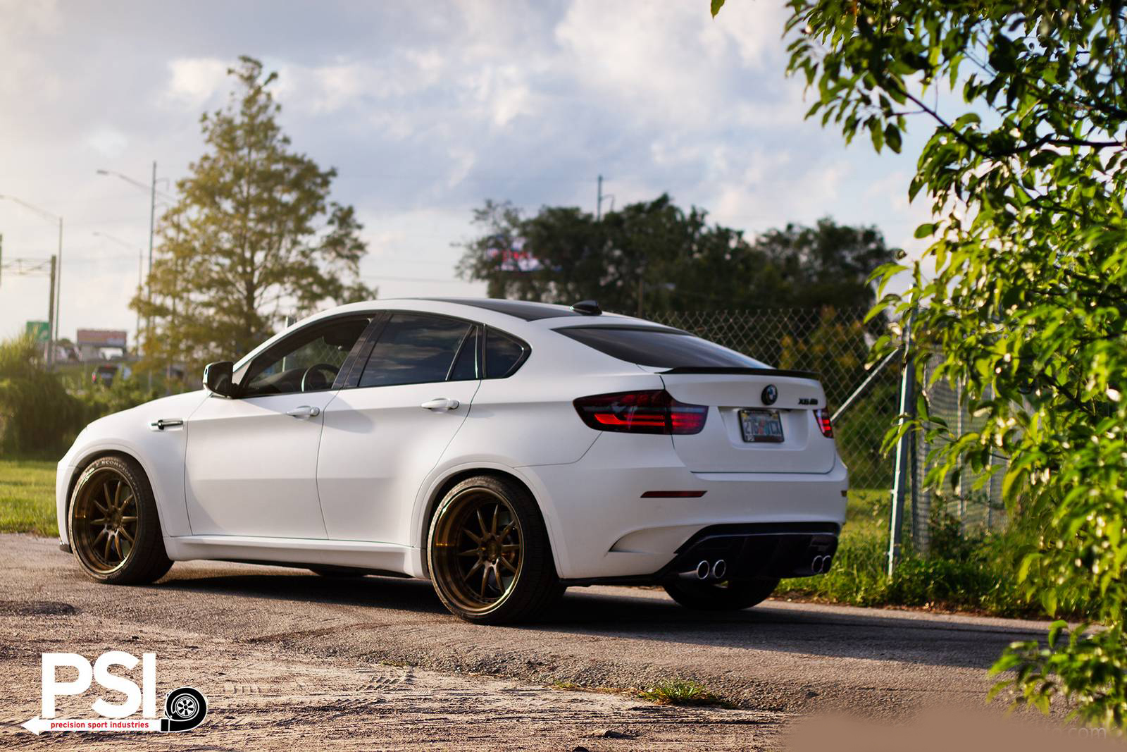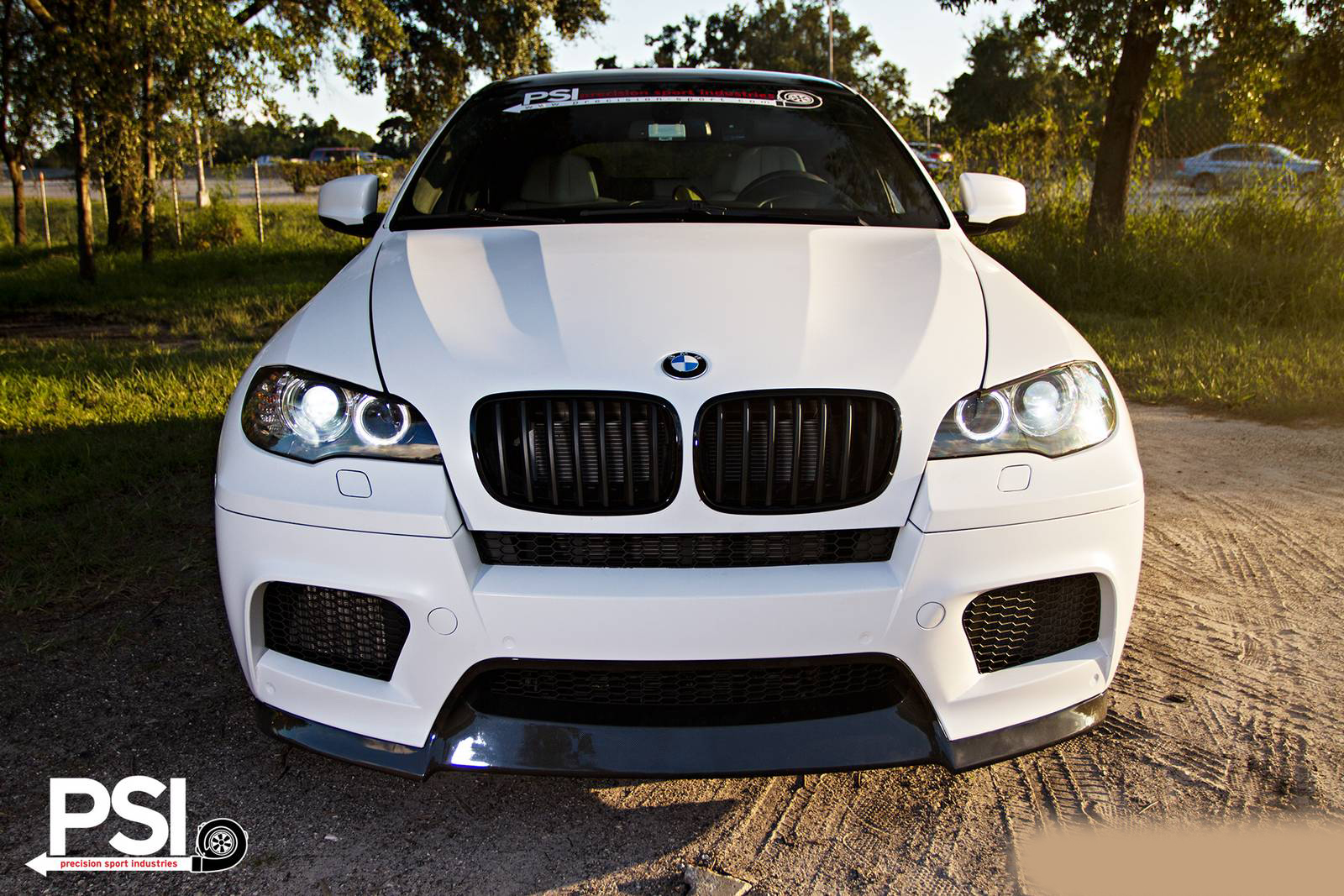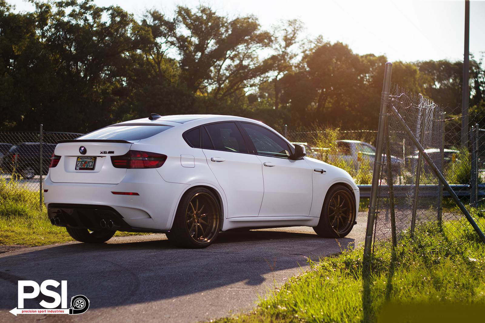 BMW X6 M絕對是一輛巨大、深具力量的車輛,在路上開著她,也很少會遇見相似之車款,Precision Motor Sports在他身上進行了雙渦輪增壓的工程以及賦予她更深的侵略性。 從外觀談起,其全車車體外觀採用完整的碳纖維套件包覆,此些空力套件設計來自於Vorsteiner,包括前後保險桿以及分流器,全車包括非套件處都使用白色3M塗料,搭配上22吋ADV10銅色輪框,黑色的部份則是使用Vorsteiner碳纖維套件,像是前氣壩以及前保險桿,客製化OEM BMW車尾燈也使用燻黑設計,與其他部分的黑色點綴相呼應。