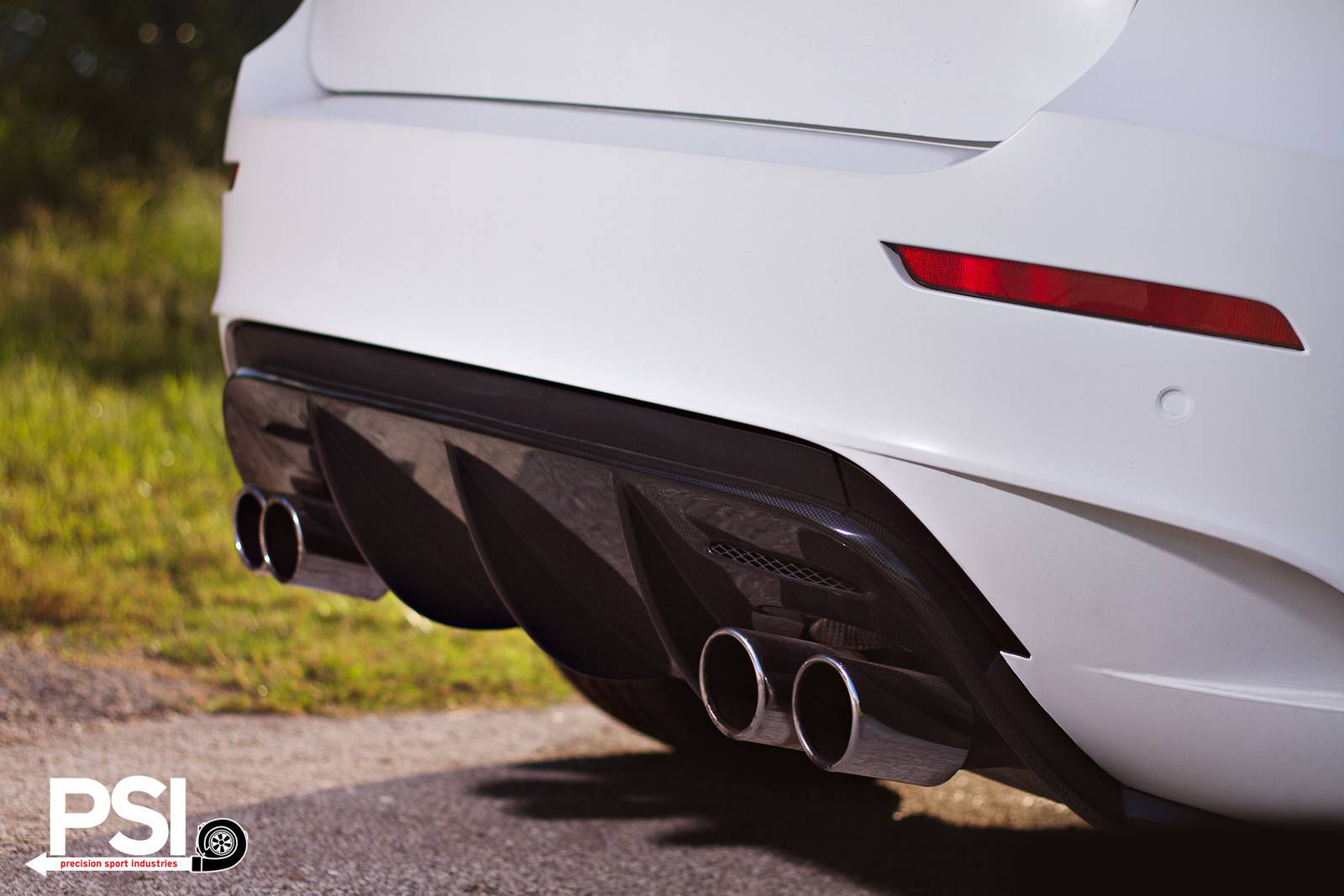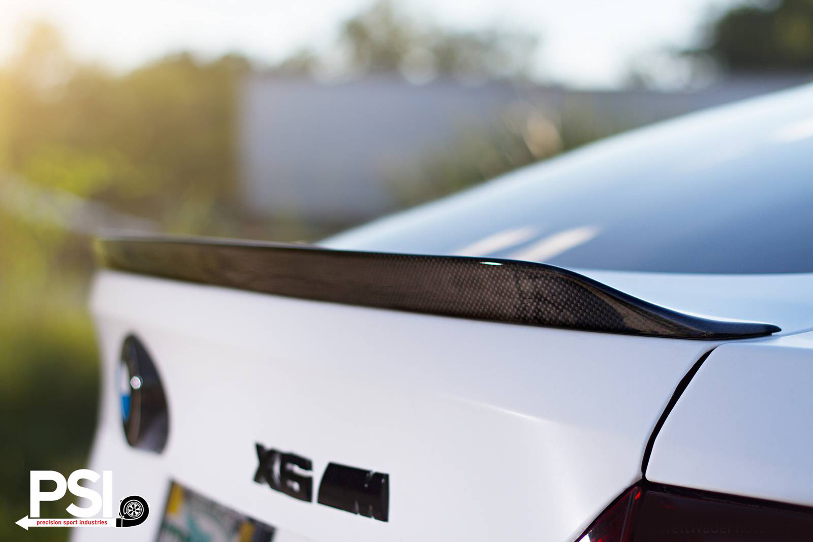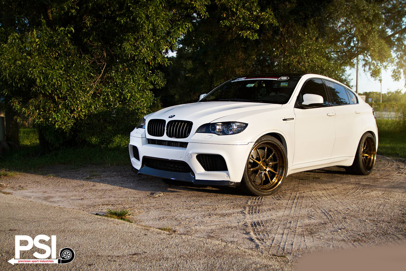 BMW X6 M絕對是一輛巨大、深具力量的車輛,在路上開著她,也很少會遇見相似之車款,Precision Motor Sports在他身上進行了雙渦輪增壓的工程以及賦予她更深的侵略性。 從外觀談起,其全車車體外觀採用完整的碳纖維套件包覆,此些空力套件設計來自於Vorsteiner,包括前後保險桿以及分流器,全車包括非套件處都使用白色3M塗料,搭配上22吋ADV10銅色輪框,黑色的部份則是使用Vorsteiner碳纖維套件,像是前氣壩以及前保險桿,客製化OEM BMW車尾燈也使用燻黑設計,與其他部分的黑色點綴相呼應。
