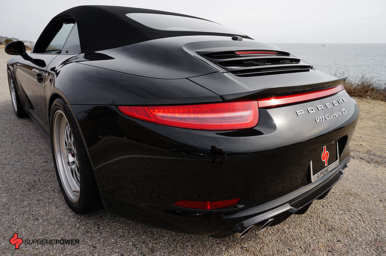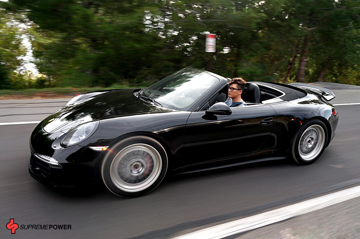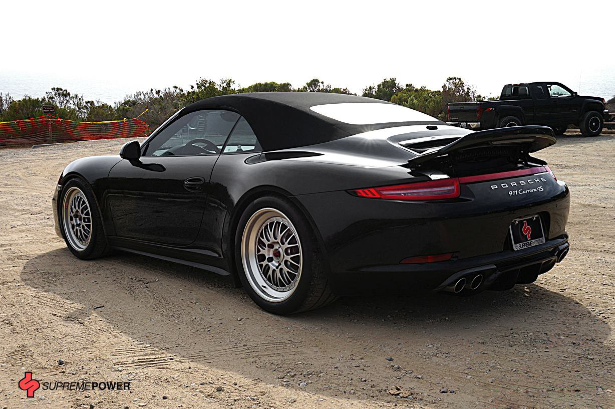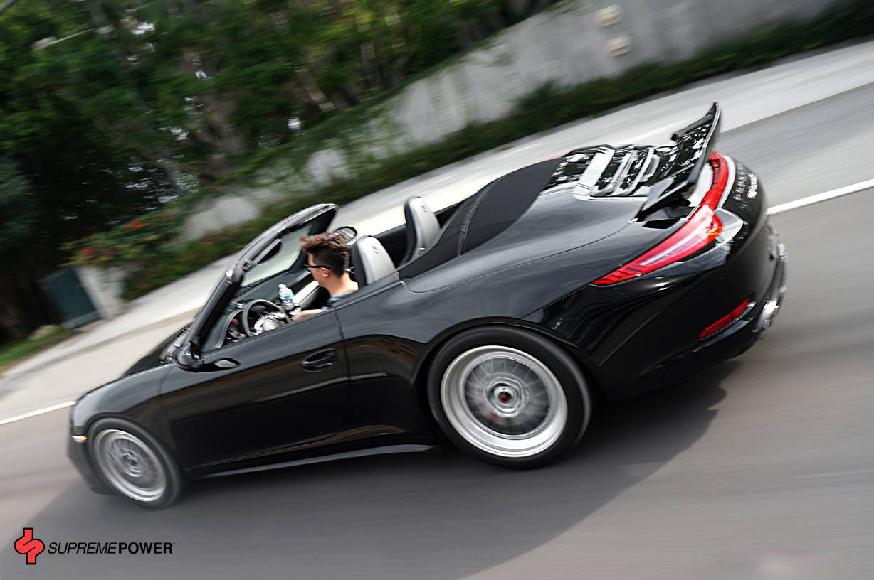 本文主角的這部黑色Porsche 991 Carrera 4S Cabrio的另外一個特色便是裝著經典的BBS多片式輪圈,搭配扁平比較高的跑胎,同時透過換裝H&R短彈簧將車身降低,散發出獨特的復古風味。Porsche 991 Carrera 4S Cabrio搭載3.8升自然進氣、水平對臥六缸引擎,最大馬力為400HP,改裝廠Supreme Power目前暫時維持原廠設定。