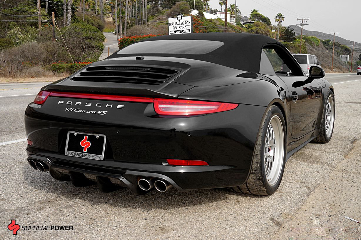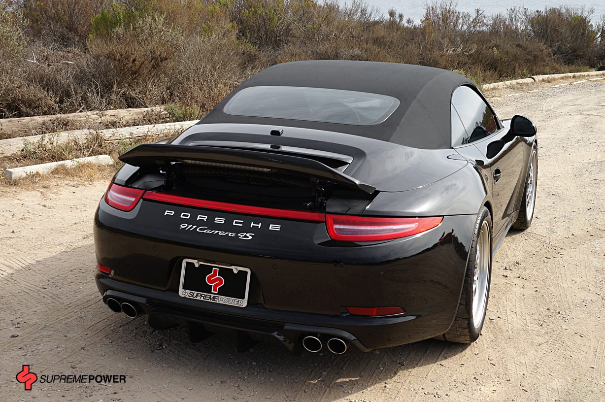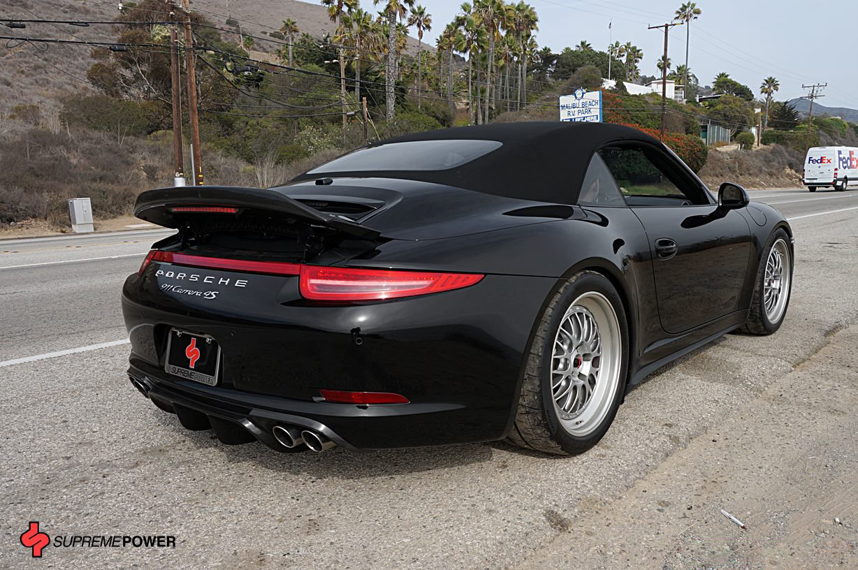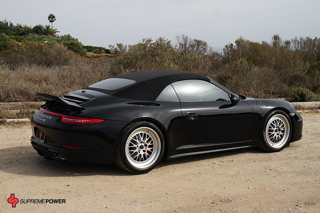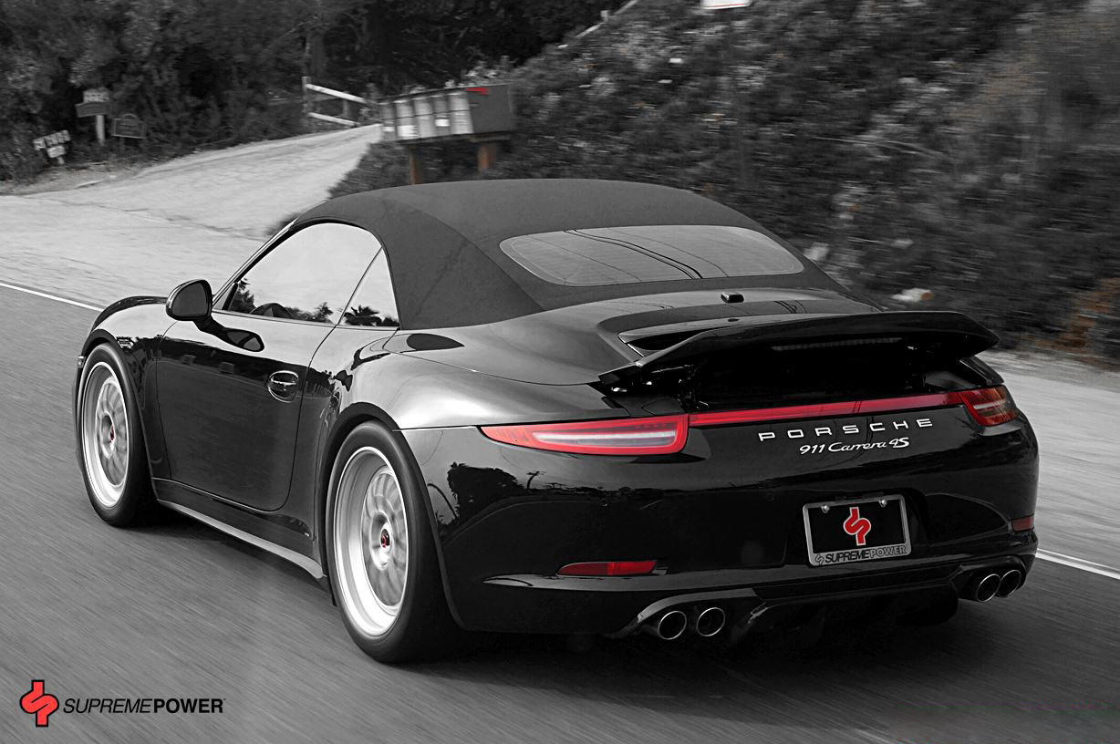 本文主角的這部黑色Porsche 991 Carrera 4S Cabrio的另外一個特色便是裝著經典的BBS多片式輪圈,搭配扁平比較高的跑胎,同時透過換裝H&R短彈簧將車身降低,散發出獨特的復古風味。Porsche 991 Carrera 4S Cabrio搭載3.8升自然進氣、水平對臥六缸引擎,最大馬力為400HP,改裝廠Supreme Power目前暫時維持原廠設定。
