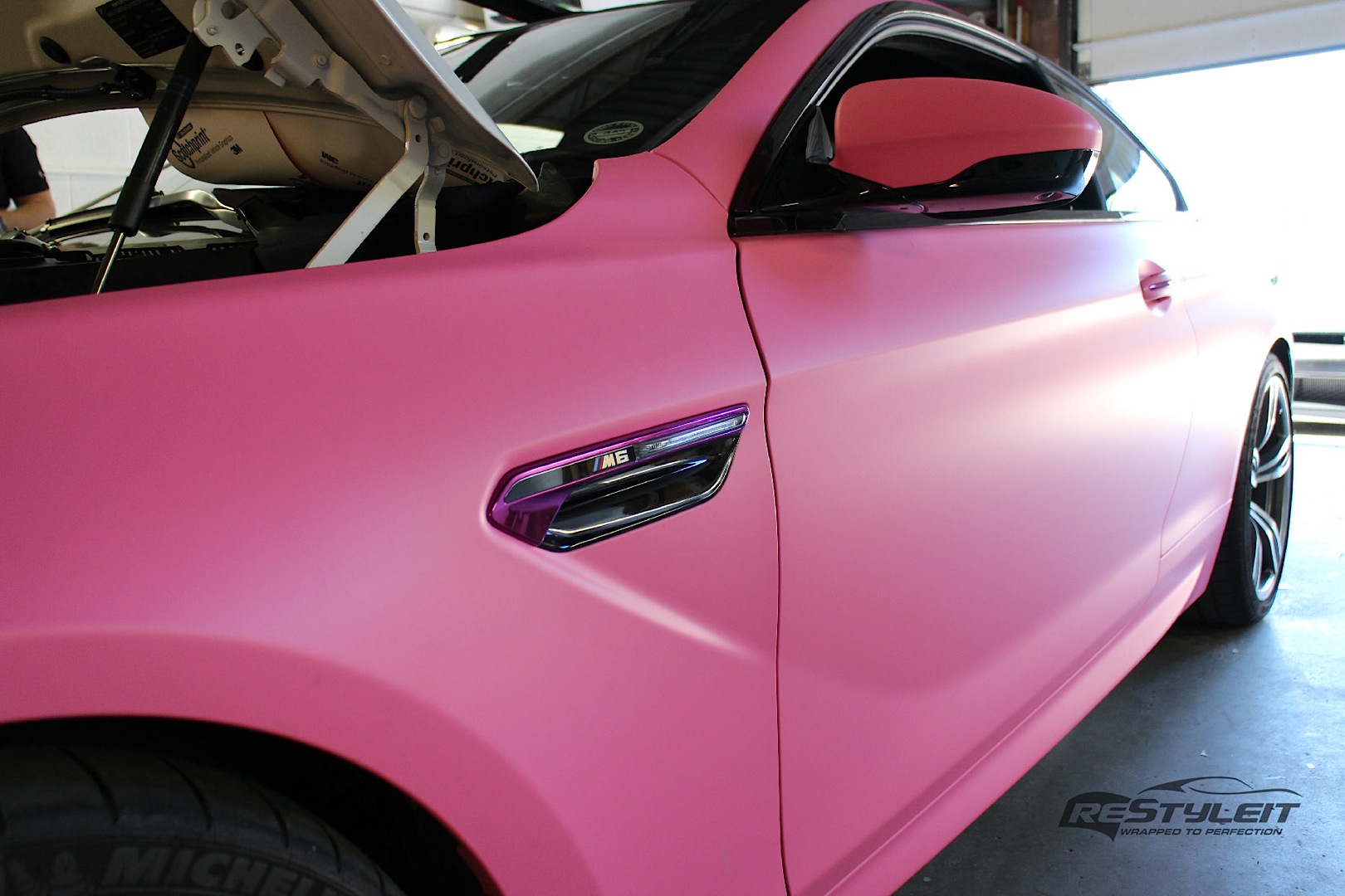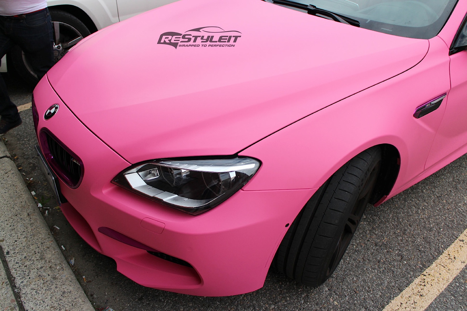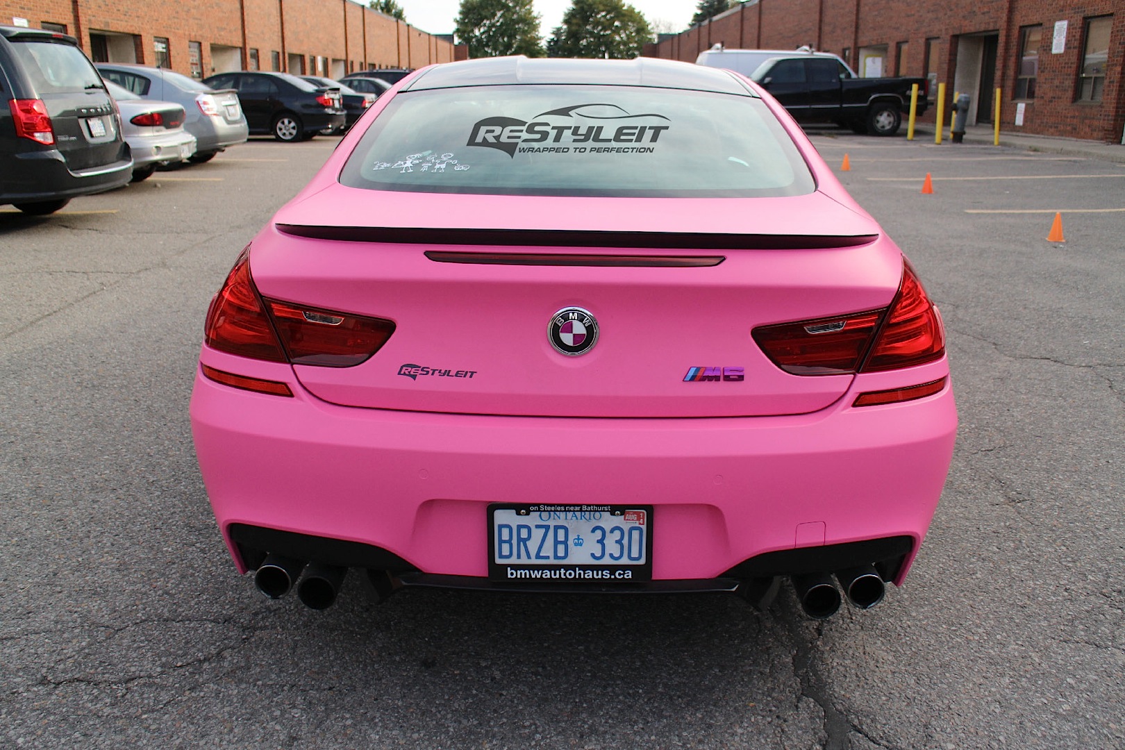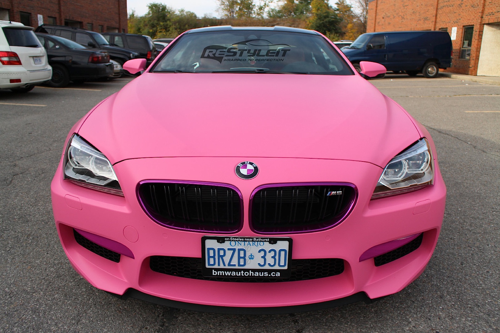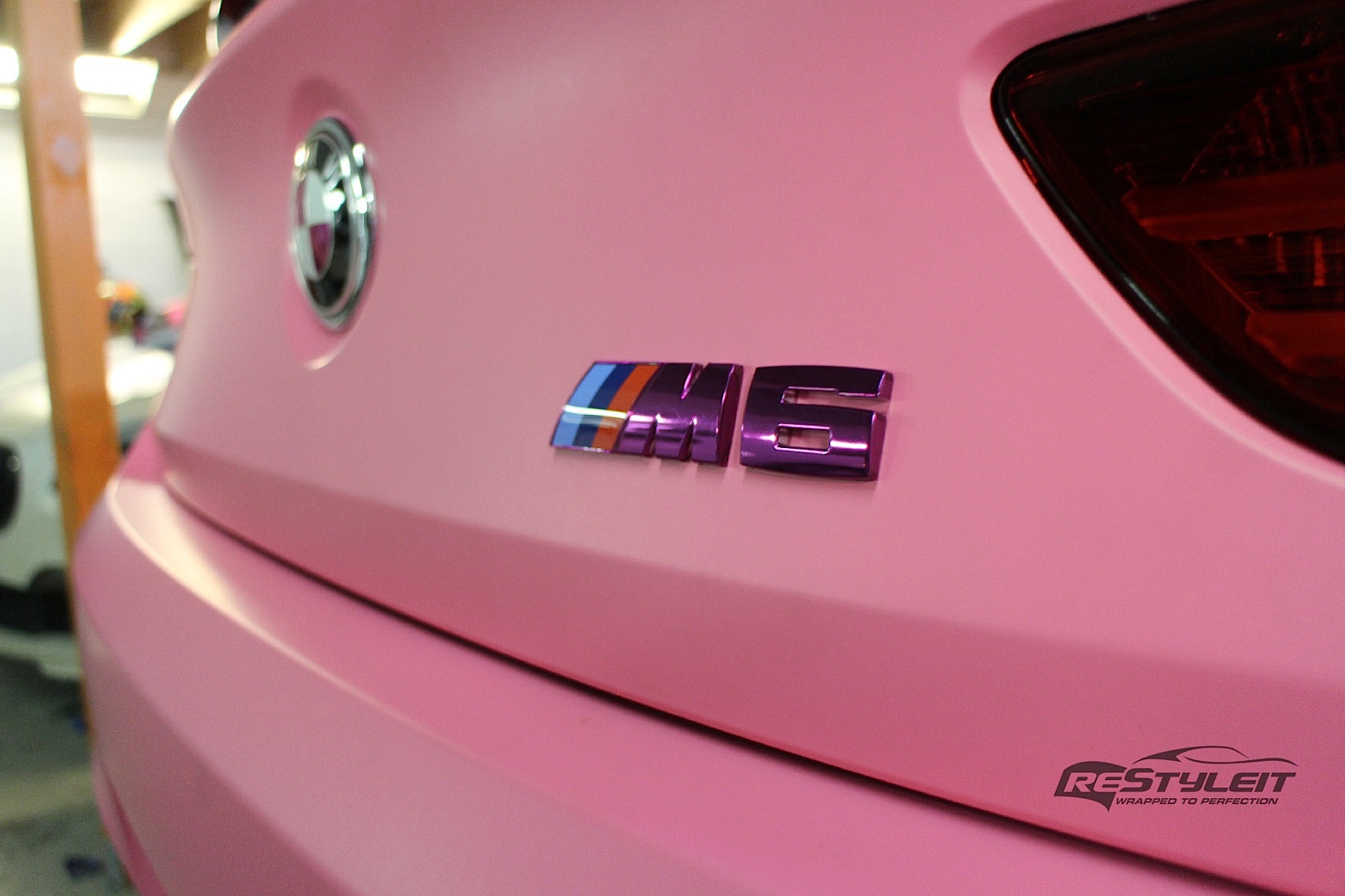世上真的無奇不有,老天爺給了人類無限制的創意與七情六慾,於生活的各種層面中混合出五顏六色,車子也不例外。除了Lamborghini等超級跑車有時會以螢光綠色、橘色等亮眼顏色出現外,Ferrari則往往以常見的Rosso Scuderia紅色出現,放眼車壇,其餘大部分性能車款在原廠選配的清單中都將過於奇特的顏色排除在外。然而,今天要帶給各位的是一部全車被貼成消光粉紅色的BMW F13 M6,水箱罩周圍、葉子板進氣孔飾蓋、門把飾板與後行李箱BMW銘牌等處則是施以電鍍紫色處理。