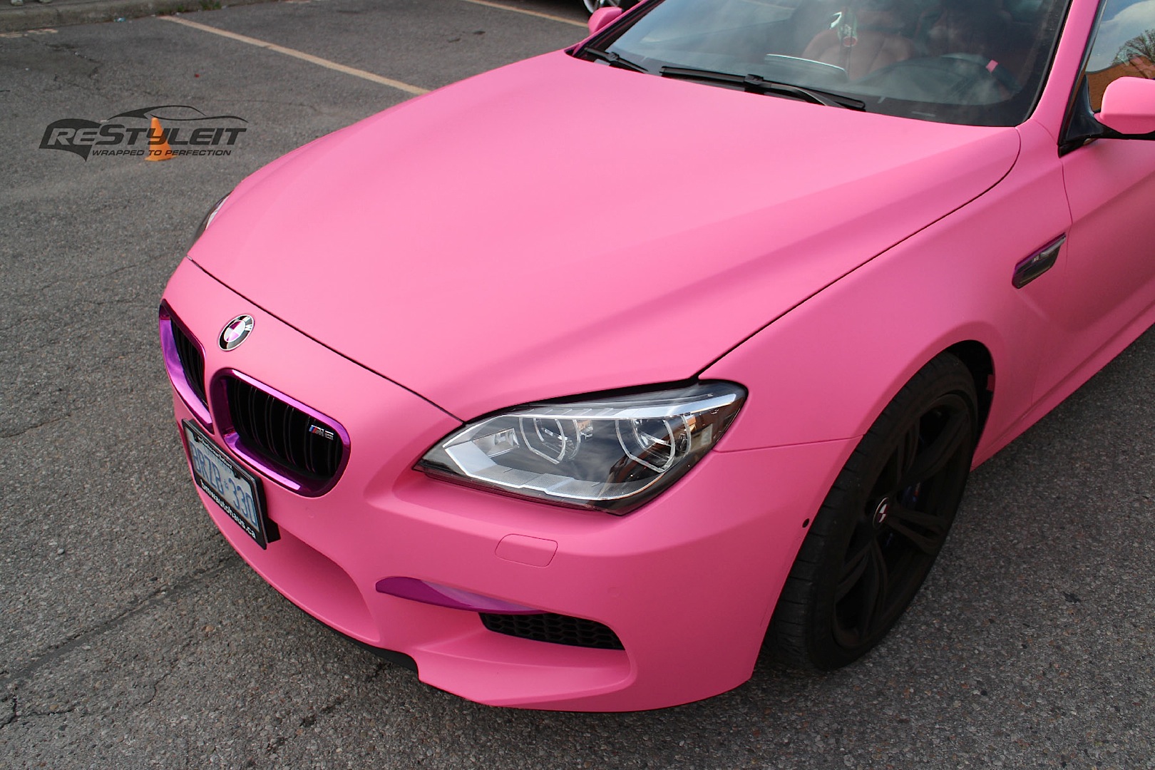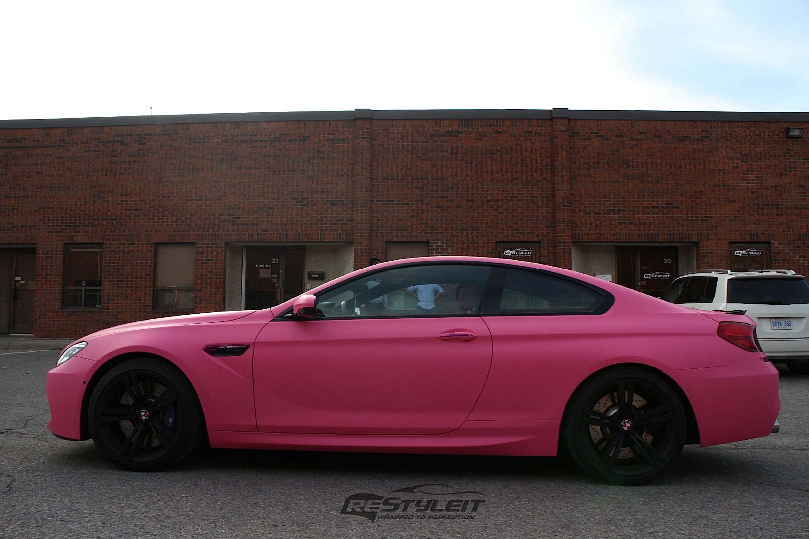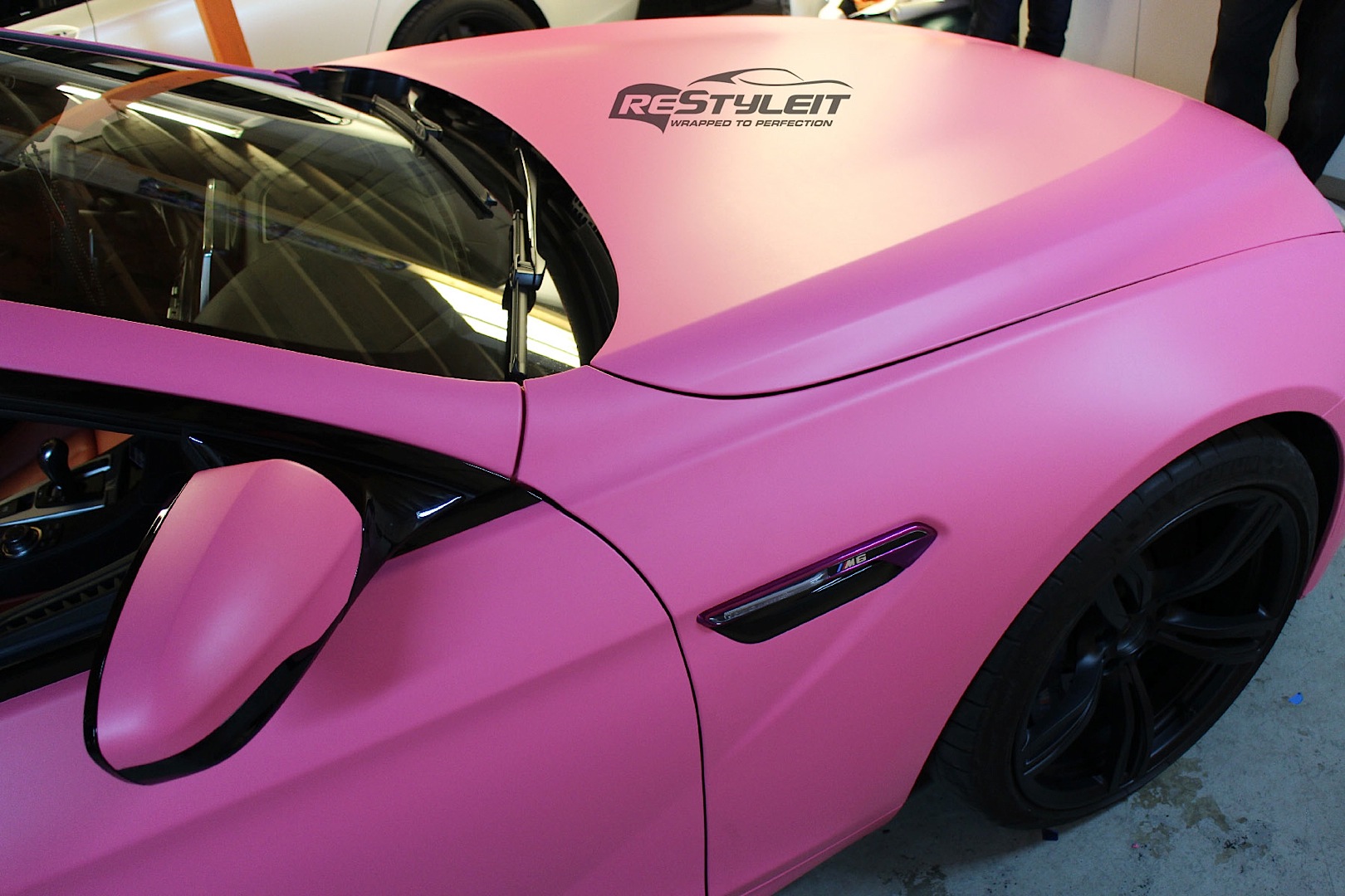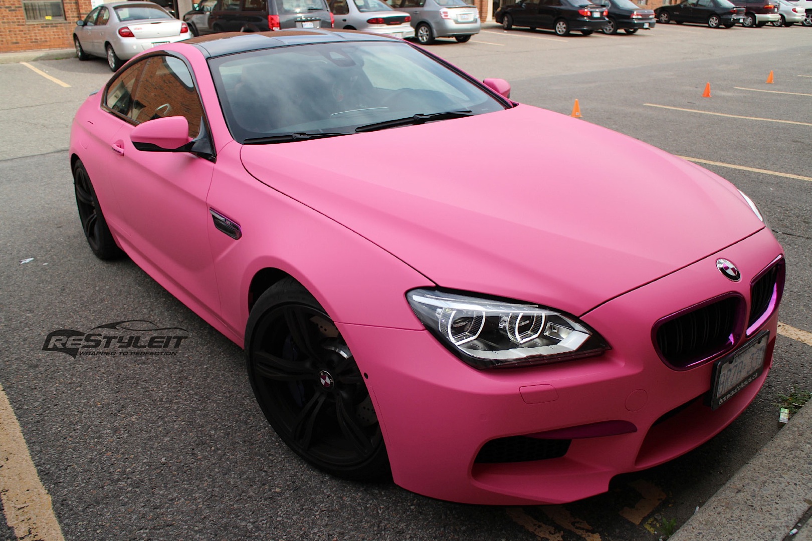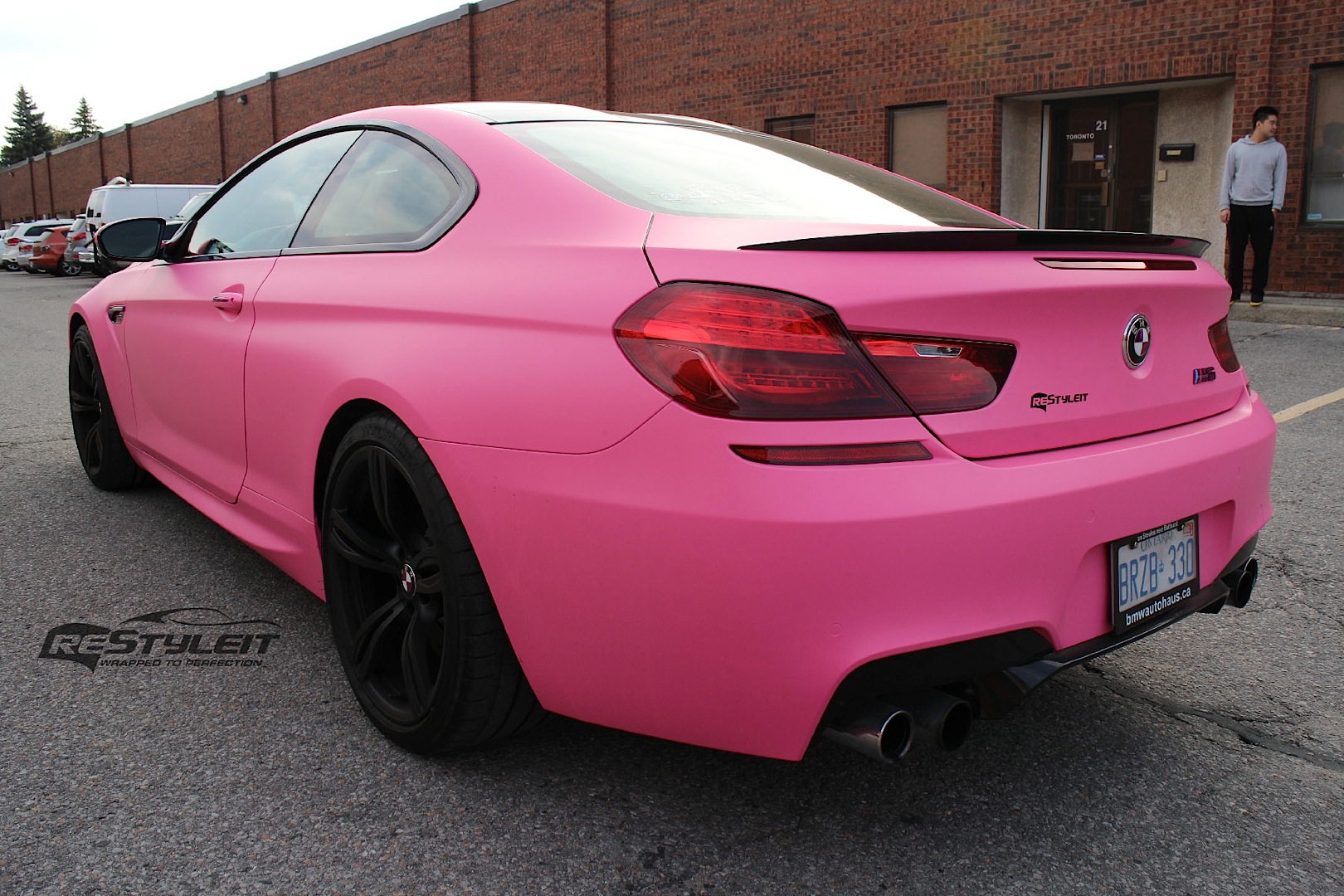 世上真的無奇不有,老天爺給了人類無限制的創意與七情六慾,於生活的各種層面中混合出五顏六色,車子也不例外。除了Lamborghini等超級跑車有時會以螢光綠色、橘色等亮眼顏色出現外,Ferrari則往往以常見的Rosso Scuderia紅色出現,放眼車壇,其餘大部分性能車款在原廠選配的清單中都將過於奇特的顏色排除在外。然而,今天要帶給各位的是一部全車被貼成消光粉紅色的BMW F13 M6,水箱罩周圍、葉子板進氣孔飾蓋、門把飾板與後行李箱BMW銘牌等處則是施以電鍍紫色處理。