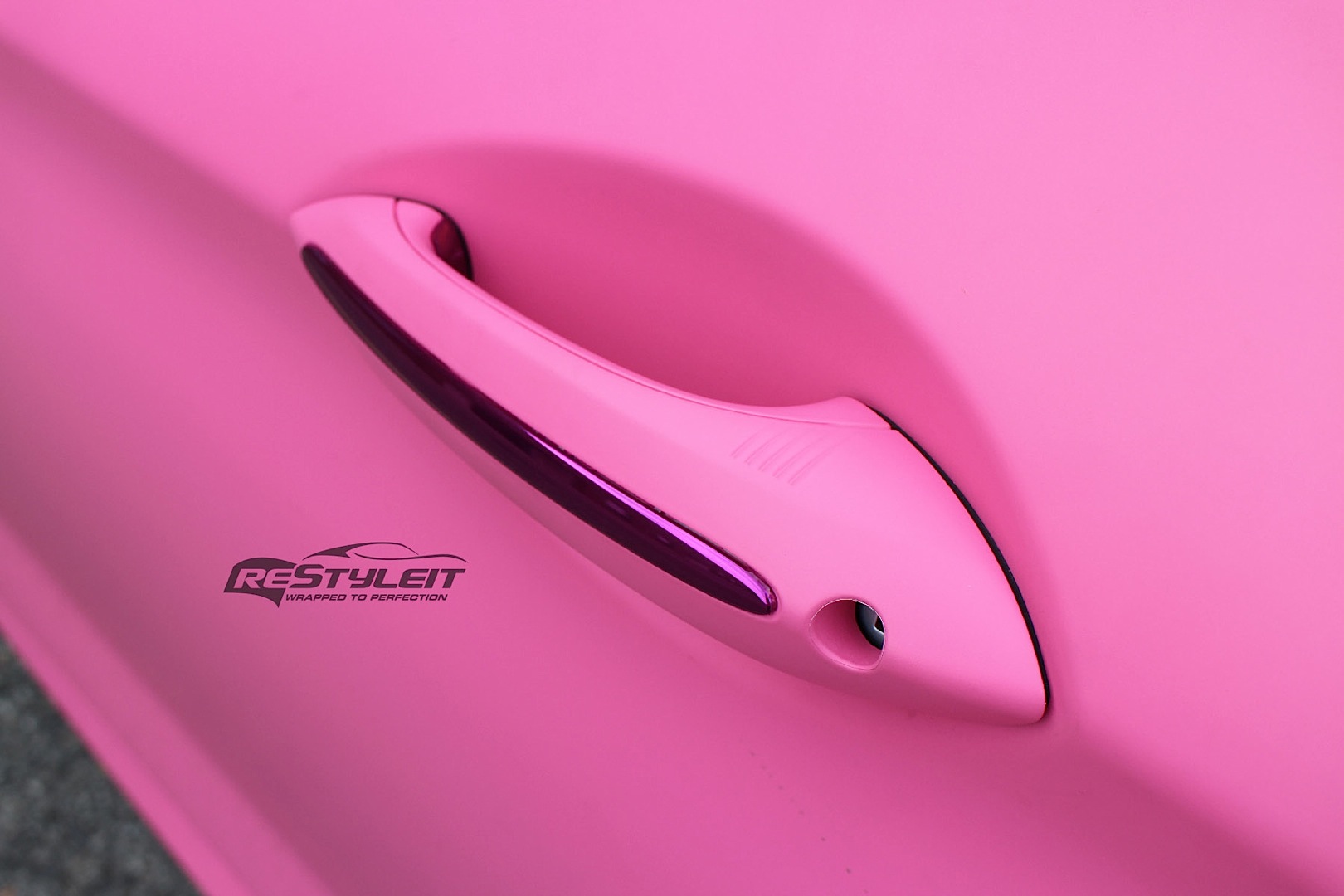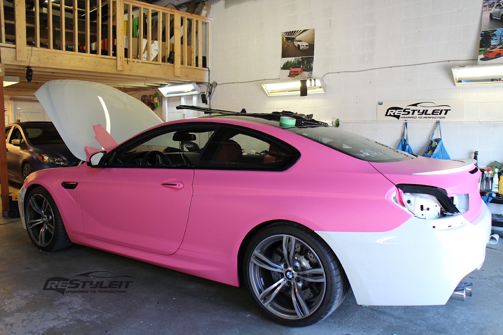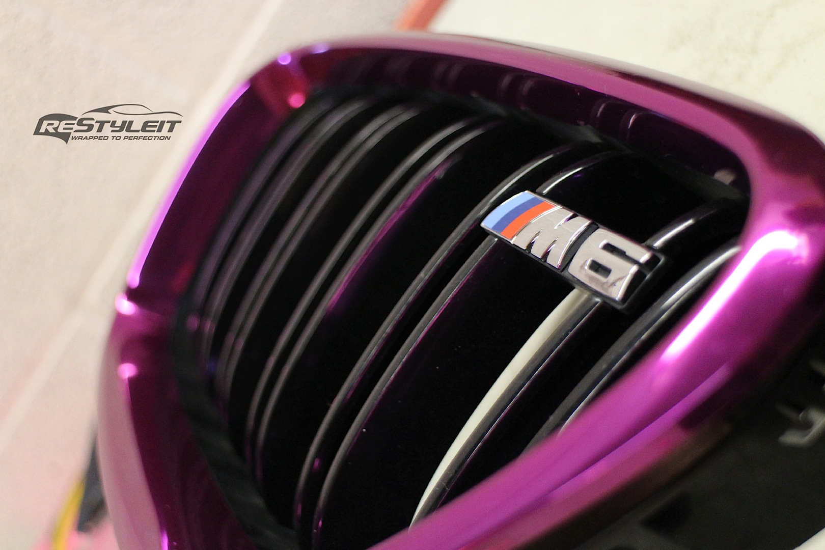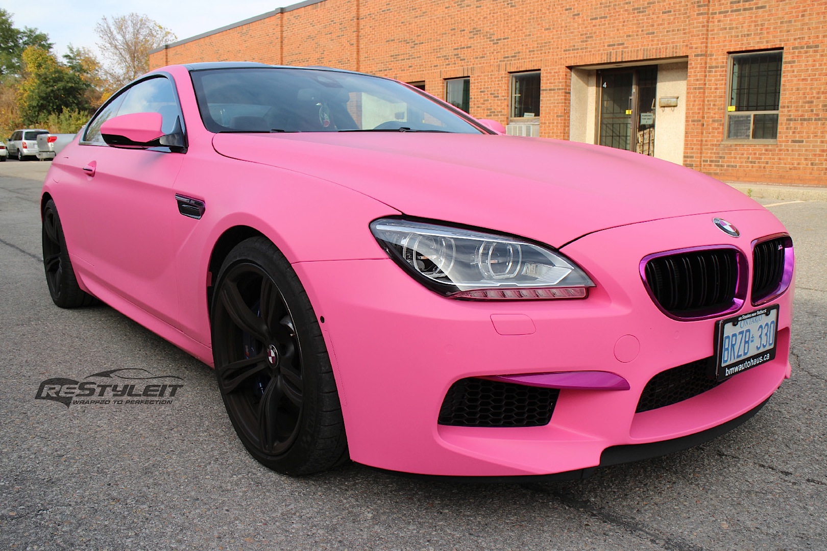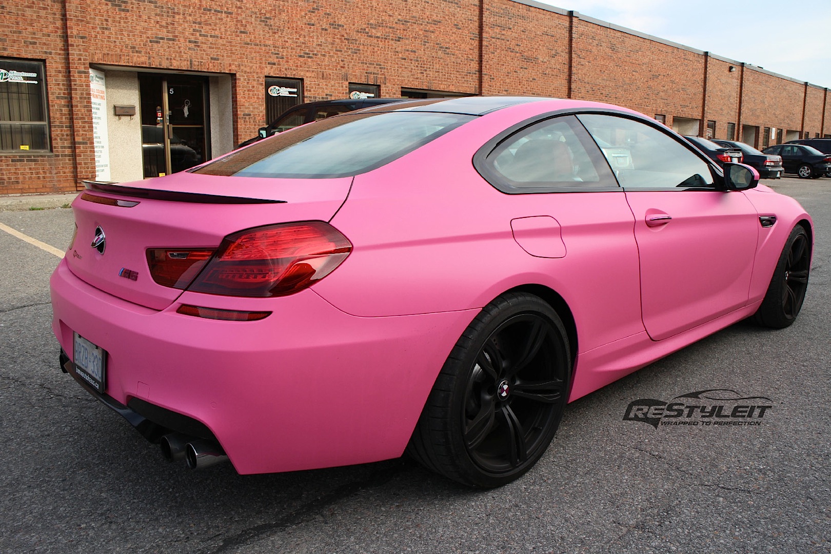世上真的無奇不有,老天爺給了人類無限制的創意與七情六慾,於生活的各種層面中混合出五顏六色,車子也不例外。除了Lamborghini等超級跑車有時會以螢光綠色、橘色等亮眼顏色出現外,Ferrari則往往以常見的Rosso Scuderia紅色出現,放眼車壇,其餘大部分性能車款在原廠選配的清單中都將過於奇特的顏色排除在外。然而,今天要帶給各位的是一部全車被貼成消光粉紅色的BMW F13 M6,水箱罩周圍、葉子板進氣孔飾蓋、門把飾板與後行李箱BMW銘牌等處則是施以電鍍紫色處理。