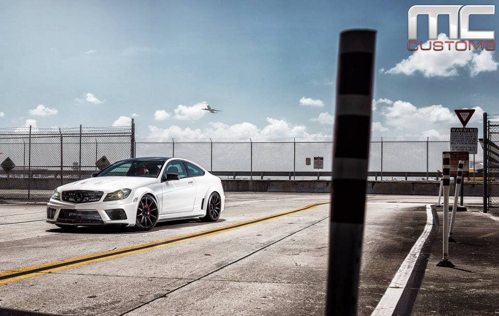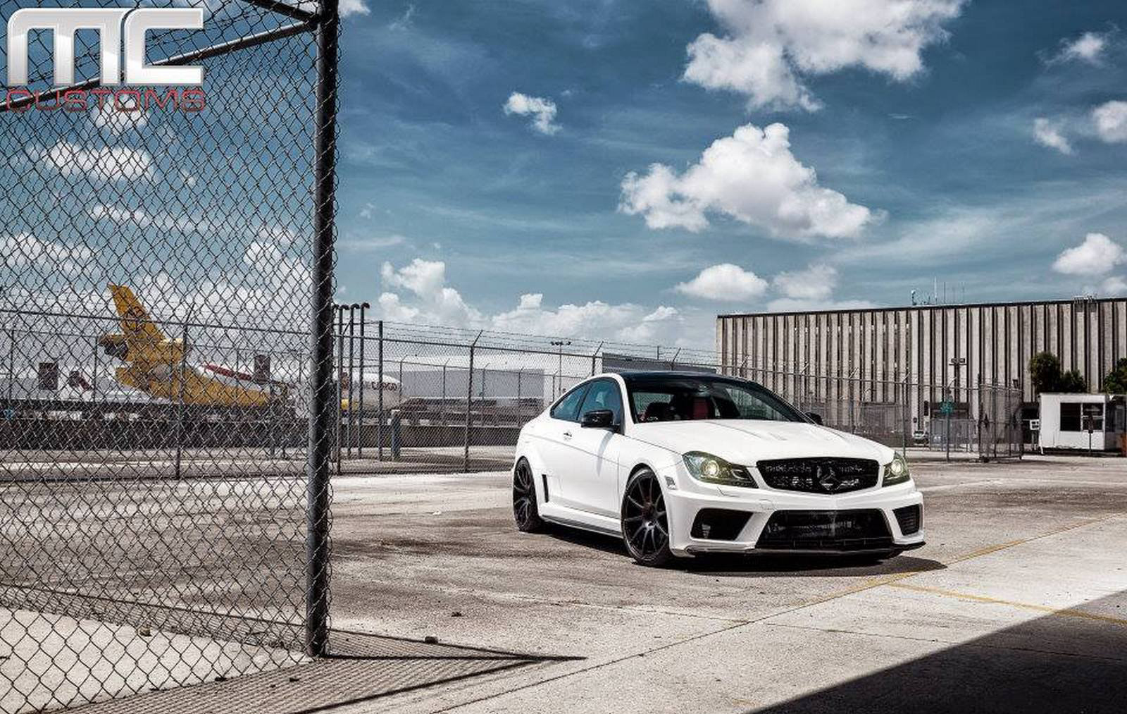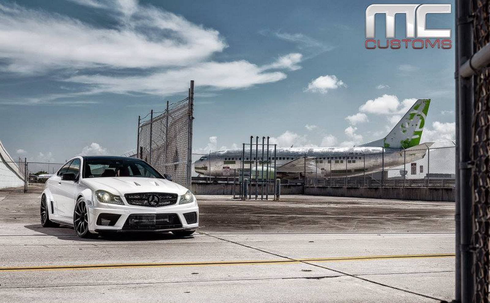 今天要帶給各位的是由改裝廠MC Customs所操刀改裝的Mercedes Benz C63 AMG Black Series,用上名廠Mode Carbon所生產的碳纖維空力配件,包含重新設計的後下擾流板與後鴨尾翼等,另外選用Rennen鍛造輪圈並且透過避震器的換裝將車身降低、凸顯爆龜輪弧的魅力。