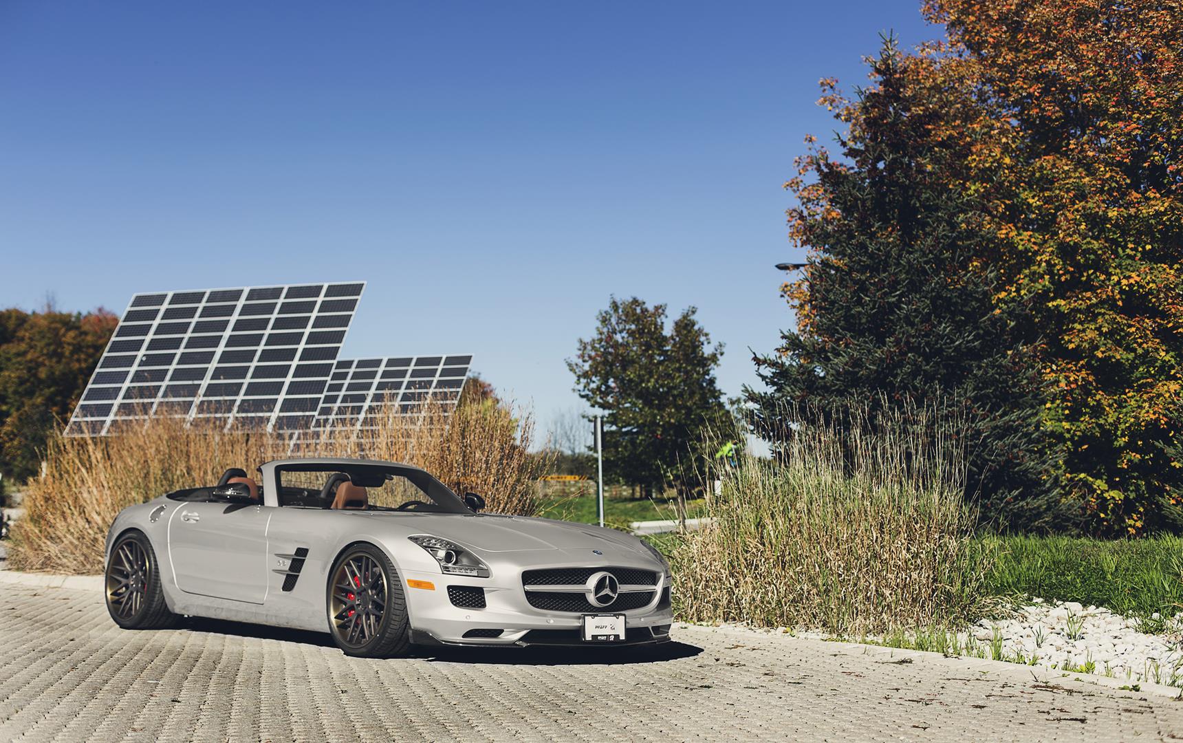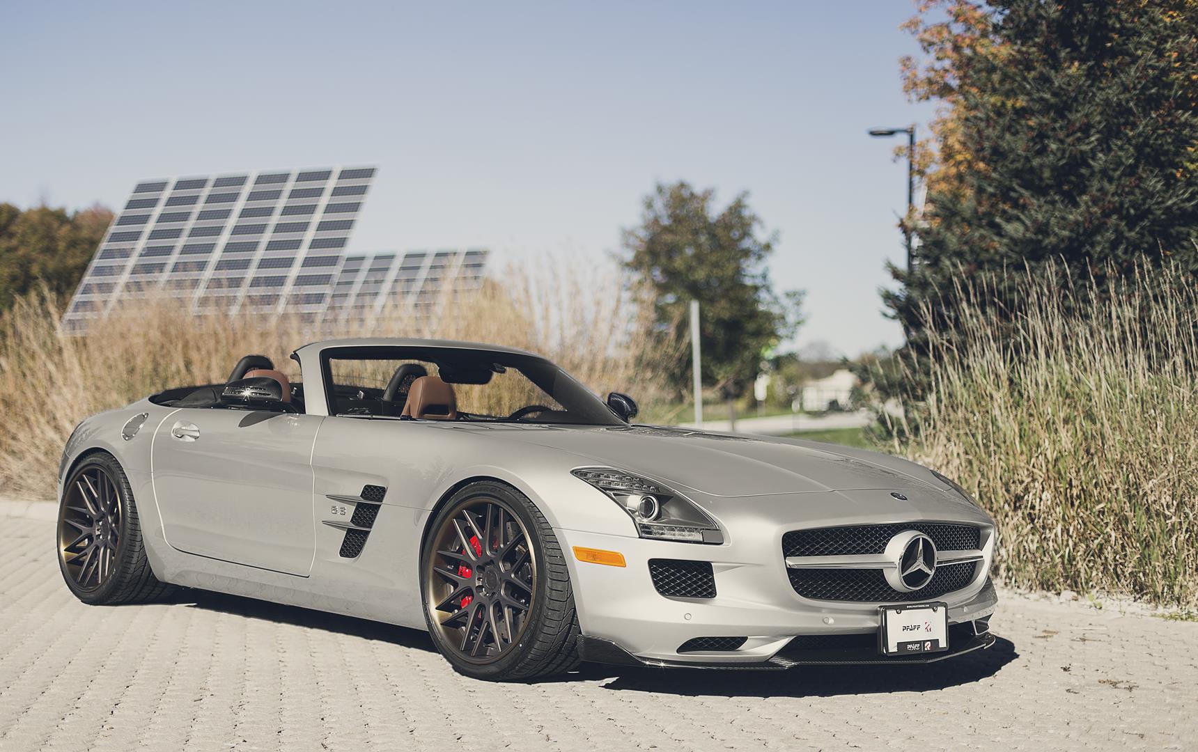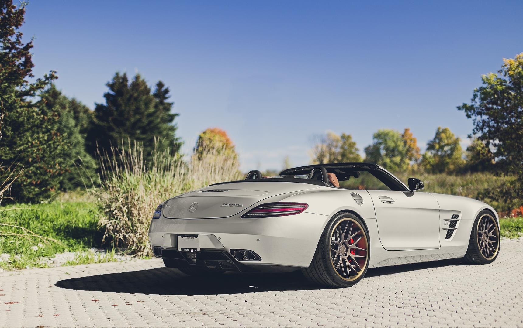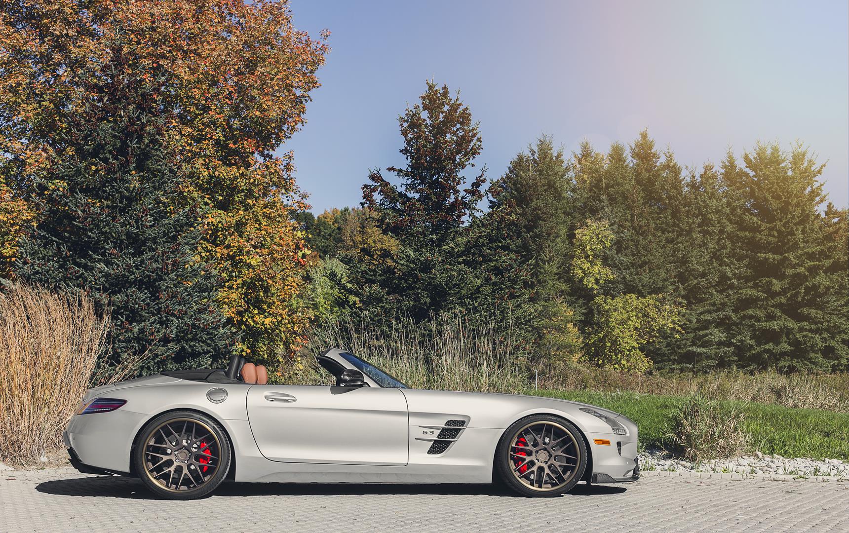 今天帶給各位的是由改裝廠Pfaff Tuning所操刀的Mercedes Benz SLS AMG Roadster敞篷車款,換裝H&R短彈簧、Renntech碳纖維後下擾流板與前下巴,另外選用知名品牌ADV.1 Wheels出品、型號ADV8的內凹款式輪圈,圈面採用特殊的消光銅色塗裝,尺寸為前20x10J、後21x12J。動力部分,Pfaff Tuning使用Renntech電腦程式、頭段排氣管與Akrapovic Evolution鈦合金中尾排氣管,將那具6.2升V8自然進氣引擎發揮得更徹底。