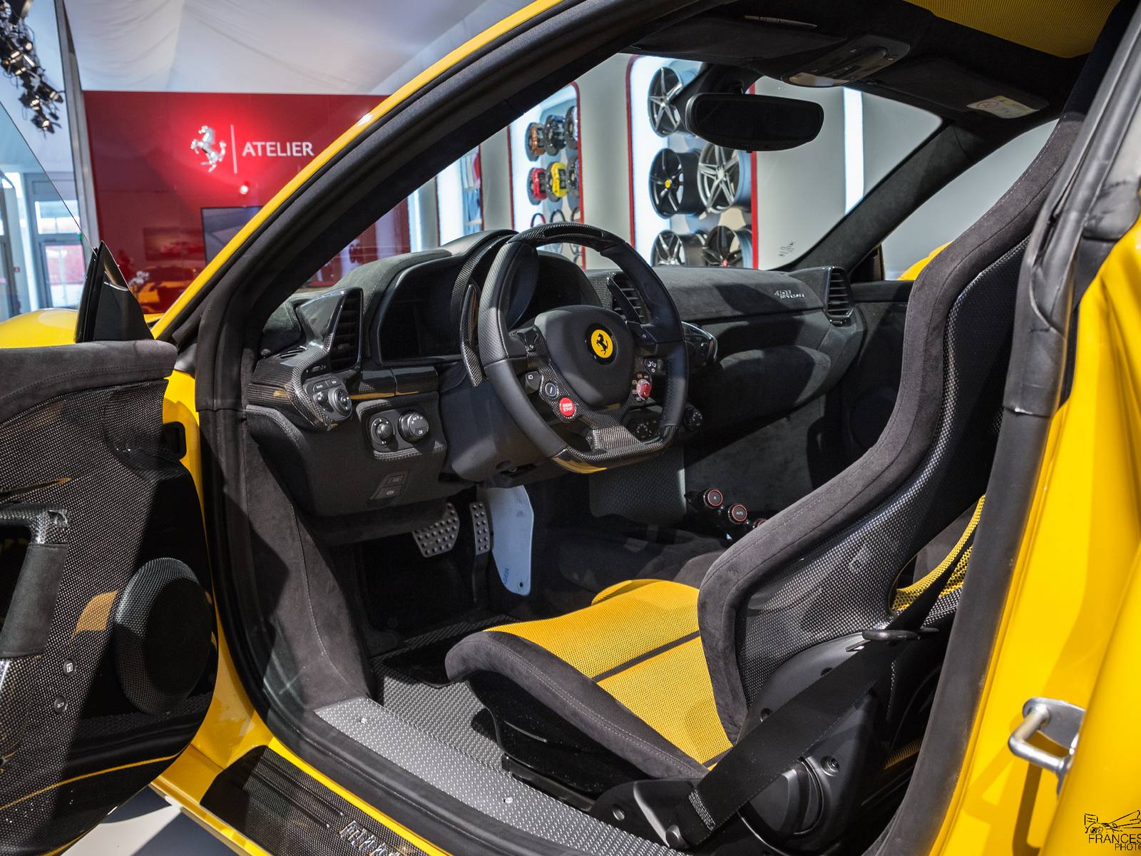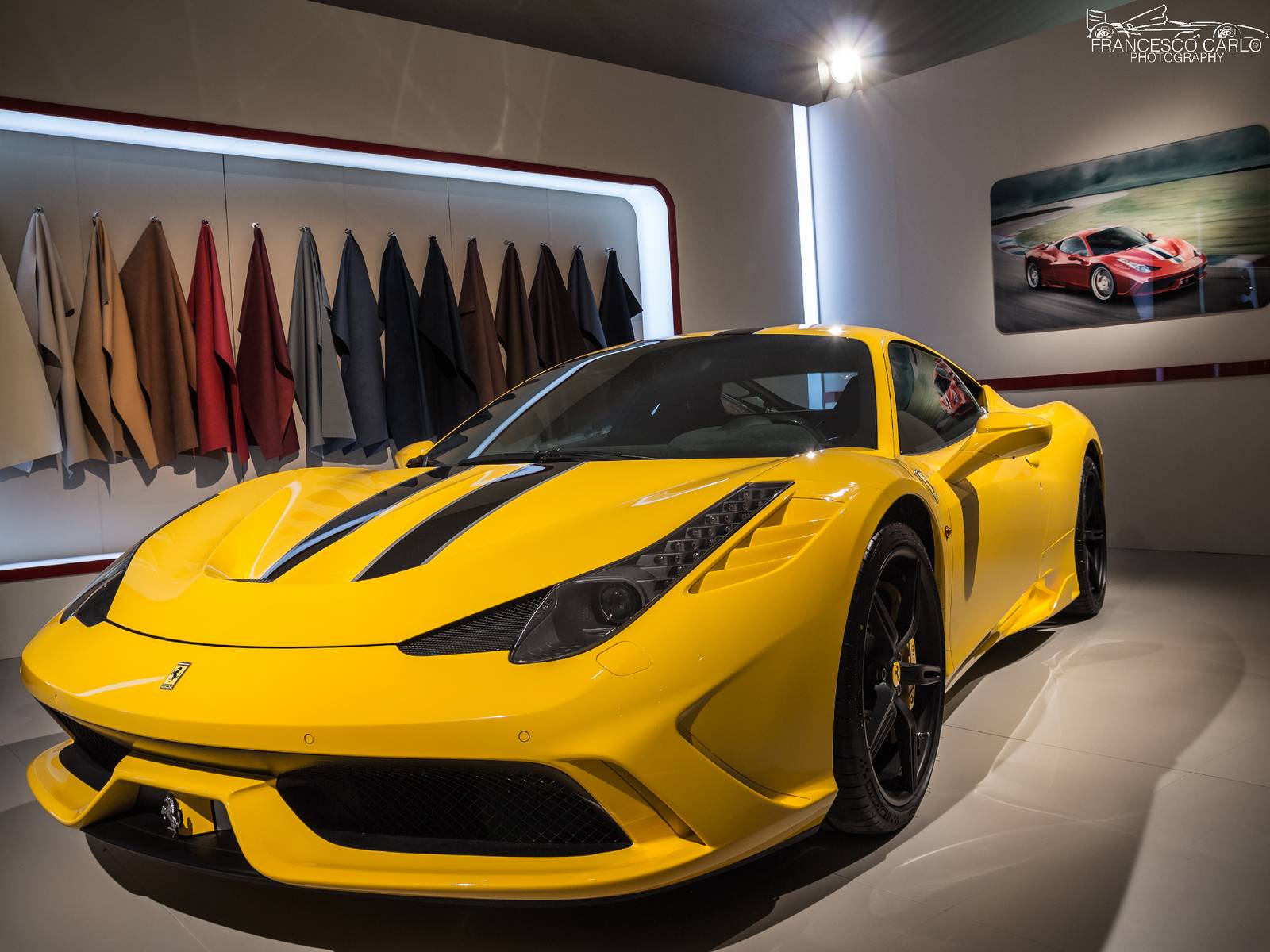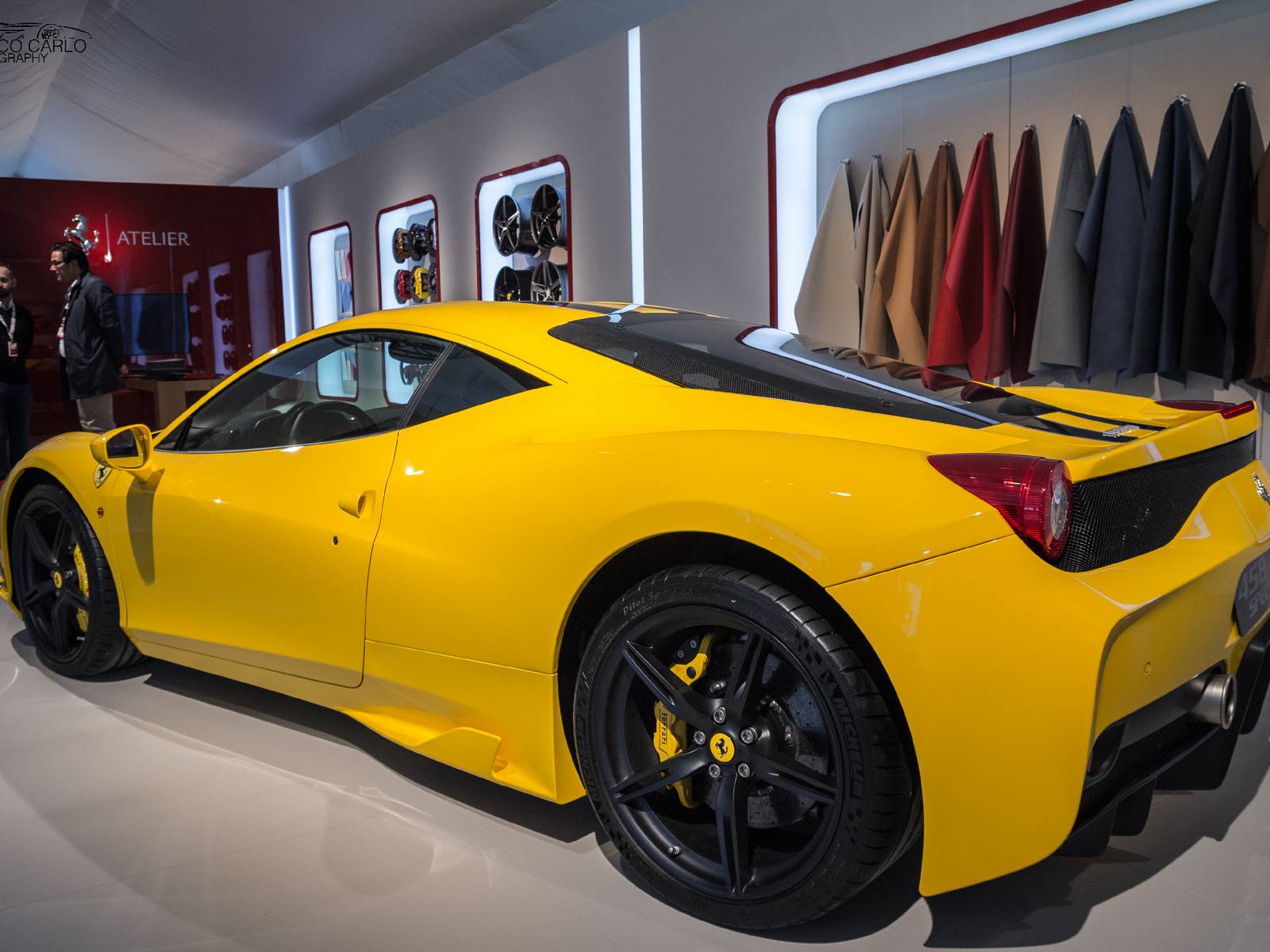 今年展示的車款當中,有一部特別引人注目,那就是黃色塗裝的輕量化版本Ferrari 458 Speciale! 有去Ferrari展示間訂購458 Speciale的朋友應該都知道,這樣黃色車身、黑色飾條的配色曾經出現在原廠授權的車輛模擬器(configurator)上面,Speciale車型專屬的鍛造輪圈也有三種顏色可供選擇,而眼前這部採用黃黑配色的Ferrari 458 Speciale呈現出專屬空力套件的另外一種熱血動感,先前已經選購此種配色的準車主們也能提早看見實車照片。