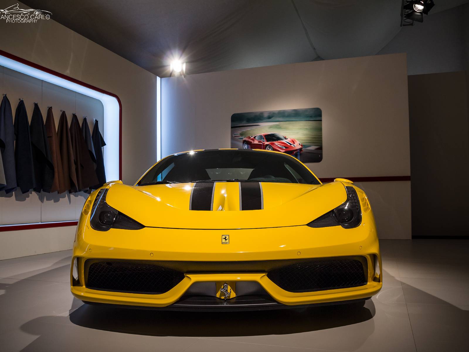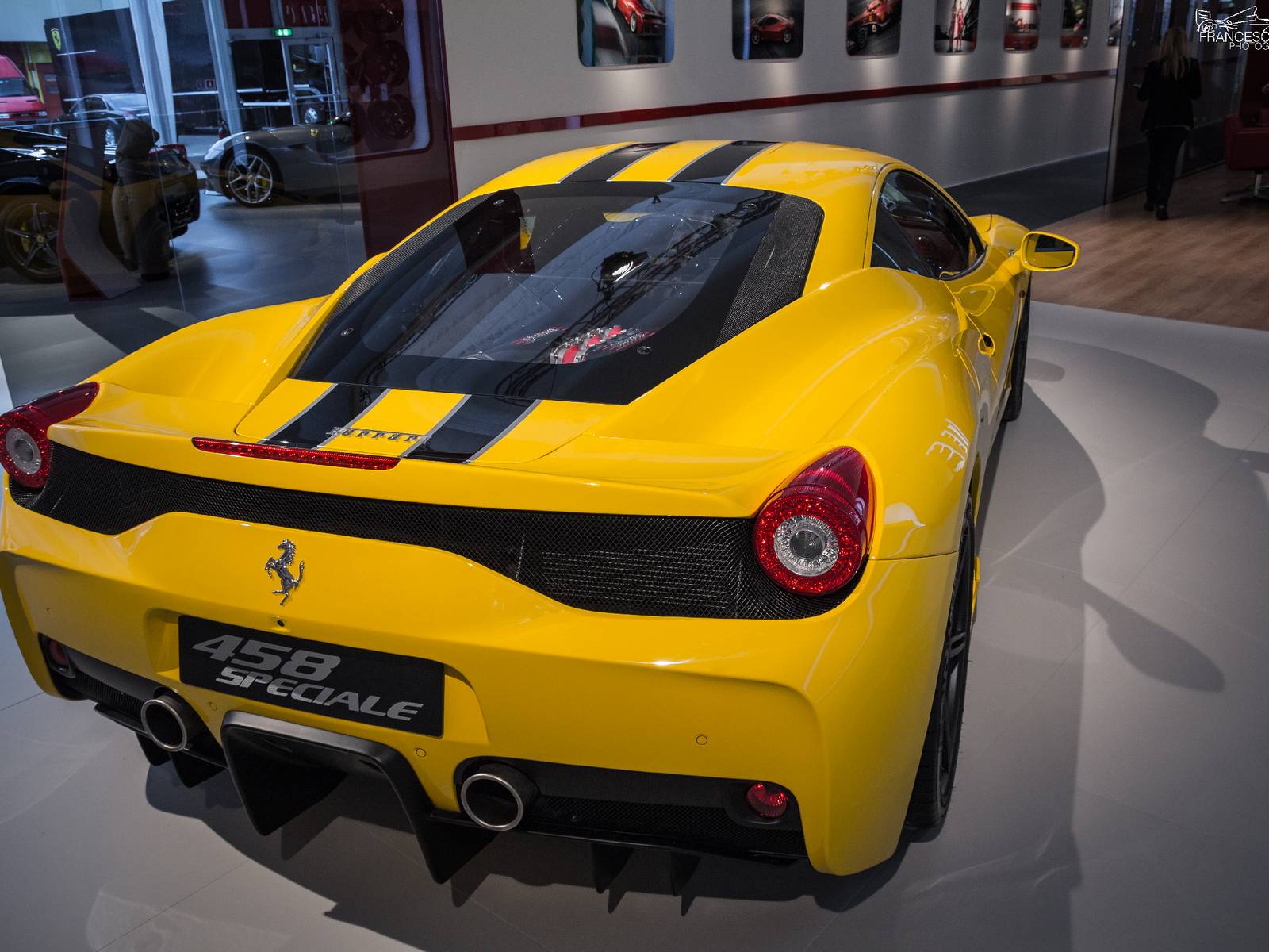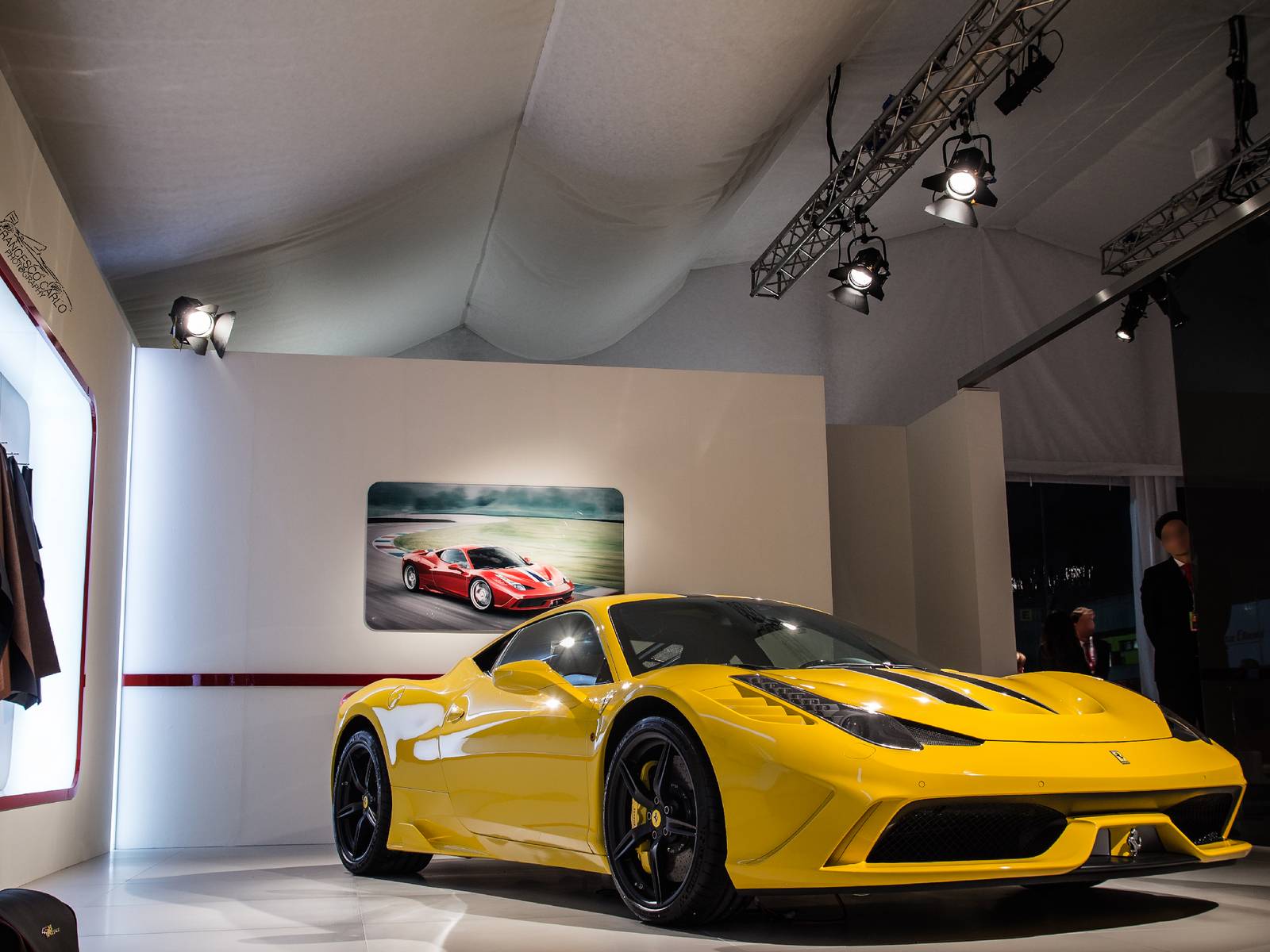 今年展示的車款當中,有一部特別引人注目,那就是黃色塗裝的輕量化版本Ferrari 458 Speciale! 有去Ferrari展示間訂購458 Speciale的朋友應該都知道,這樣黃色車身、黑色飾條的配色曾經出現在原廠授權的車輛模擬器(configurator)上面,Speciale車型專屬的鍛造輪圈也有三種顏色可供選擇,而眼前這部採用黃黑配色的Ferrari 458 Speciale呈現出專屬空力套件的另外一種熱血動感,先前已經選購此種配色的準車主們也能提早看見實車照片。
