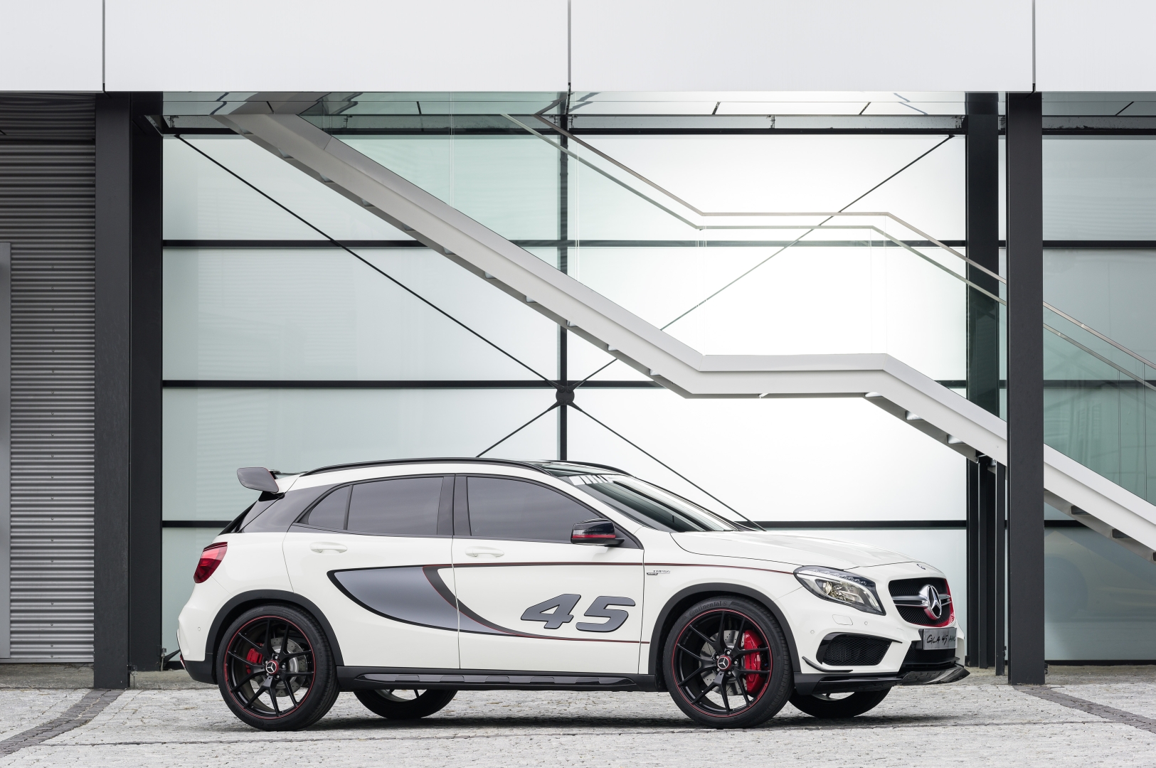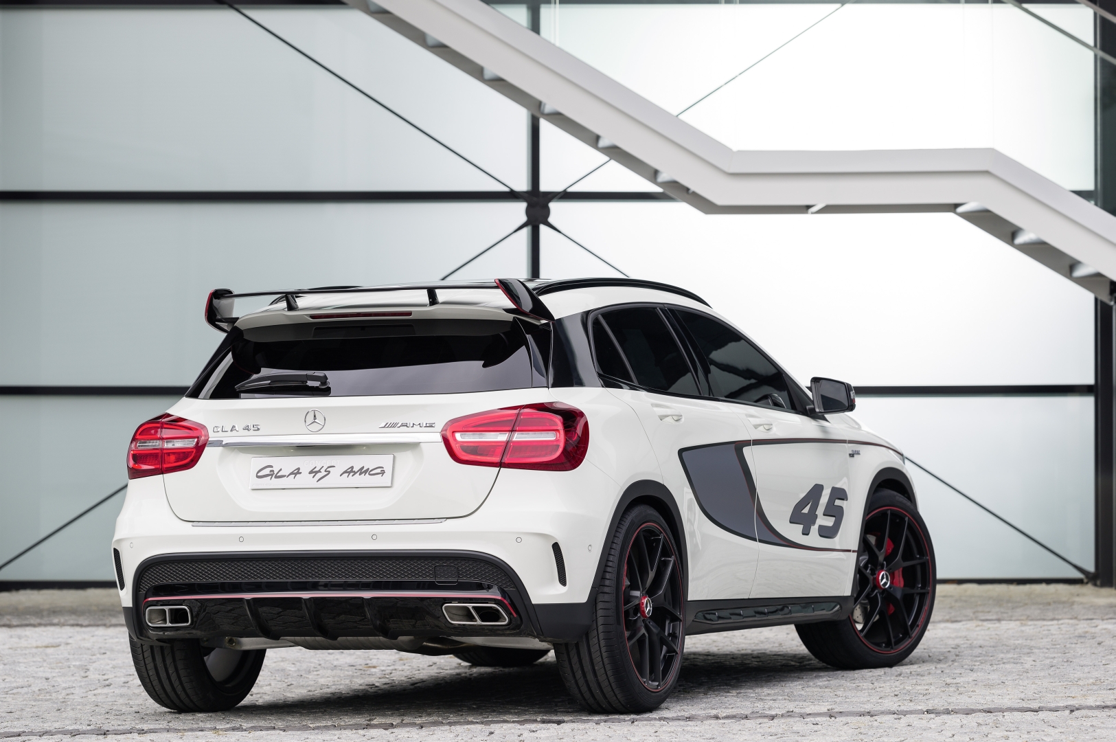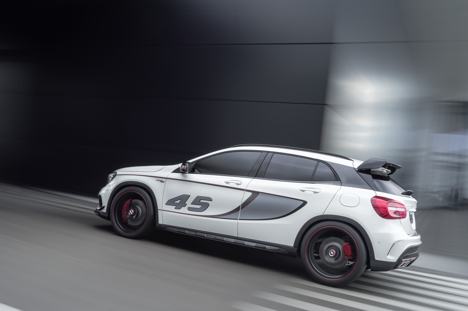 這部暫時名為Mercedes Benz Concept GLA45 AMG的跨界性能車正以概念車之姿於洛杉磯車展(Los Angeles Auto Show)亮相,預計將會於2014年的北美國際車展(North American International Auto Show)中正式公布量產車型,動力方面則與A45 AMG、CLA45 AMG同樣採用M133引擎,預計百里加速將會在5秒內。根據這些由官方所發布的照片顯示,概念車型的GLA45 AMG裝有與前幾天發表的SLS AMG GT Final Edition極為相似的輪圈,並且是碩大的21吋規格,展現出獨有的霸氣氛圍。除此之外,Mercedes Benz GLA45 AMG搭載的AMG Performance 4MATIC四輪驅動系統可能會針對越野性能方面做加強,所以與其說認為它是MFA家族的一員而不期望有太多特色,不如期盼GLA45 AMG能夠多添加老大哥G63 AMG的猛爆越野基因,讓我們一同拭目以待。