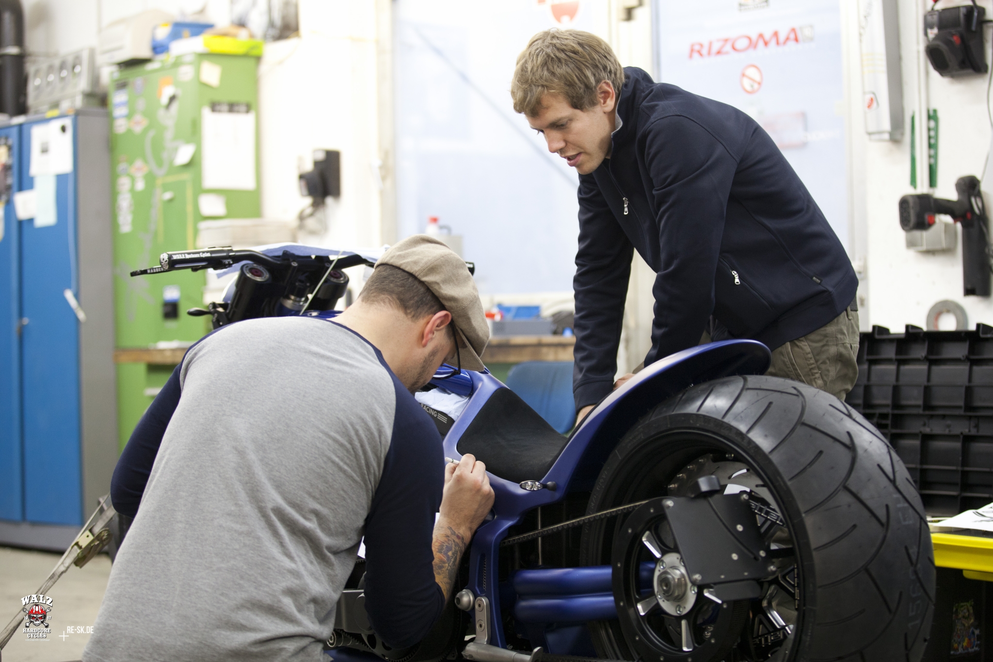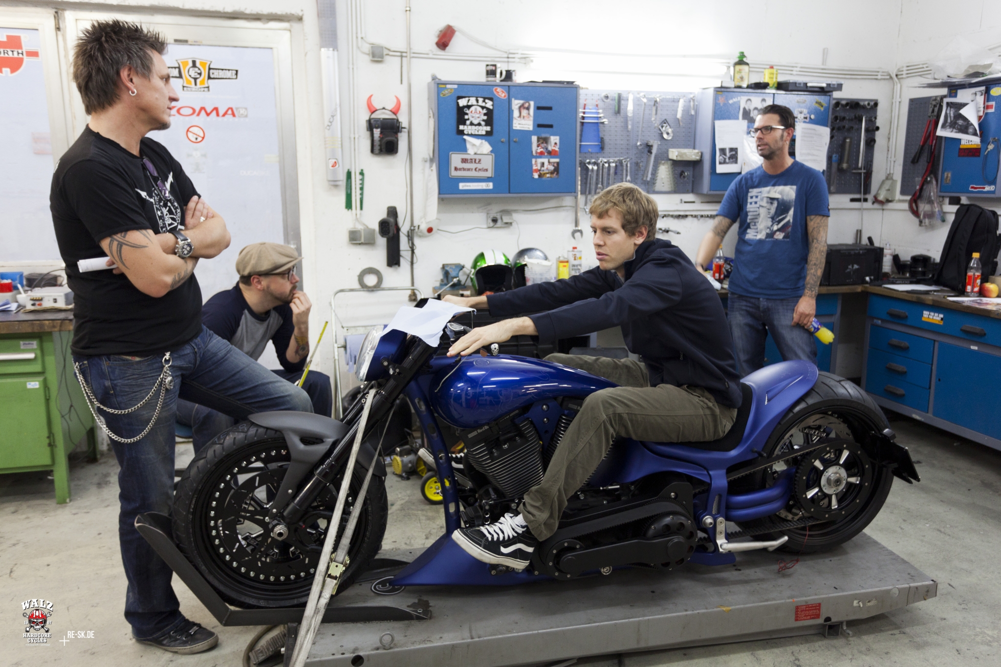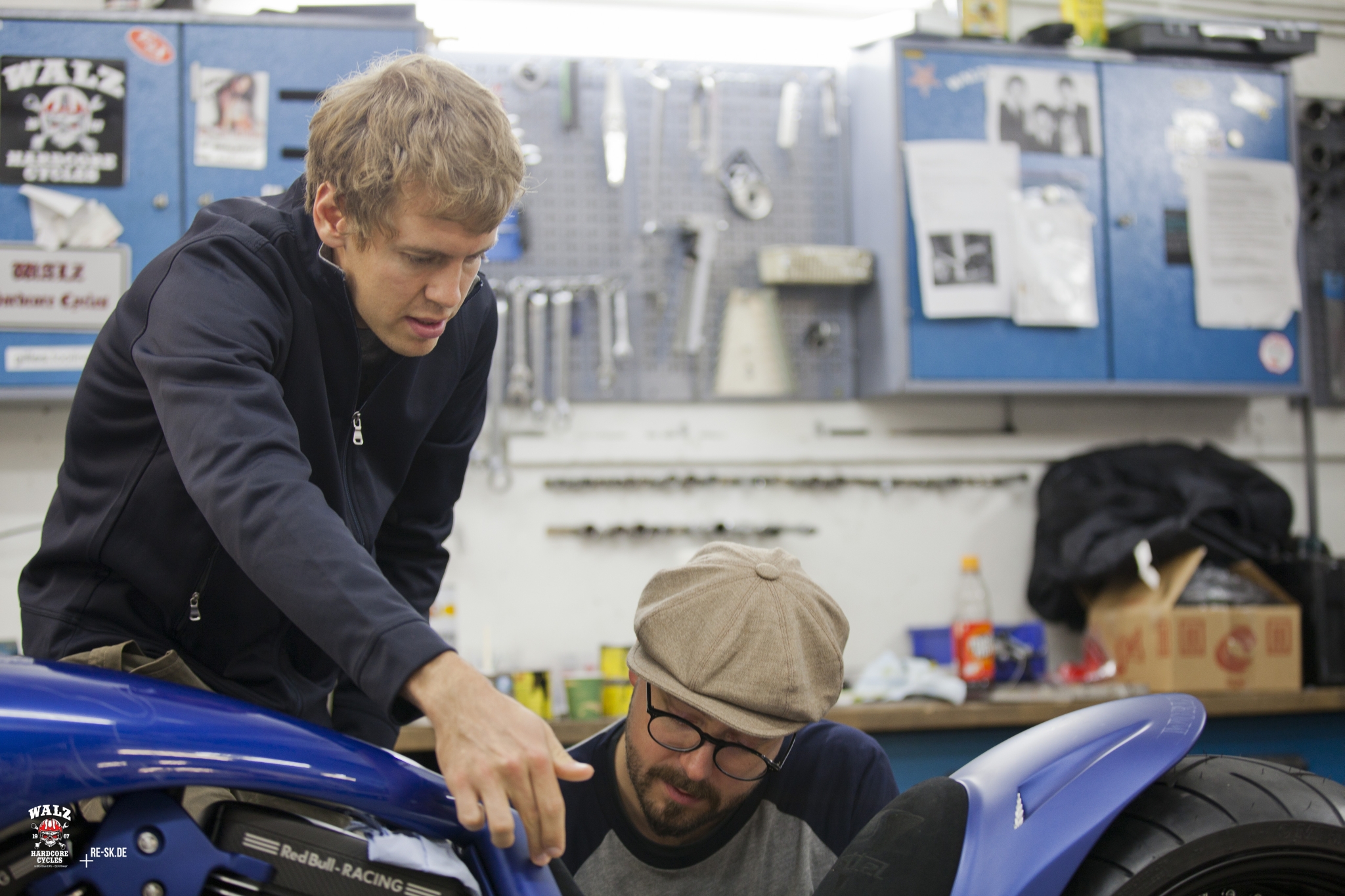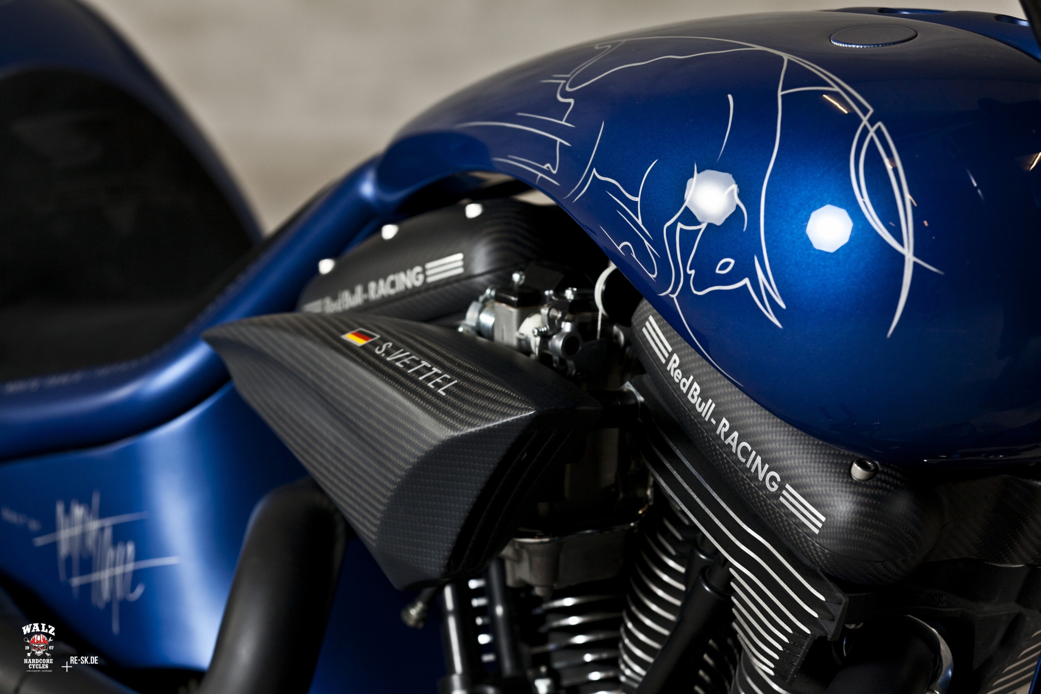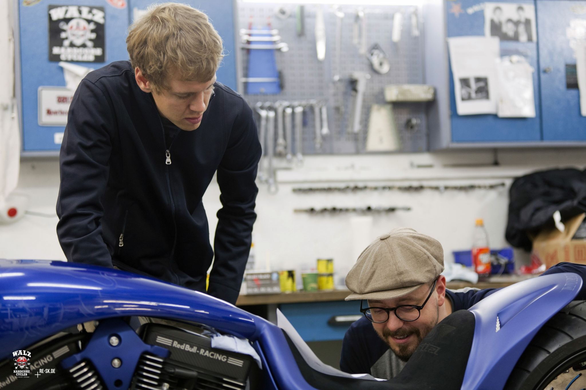 脫掉賽車服的Sebastian Vettel平日以BMW E90 320d柴油車款代步,雙門車款則是有一部Mercedes Benz SL65 AMG Black Series,平常以標準速度巡航於城鎮間,真的需要熱血狂飆,他倒是可以盡情地揮灑於賽道中。然而,Sebastian Vettel對於重型機車卻有極為強烈的熱愛,在閒暇之餘都會騎著它們出門繞繞,眼前這部乃由德國知名手工車組裝大師Marcus Walz打造,輪圈鑲入Vettel字樣,車身貼有車隊Red Bull的圖騰、風格獨具,與各位分享。