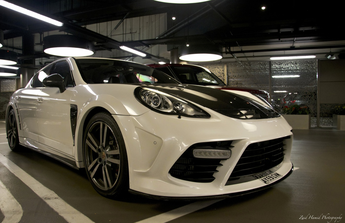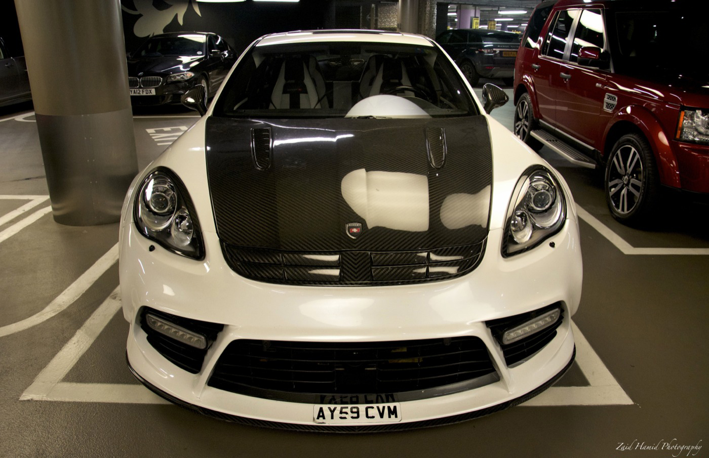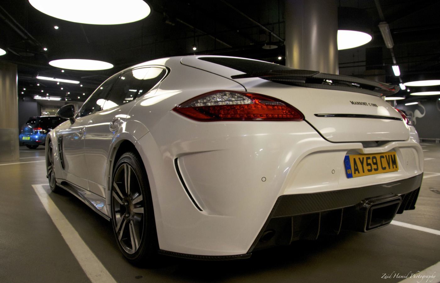 今天帶給各位的是由攝影專家Zaid Hamid於英國倫敦(London, England)著名的Westfield Shopping Mall百貨中心地下停車場所擄獲的Mansory改裝版本Porsche Panamera,全名為Mansory C One,裝有Mansory特別為Panamera設計的全車空力套件,包含前保桿、LED日間行車燈、碳纖維引擎蓋、寬車體輪弧套件、側裙組、後保桿與碳纖維後下擾流板,後上擾流尾翼也經過重新設計。由照片看來,該部Mansory Panamera C One的內裝也經過大刀闊斧的重新編織,以黑白雙色真皮為主軸,而足上所穿載的原廠輪圈可能是暫時狀態、也許是Mansory鍛造輪圈送修所致。