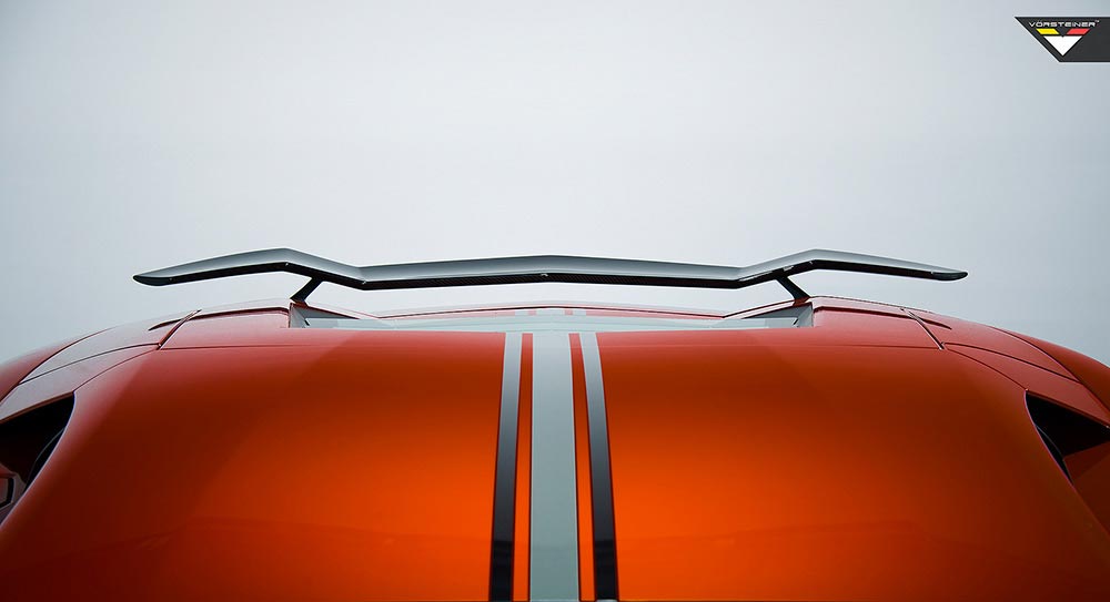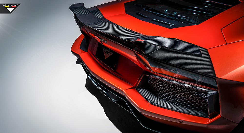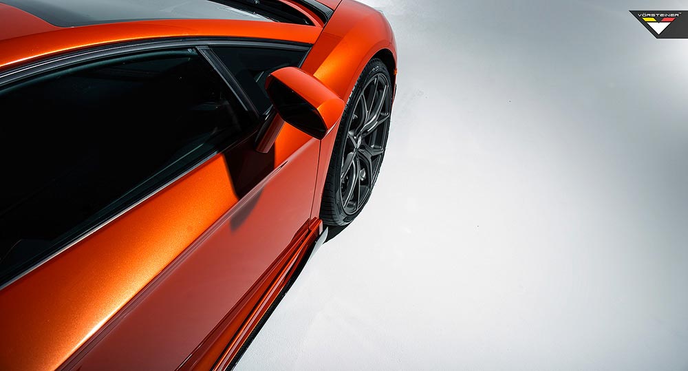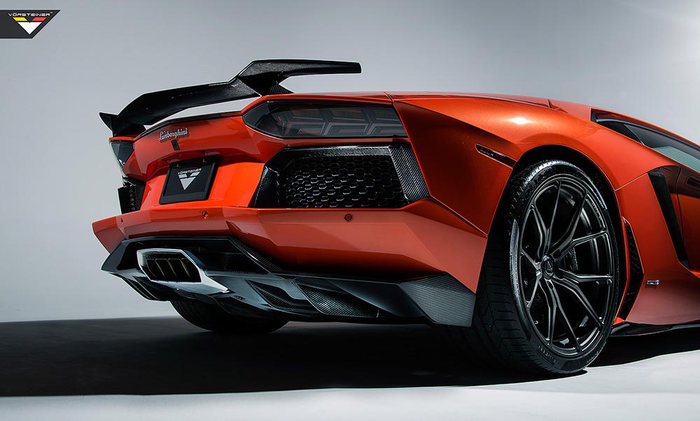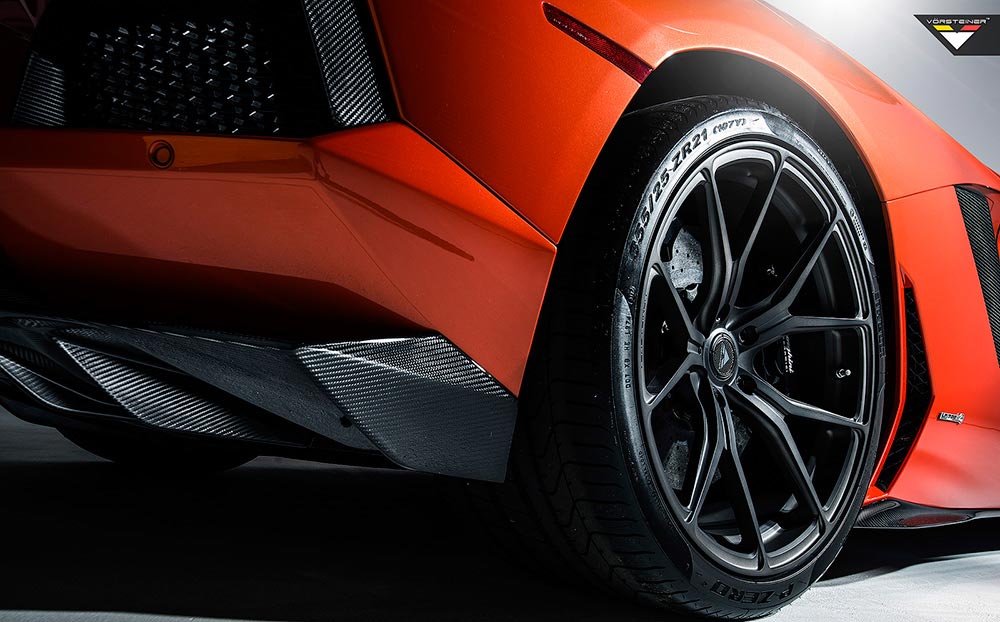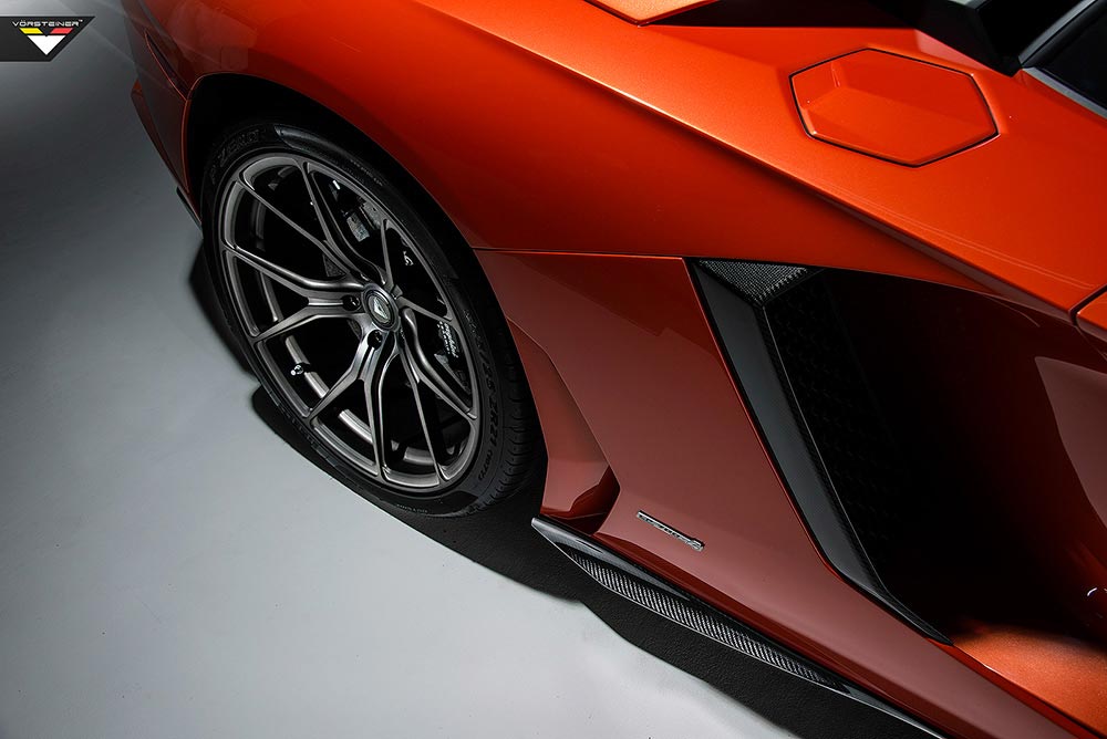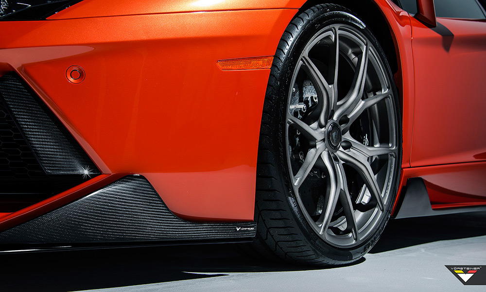 如同慣例,Vorsteiner將這款套件取名Aventador-V,整組套件包含前下巴、前氣壩周邊飾板、側裙組、側邊進氣口飾蓋、造型出類拔萃的後上擾流尾翼、後下擾流板與後氣柵飾板等部品,全數以碳纖維材質打造而成,展示車則是另外裝上Vorsteiner自家型號VSE-003的21吋鍛造輪圈,整體氣質高雅、霸氣盡現。