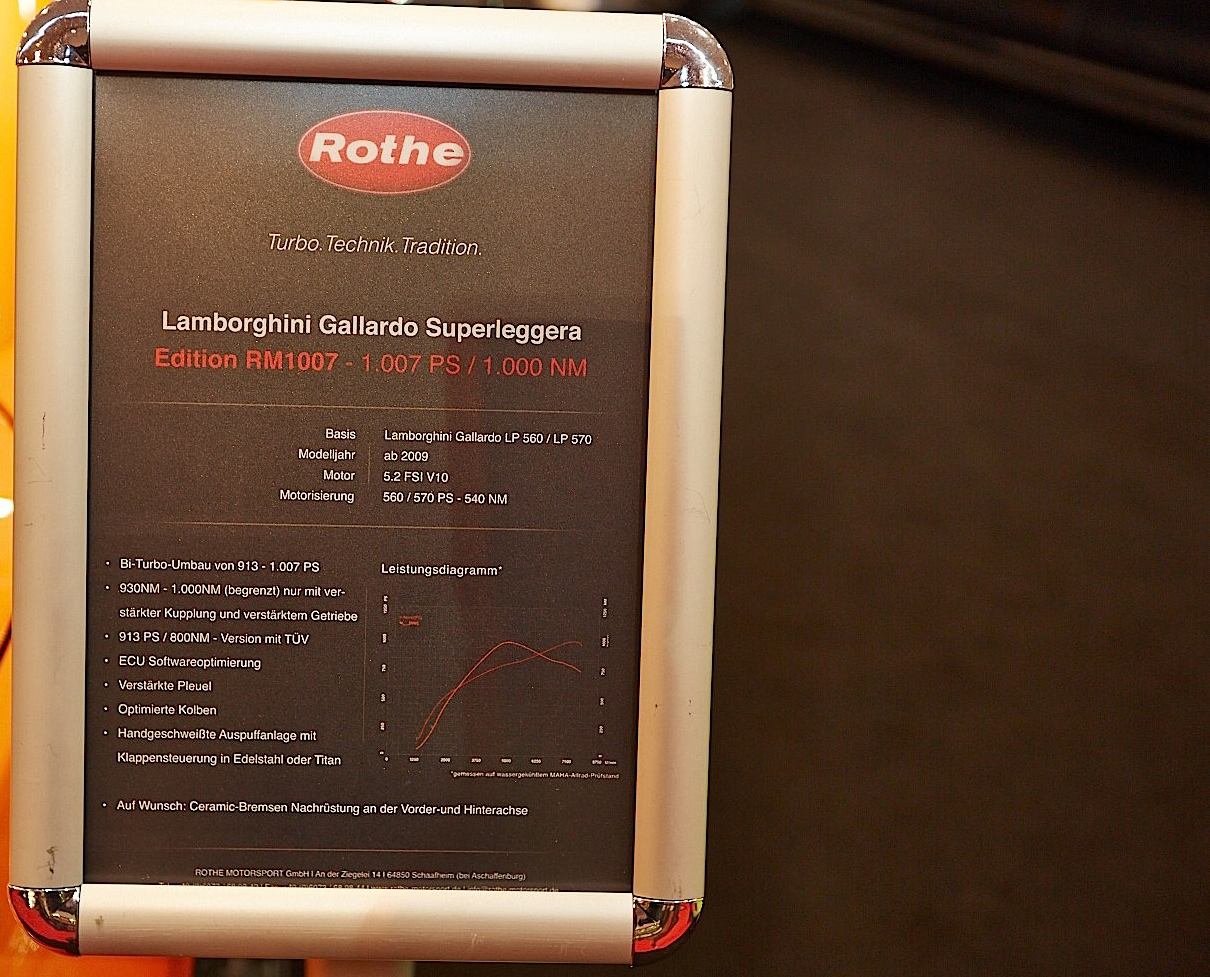 身為Lamborghini Gallardo車系中目前最強動力版本的LP570-4 Superleggera搭載5.2升V10自然進氣引擎,最大馬力為570HP,扭力峰值為55.1kgm,歸功於較LP560-4輕上70公斤的車身優勢,百里加速成績為3.4秒、由靜止加速至時速200km/hr也僅需10.4秒,已屬相當強悍。不過,人們對於動力的慾望是永遠無法滿足的,這次Rothe Motorsport所展出的兩部勁裝Gallardo當中,身披Arancio Borealis橘紅色塗裝的LP570-4 Superleggera搭載雙渦輪增壓套件配上鍛造活塞、連桿、大型冷卻器、精密編寫的電腦程式、全新設定的供油系統、高效能進氣系統與高性能排氣管等部品,最大馬力達1,007HP,扭力暴增為101.3kgm!