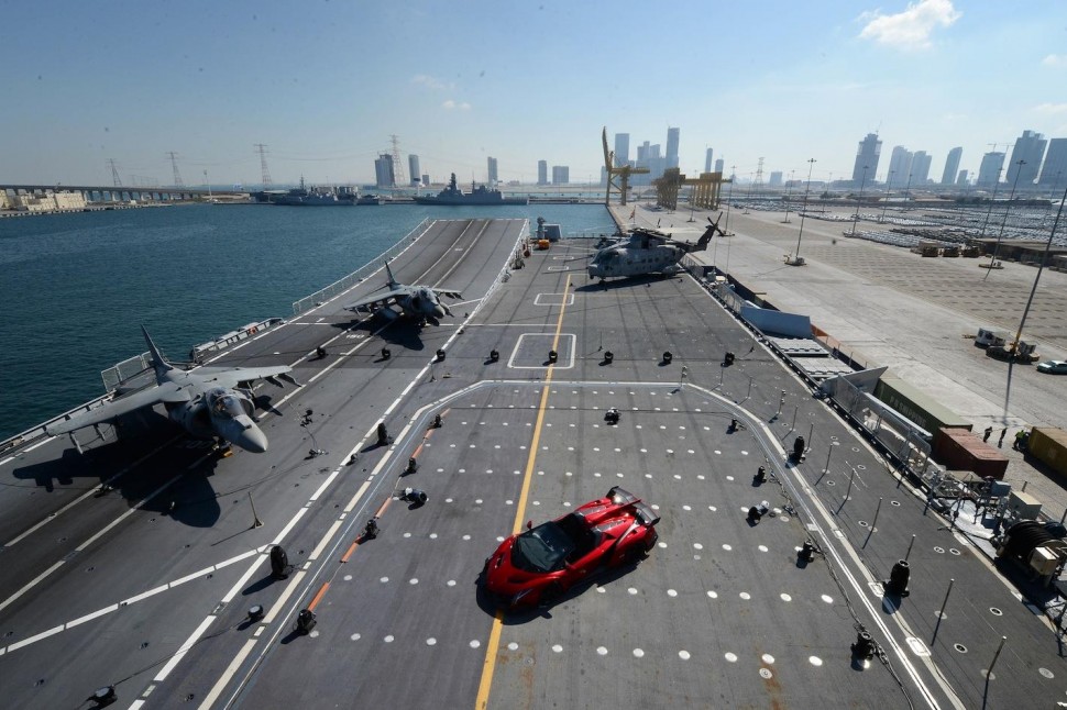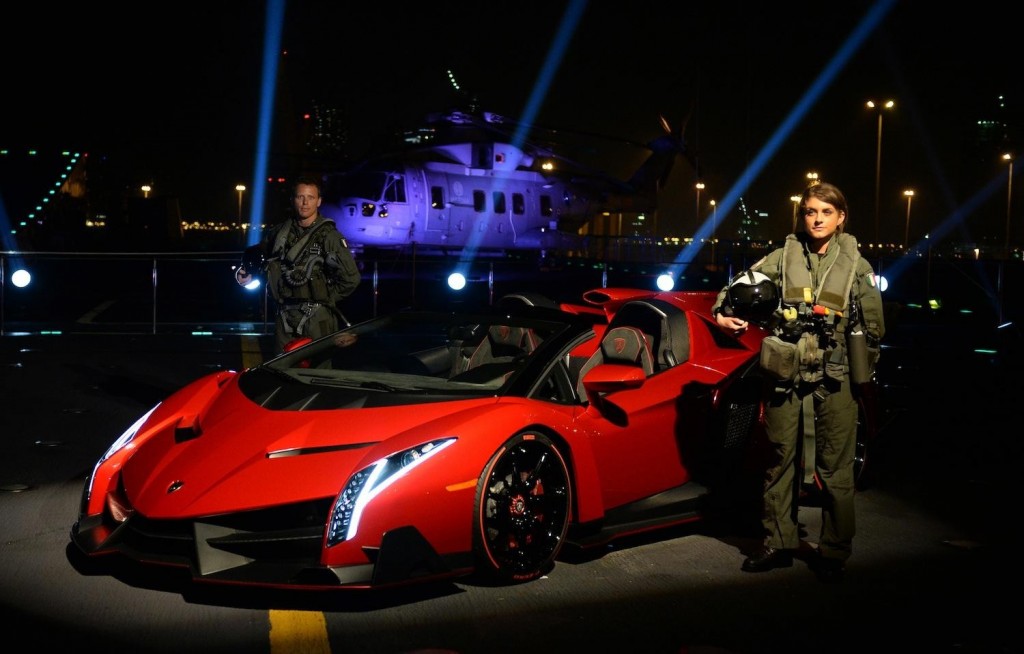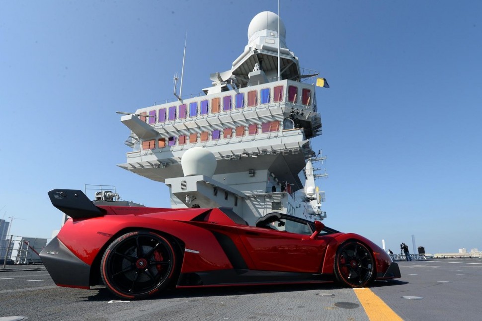 面對剛落幕不久的洛杉磯國際車展(Los Angeles Auto Show),義大利超級跑車廠Lamborghini並沒有將稀有車款Veneno搬出檯面,而是選擇在比佛利山莊(Beverly Hills)的私人活動場合中展出世界限量9部的Lamborghini Veneno Roadster。最近,這部繼限量三部、雙門版本的Lamborghini Veneno之後登場的敞篷版本超級跑車與義大利海軍配合,選擇在阿布達比(Abu Dhabi)的Mina Zayed海港、用航空母艦MM Cavour運送Veneno Roadster抵達,進行極為少見的發表會。