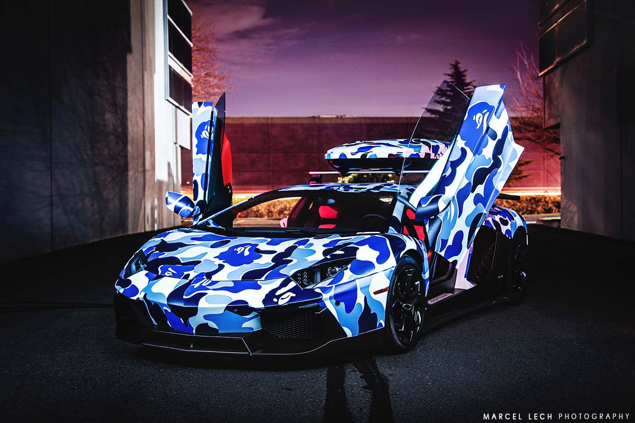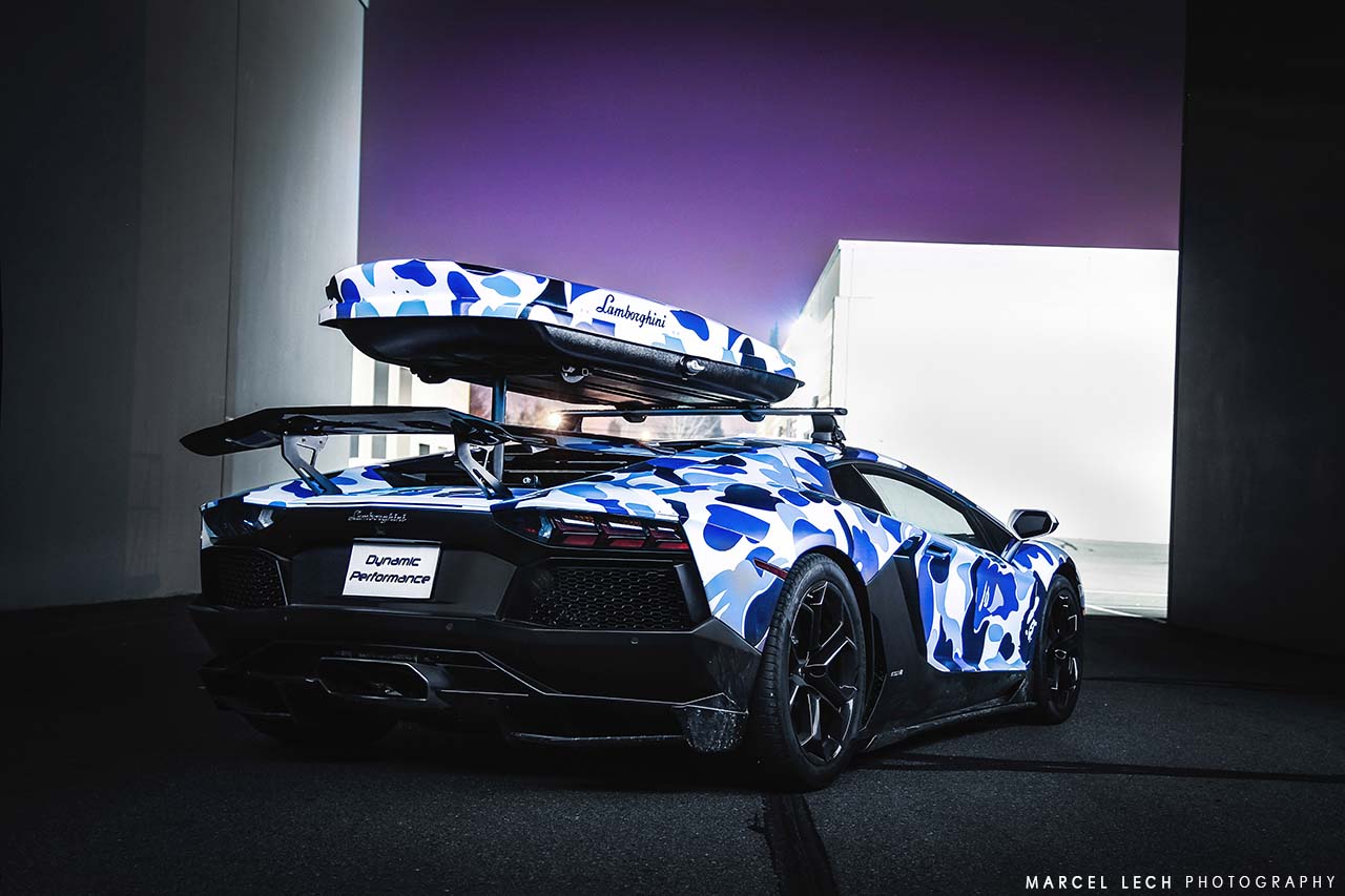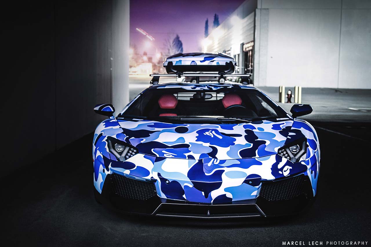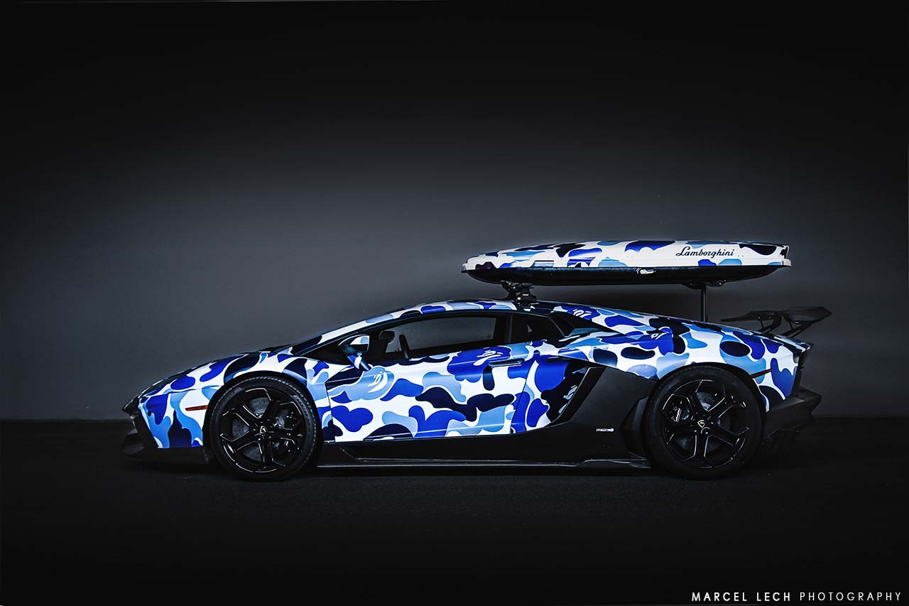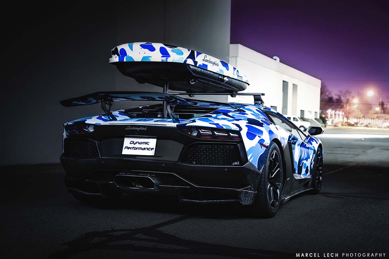 眼前這部採用藍色迷彩圖裝的Lamborghini Aventador乃由攝影專家Marcel Lech主導拍攝,車頂裝著載運雪橇的置物盒、排氣管已換裝IPE鈦合金式樣,同時外觀加裝來自LB Performance的空力套件部品,在全球超過2,000部的Lamborghini Aventador當中顯得格外吸睛。根據這位車主的說法,他正準備要開著這部義大利超級跑車去溫哥華北方的渡假勝地惠斯勒(Whistler)滑雪,而配有四輪驅動的它想必會非常勝任。