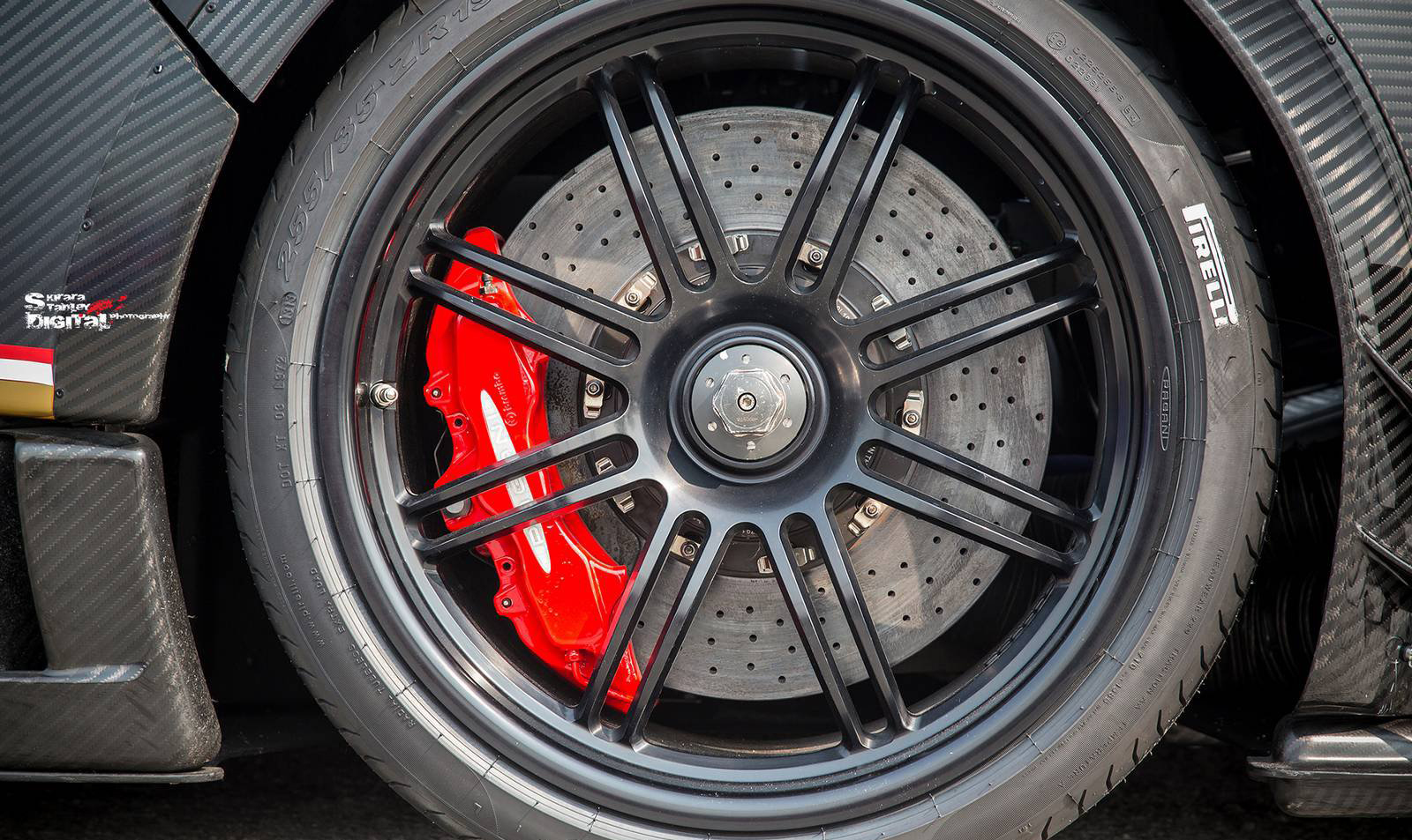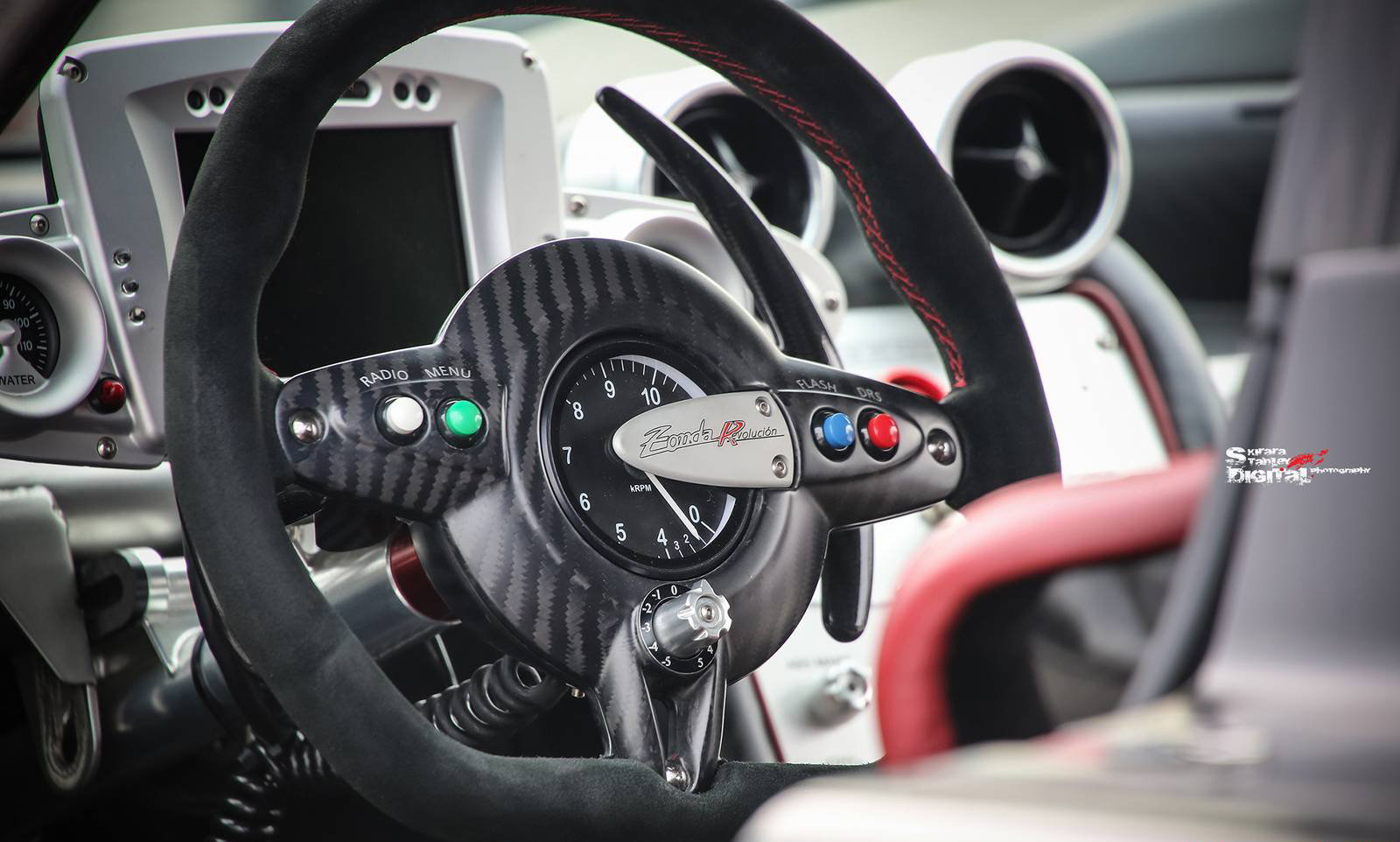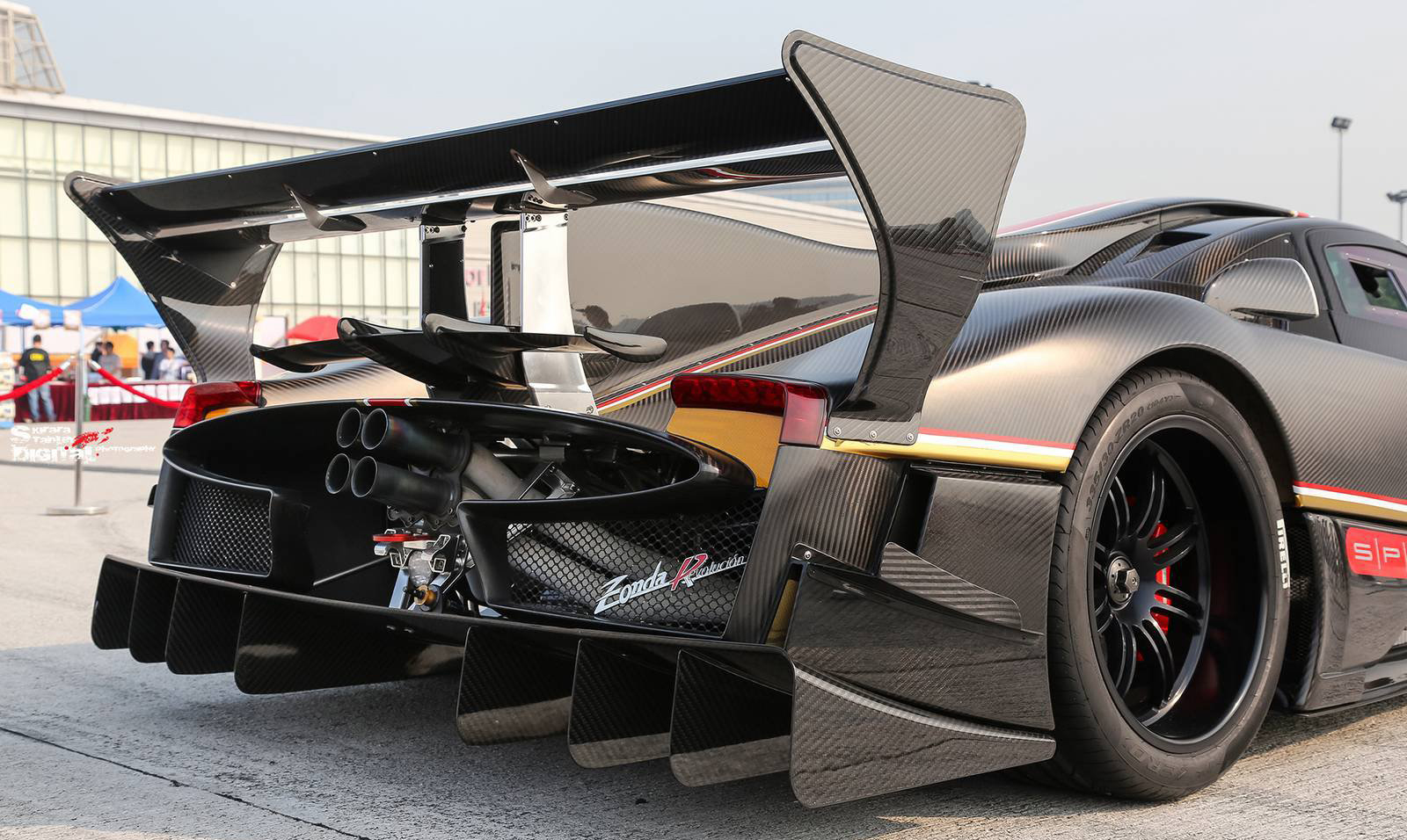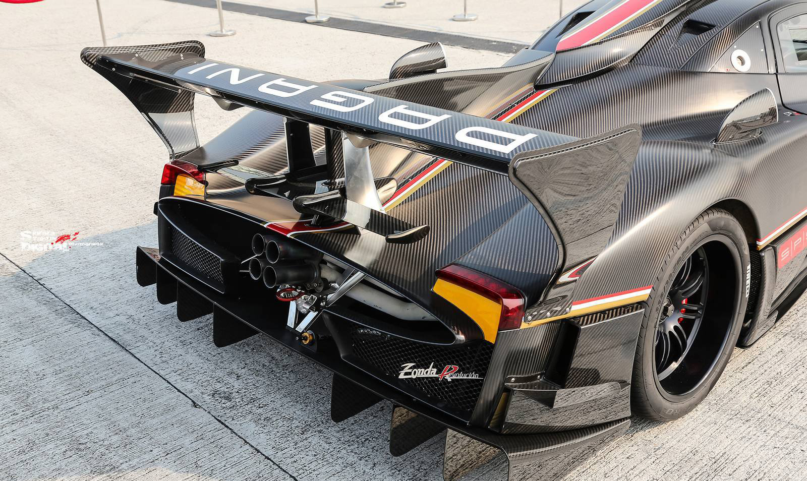 這部Pagani Zonda Revolucion與首次出現於媒體面前的版本相同,採用碳纖維材質紋路為車身主軸,搭配紅色與金色飾條,而就我們所知,另外四部Pagani Zonda Revolucion當中,有一部是先前為各位報導過的藍色碳纖維版本。動力部分,Pagani Zonda Revolucion搭載與Zonda R相同的6.0升V12引擎,然而透過電腦程式與各種硬體的修改與強化,最大馬力提升至800HP,車身則是拜碳纖維、鋁合金複合製程所賜僅重1,070公斤,達到每公噸748匹馬力的優異馬力重量比。除此之外,Pagani Zonda Revolucion配有一具換檔僅需20毫秒的六速序列式變速箱與由名廠Bosch所特製、擁有12種不同設定可供切換的循跡控制系統,同時也將ABS防鎖死煞車系統列為標準配備,而其中較特殊的是,Pagani Zonda Revolucion在後擾流尾翼中配有源自F1賽車的DRS(Drag Reduction System)系統。