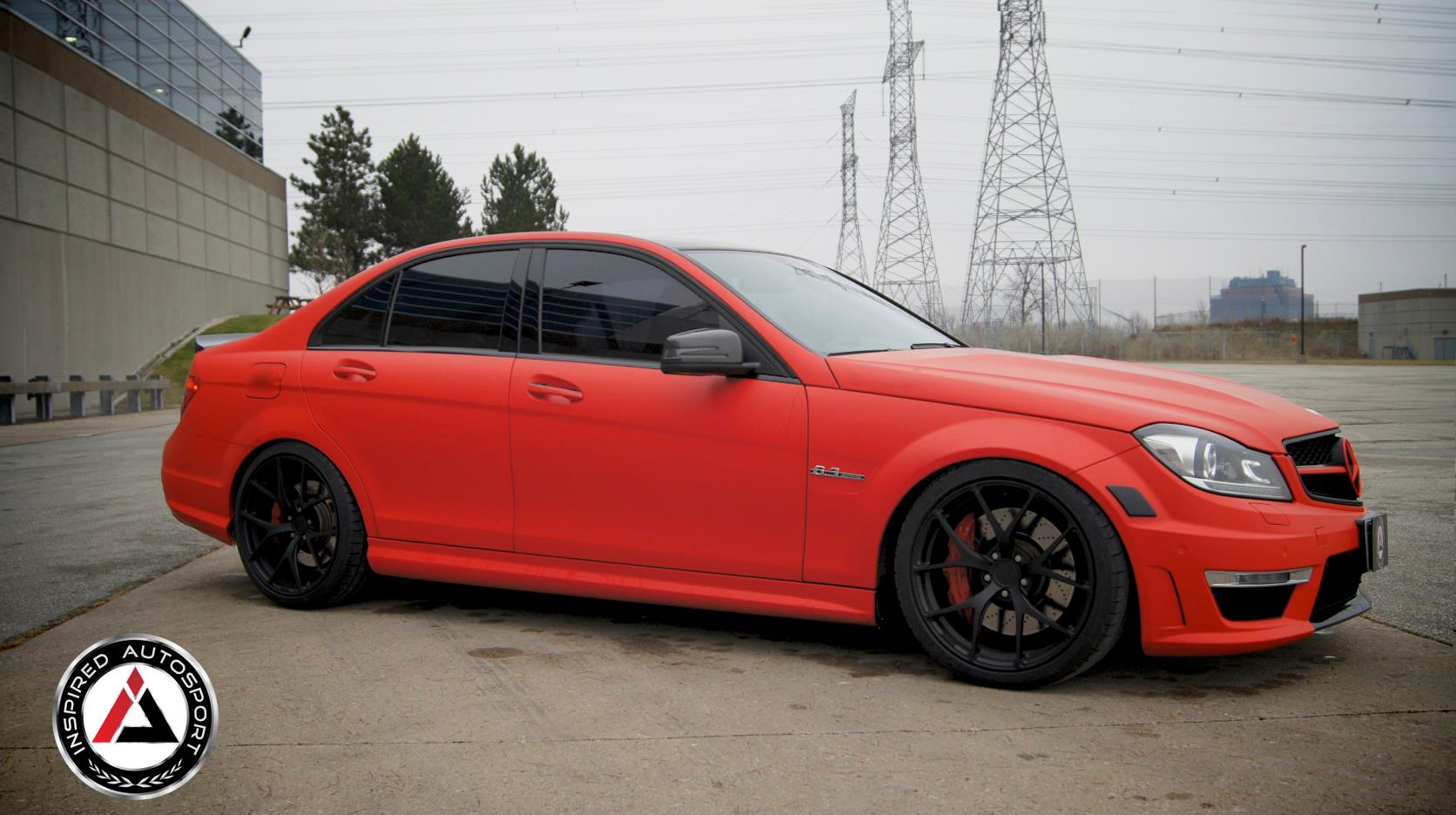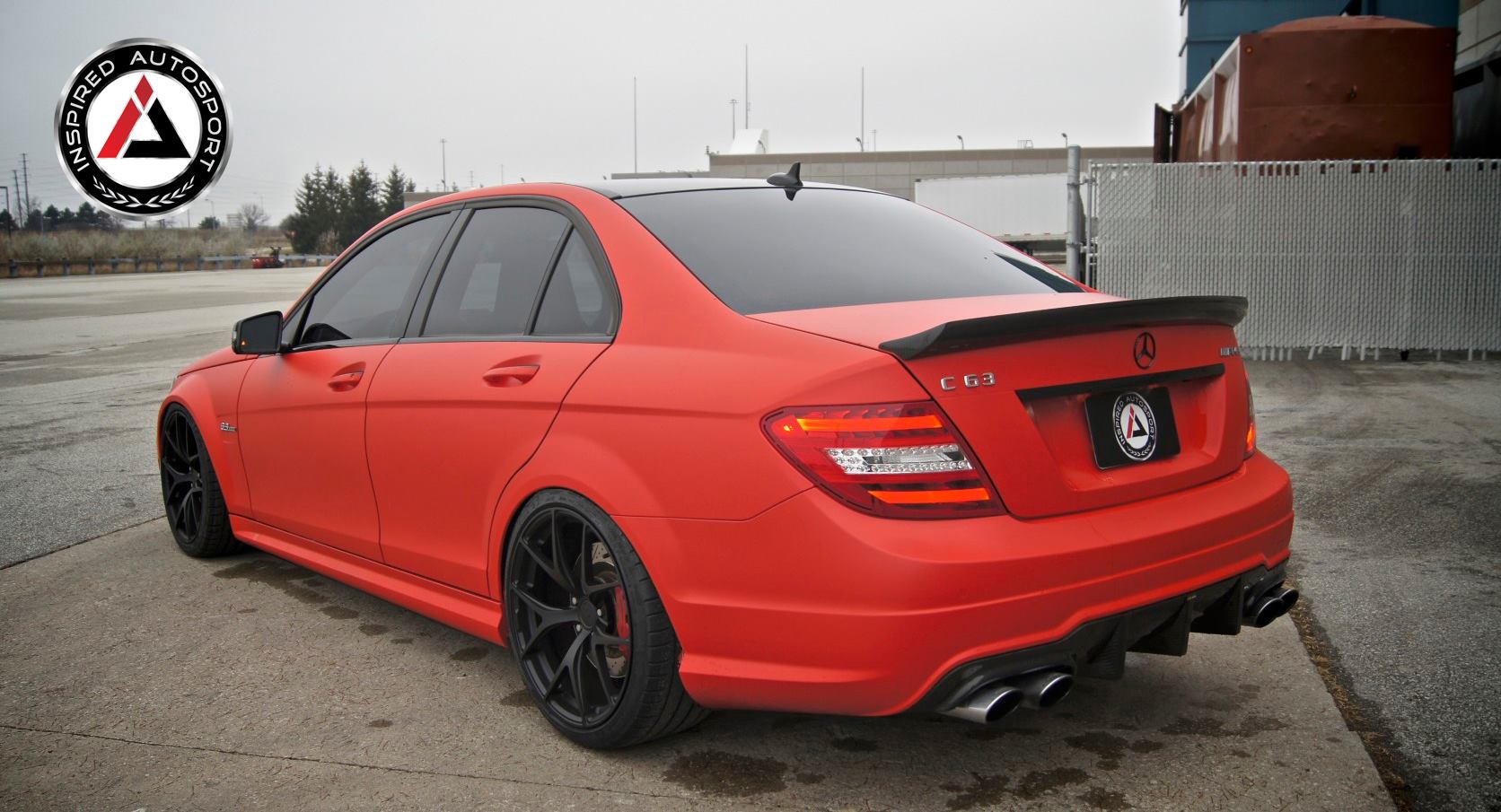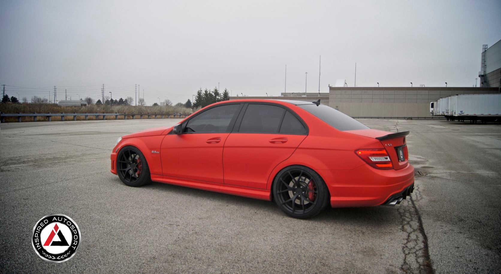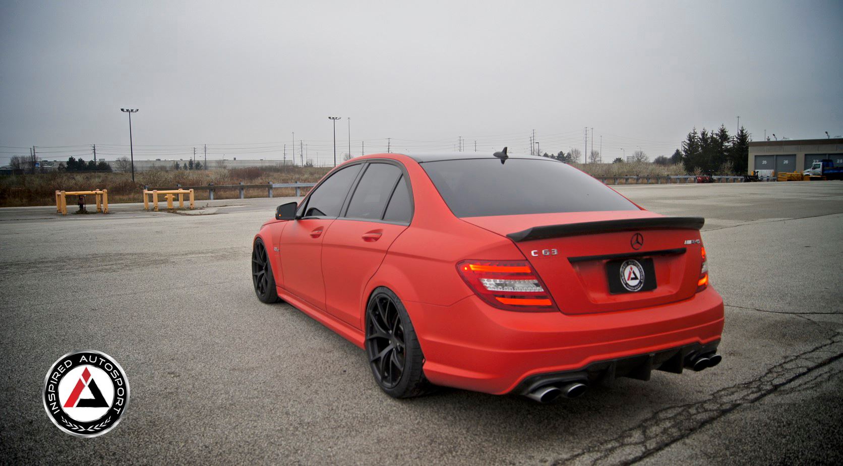 今天為各位帶來的是一部2012年款式的Mercedes Benz C63 AMG,全車施以消光紅色貼膜並且加裝Mode Carbon碳纖維鴨尾翼、碳纖維後下擾流板與RevoZport碳纖維後視鏡蓋,輪圈選用PUR Wheels出品、型號4OUR的黑色19吋輕量化款式,另外換裝KW V3高低軟硬可調式避震器組將車身降低。