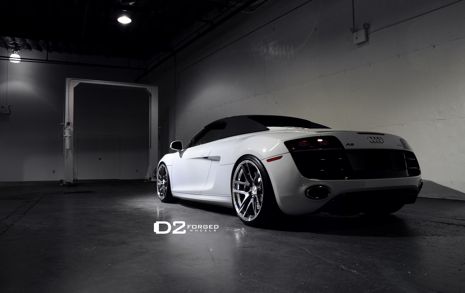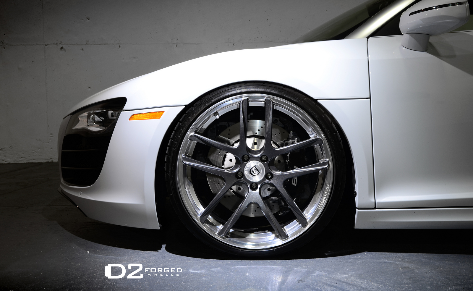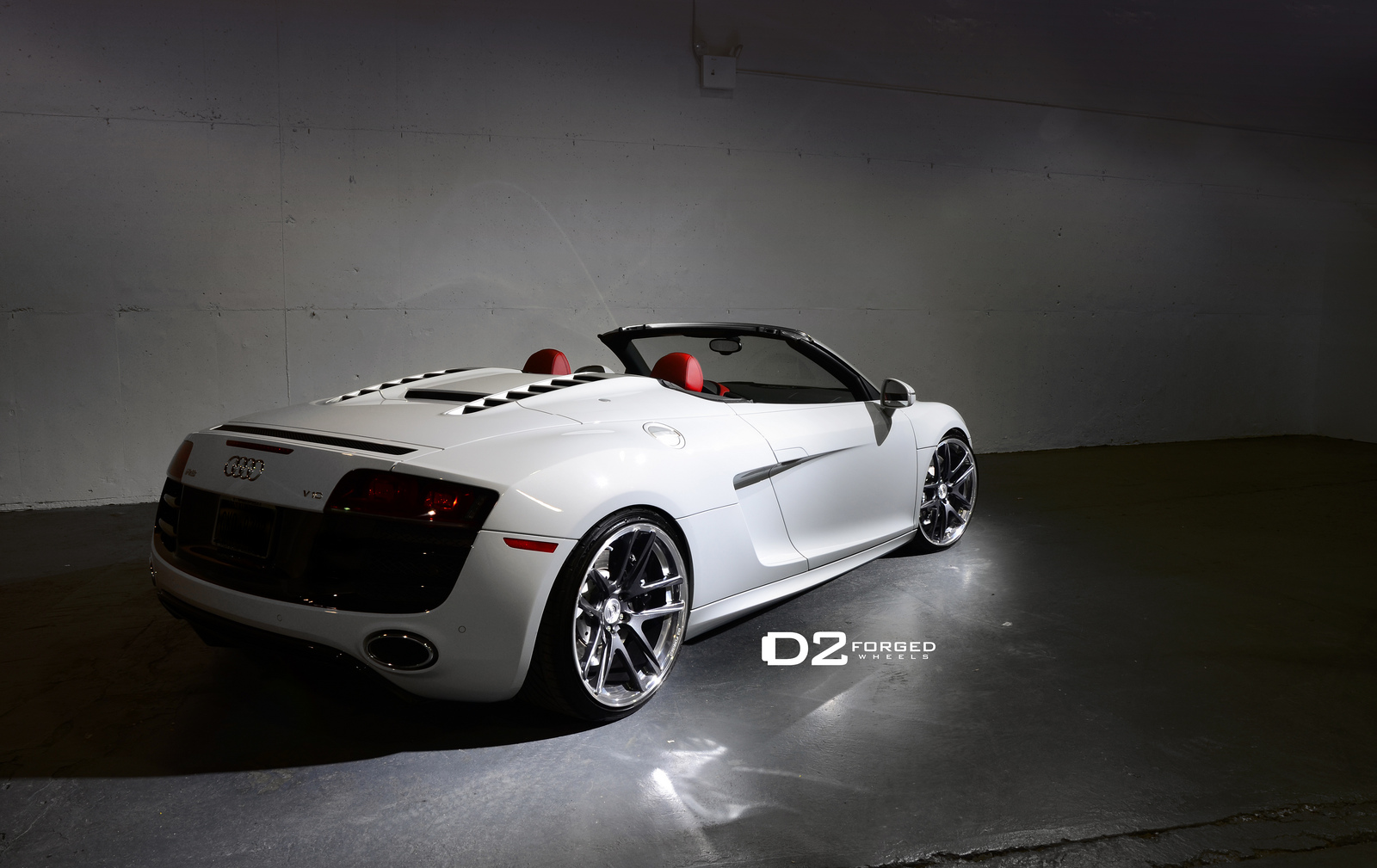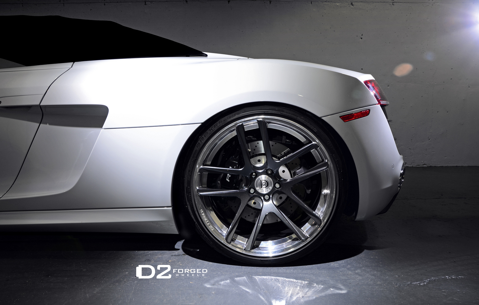 這部上空超級跑車的主人在流用R8 GT的鍛造輪圈與試用OZ放射狀輪圈數個月之後,決定選擇知名品牌D2Forged Wheels出品的單片式鍛造輪圈,型號為MB8,尺寸為比原廠升級一吋的前20x9J、後20x12J的前後配設定,中心採用淡鐵灰色塗裝,外圈則是以電鍍拋光處理,另外透過換裝KW V3高低軟硬可調避震器組將車身降低,開篷後又能以選配的紅色真皮內裝為視覺焦點,使得這部敞篷Audi R8 V10顯得格外有型。