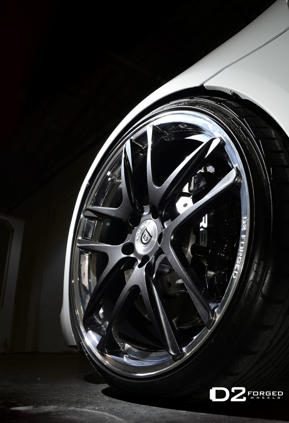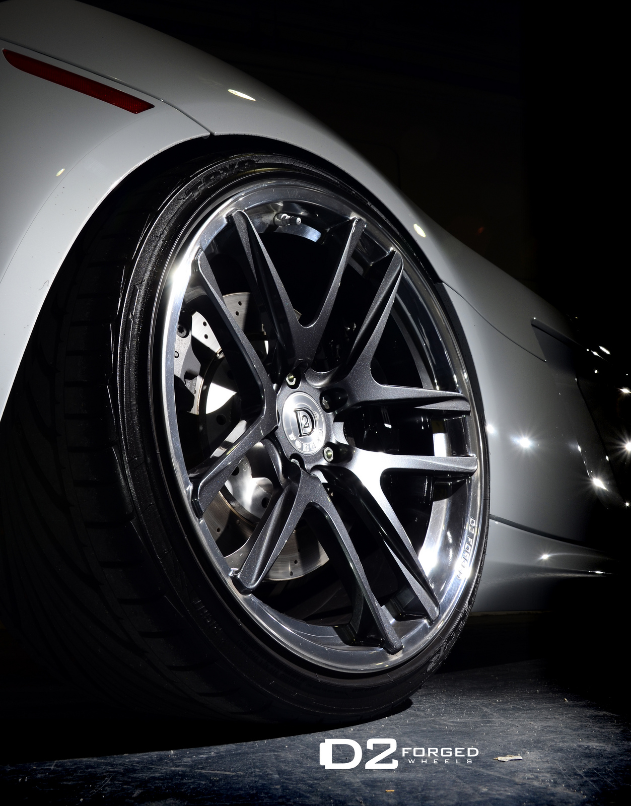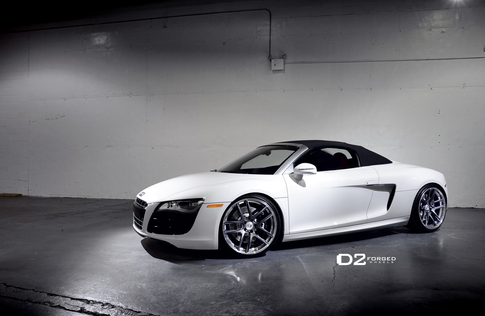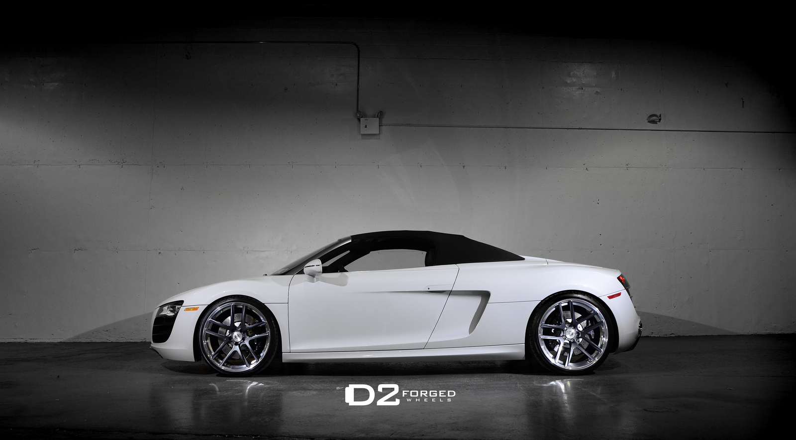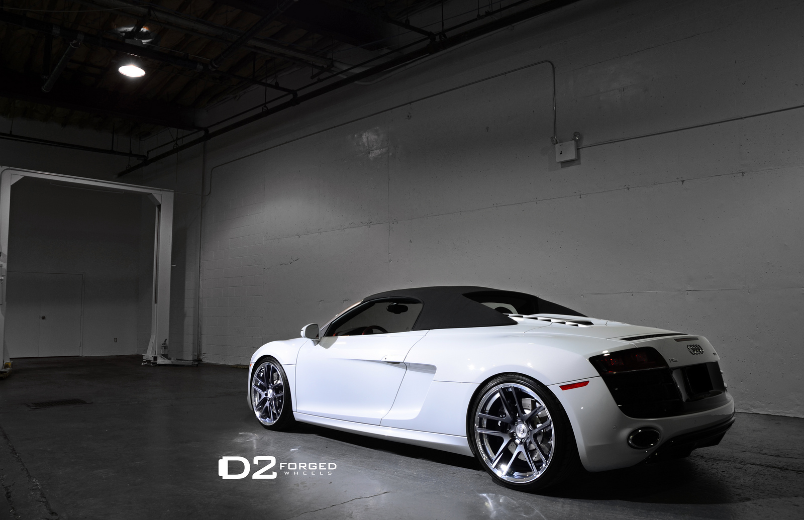 這部上空超級跑車的主人在流用R8 GT的鍛造輪圈與試用OZ放射狀輪圈數個月之後,決定選擇知名品牌D2Forged Wheels出品的單片式鍛造輪圈,型號為MB8,尺寸為比原廠升級一吋的前20x9J、後20x12J的前後配設定,中心採用淡鐵灰色塗裝,外圈則是以電鍍拋光處理,另外透過換裝KW V3高低軟硬可調避震器組將車身降低,開篷後又能以選配的紅色真皮內裝為視覺焦點,使得這部敞篷Audi R8 V10顯得格外有型。