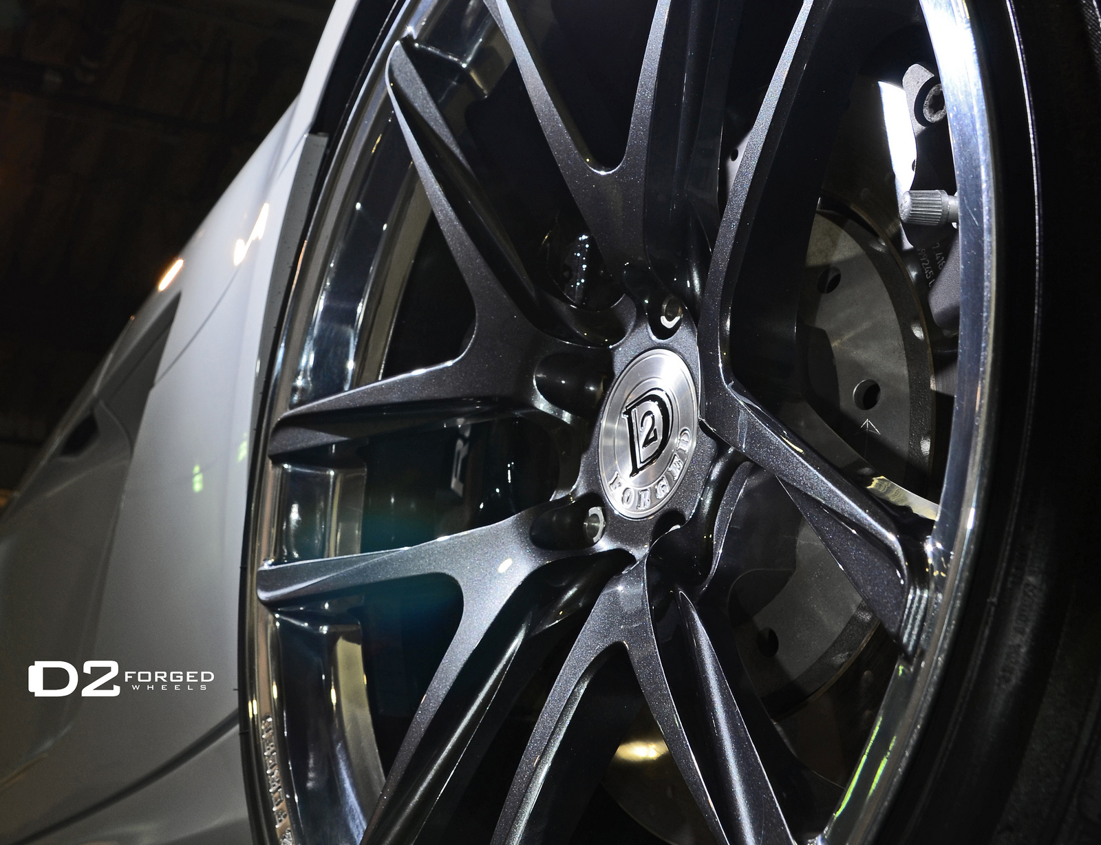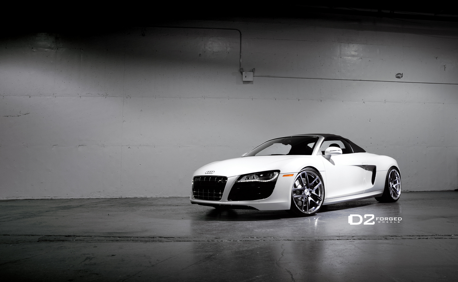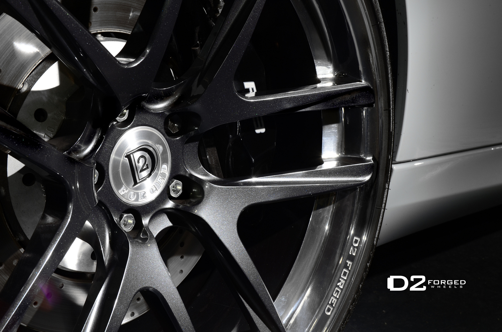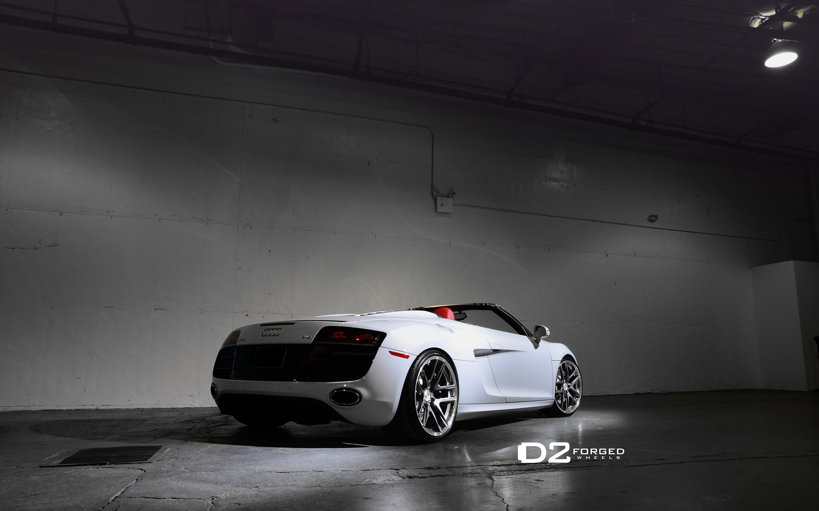 這部上空超級跑車的主人在流用R8 GT的鍛造輪圈與試用OZ放射狀輪圈數個月之後,決定選擇知名品牌D2Forged Wheels出品的單片式鍛造輪圈,型號為MB8,尺寸為比原廠升級一吋的前20x9J、後20x12J的前後配設定,中心採用淡鐵灰色塗裝,外圈則是以電鍍拋光處理,另外透過換裝KW V3高低軟硬可調避震器組將車身降低,開篷後又能以選配的紅色真皮內裝為視覺焦點,使得這部敞篷Audi R8 V10顯得格外有型。