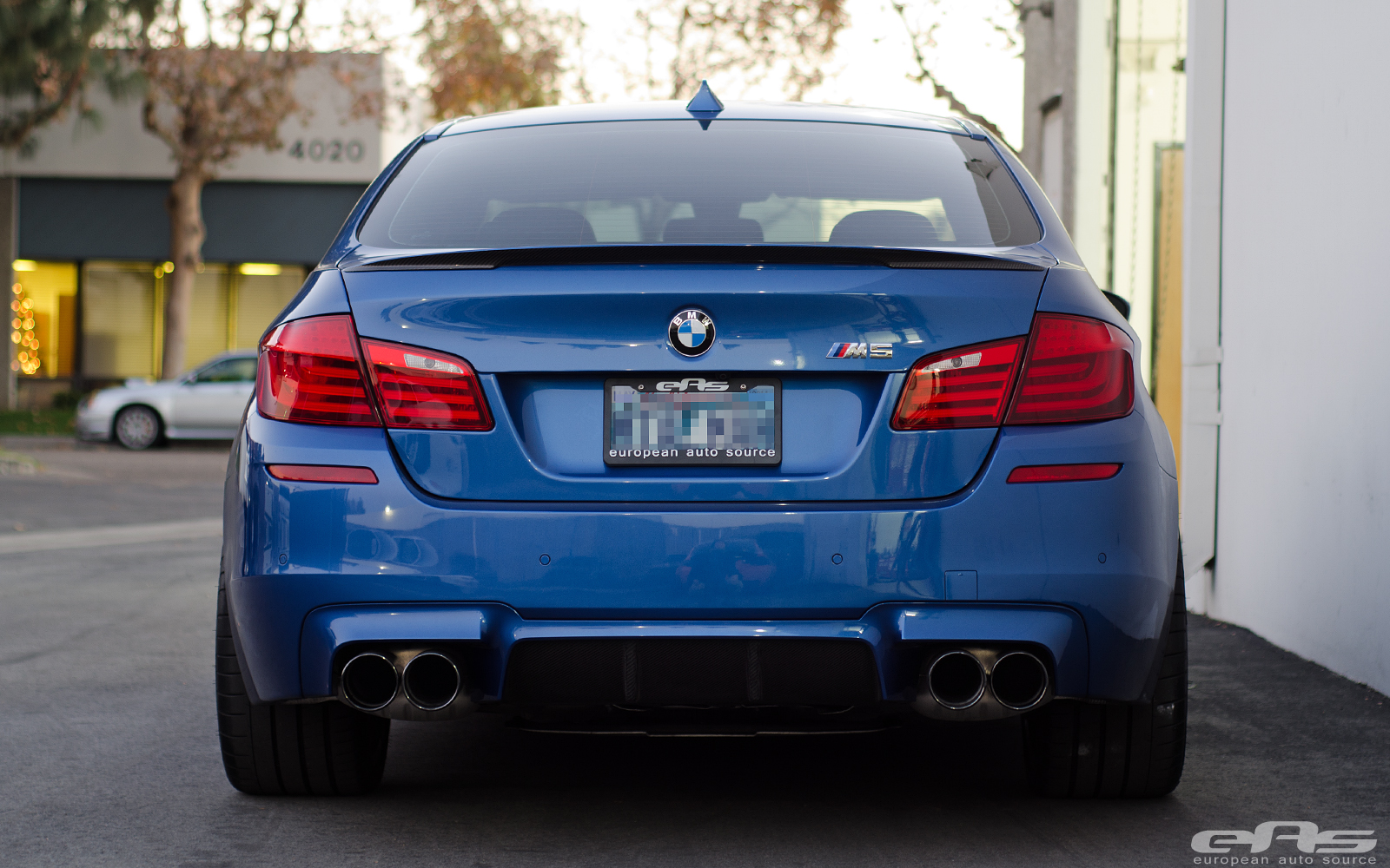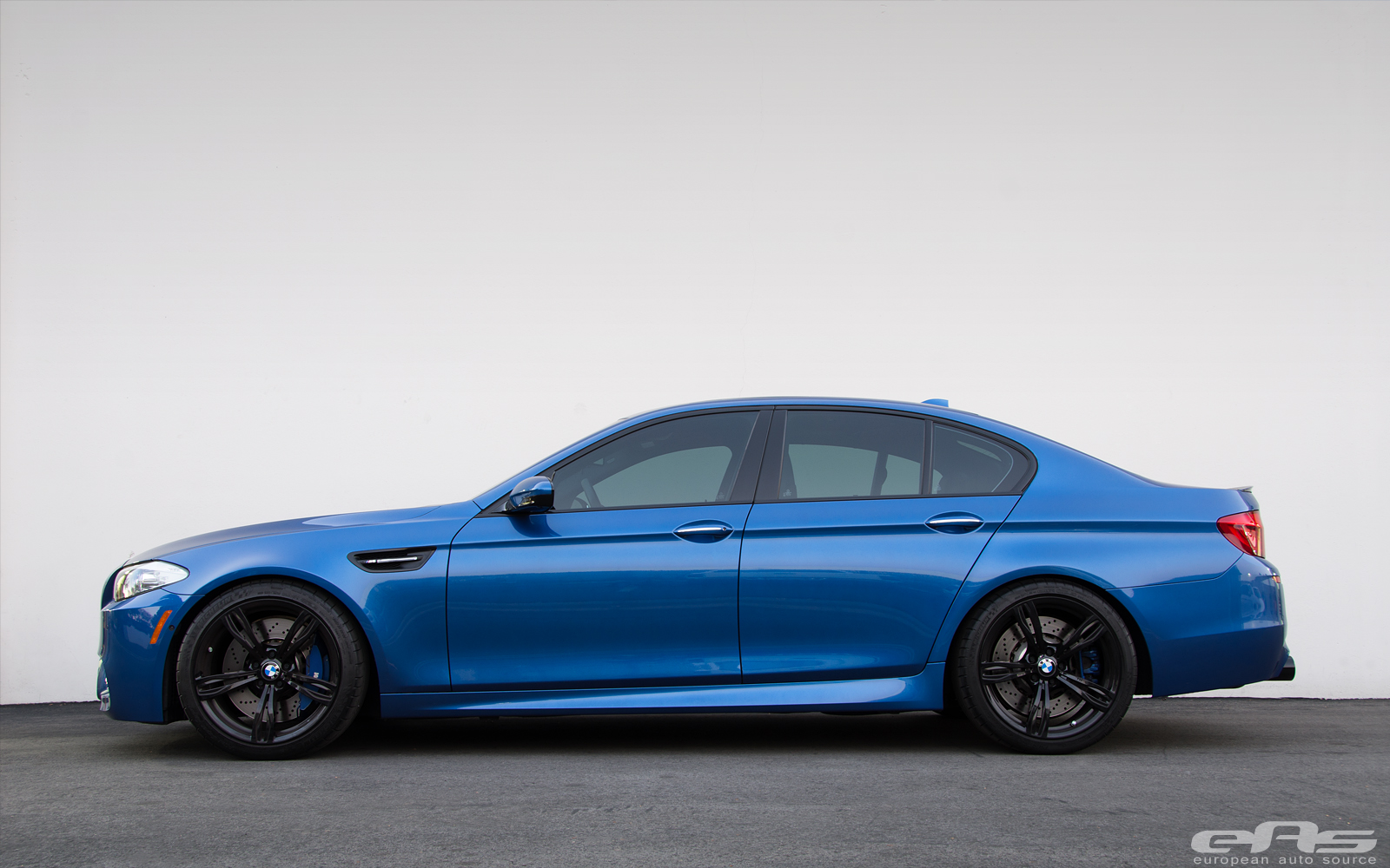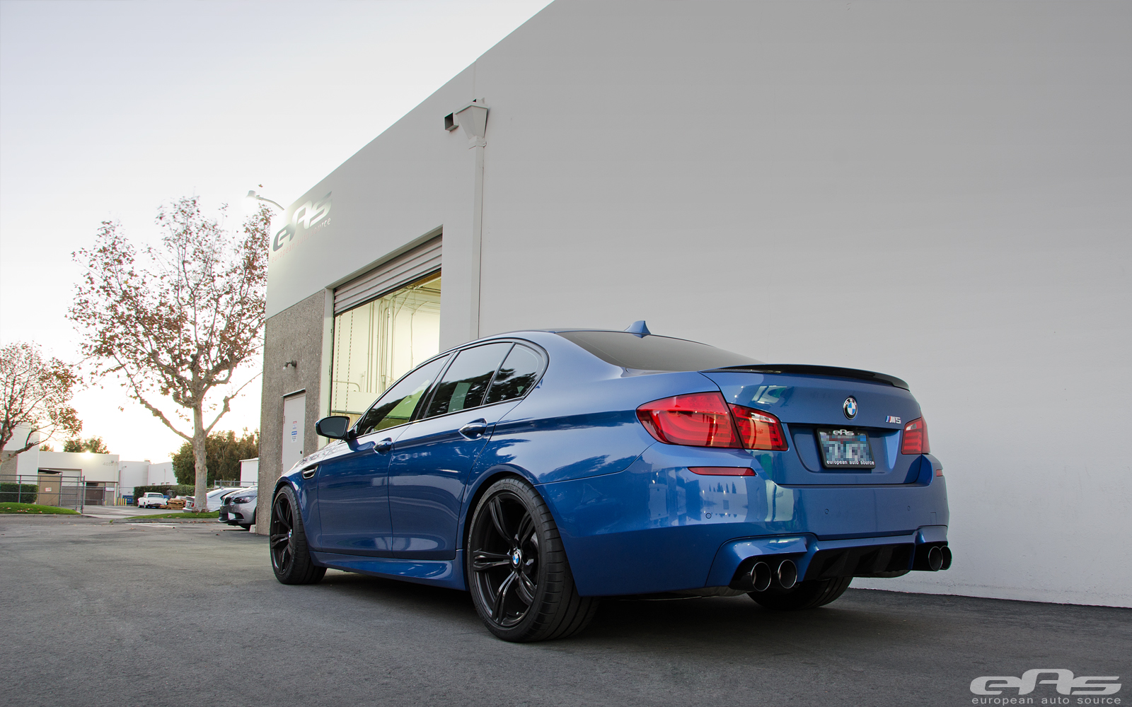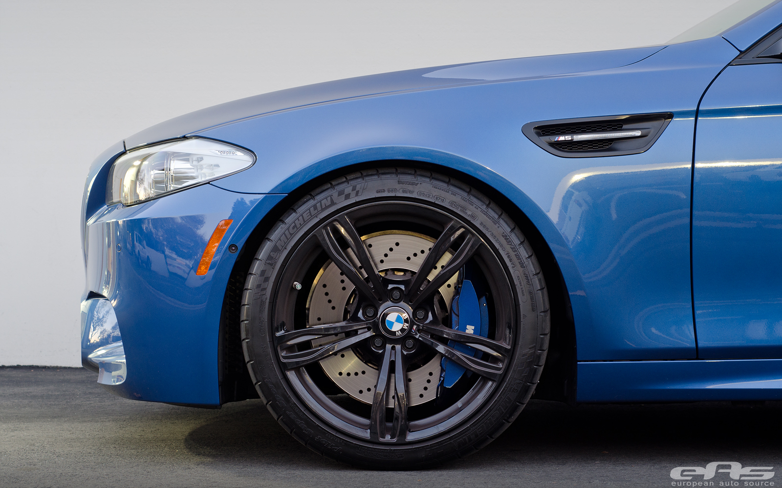 這部Monte Carlo Blue寶藍色塗裝的BMW F10 M5由改裝廠European Auto Source操刀,外觀方面換裝碳纖維後下擾流板、黑色水箱護罩、BMW Performance碳纖維擾流尾翼與黑色葉子板進氣孔飾蓋等部品。輪圈部分流用原廠部品並且將之施以燻黑塗裝處理,另外加裝Macht Schnell前12mm、後10mm的輪軸墊片同時換裝H&R短彈簧將車身降低,營造出更為寬扁的視覺效果。