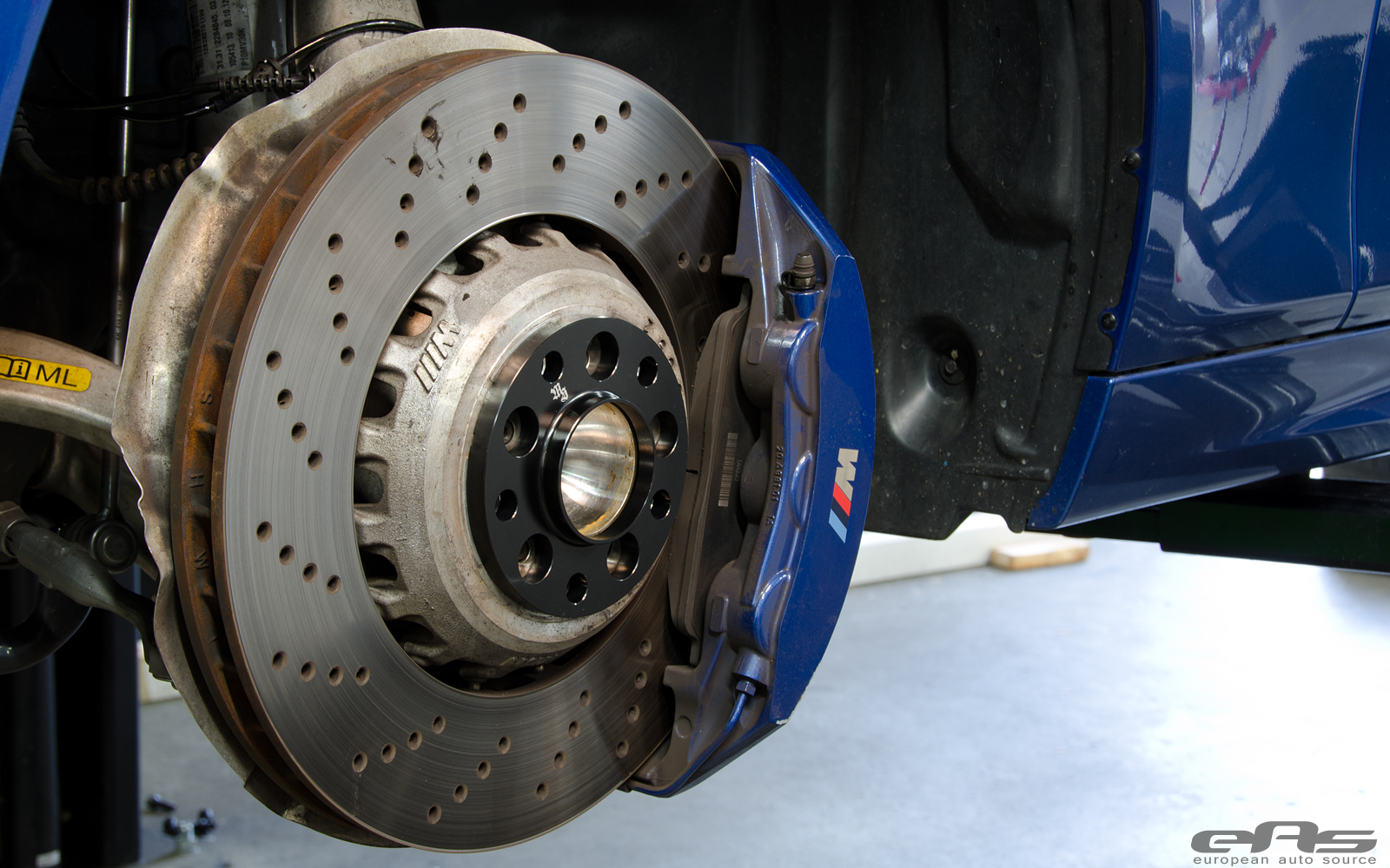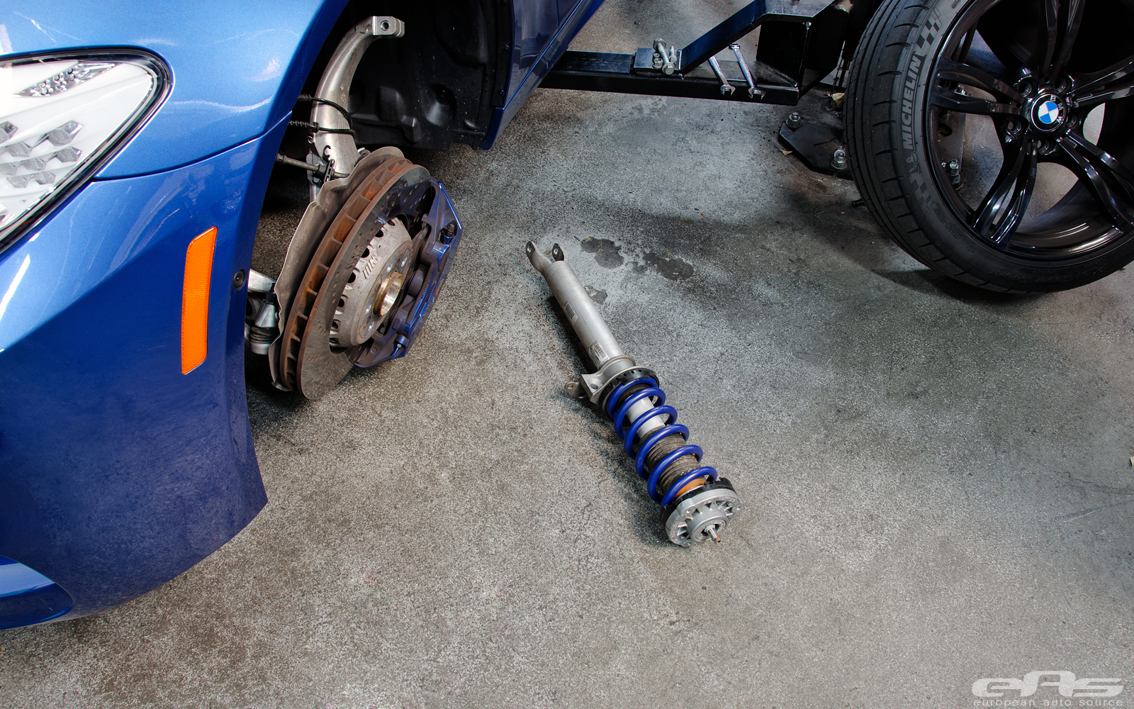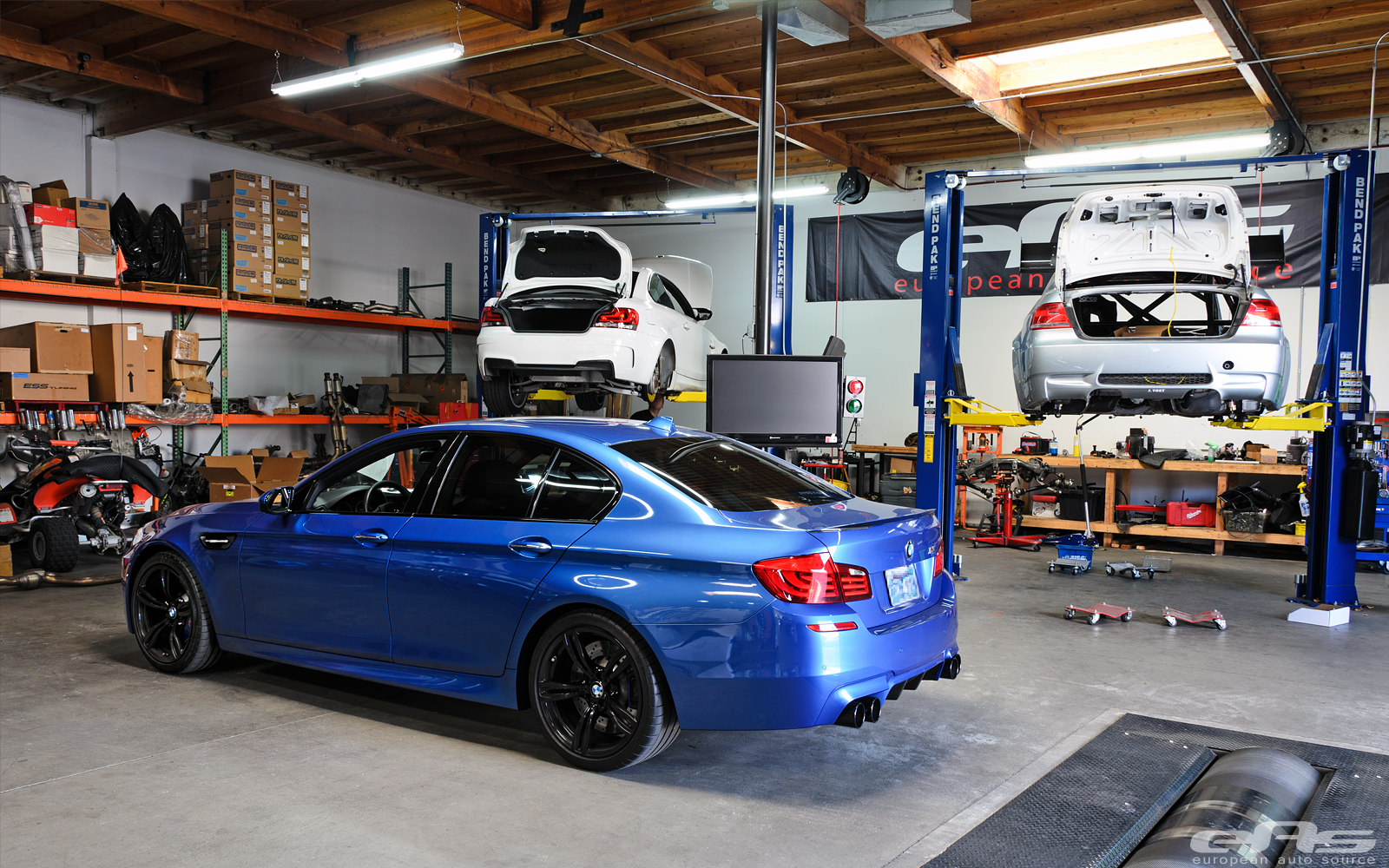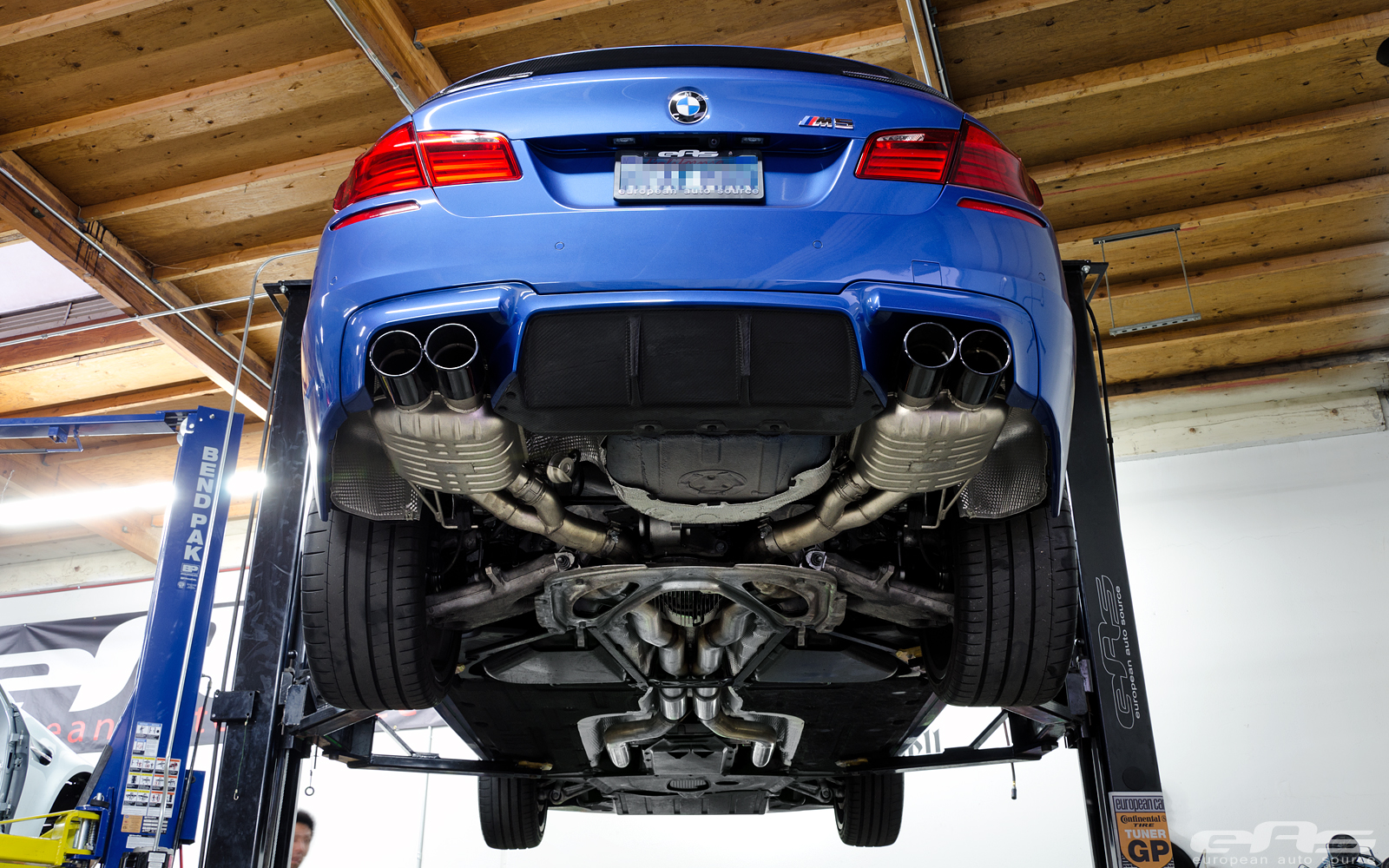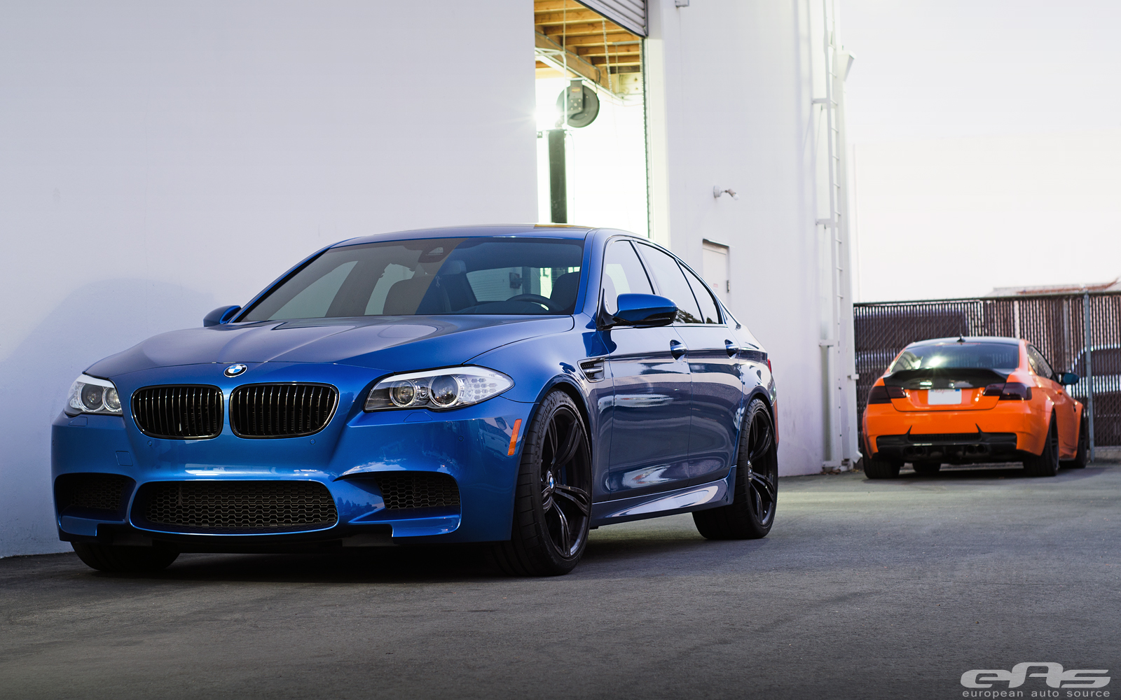 這部Monte Carlo Blue寶藍色塗裝的BMW F10 M5由改裝廠European Auto Source操刀,外觀方面換裝碳纖維後下擾流板、黑色水箱護罩、BMW Performance碳纖維擾流尾翼與黑色葉子板進氣孔飾蓋等部品。輪圈部分流用原廠部品並且將之施以燻黑塗裝處理,另外加裝Macht Schnell前12mm、後10mm的輪軸墊片同時換裝H&R短彈簧將車身降低,營造出更為寬扁的視覺效果。