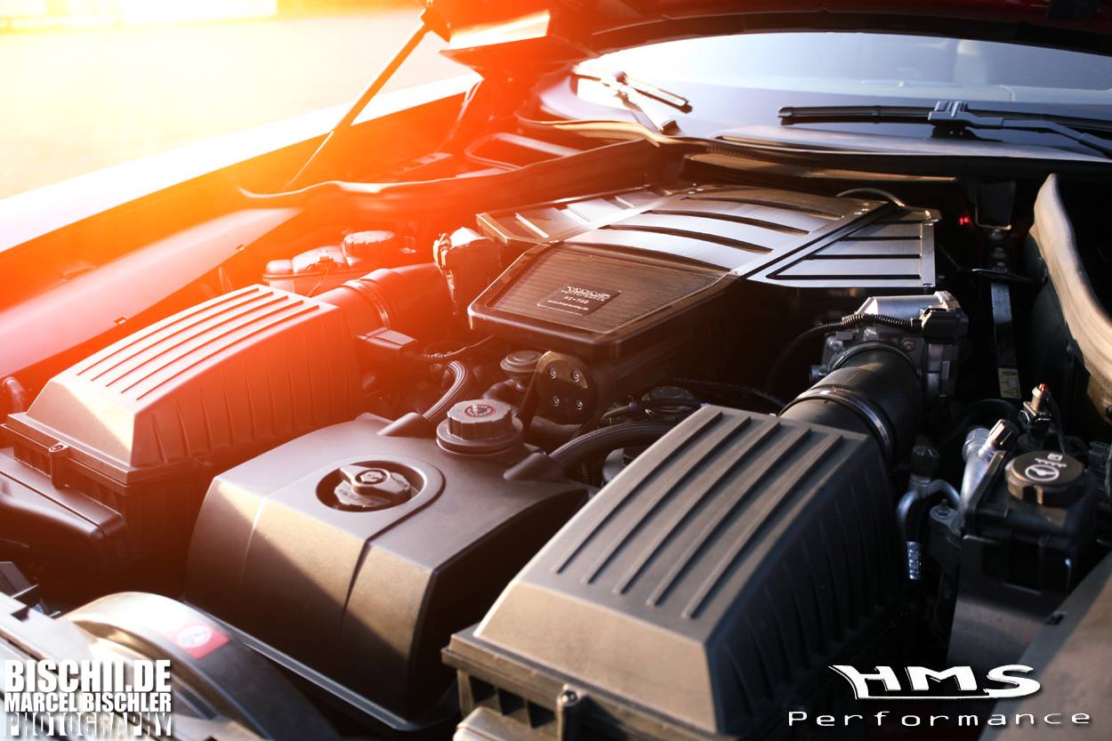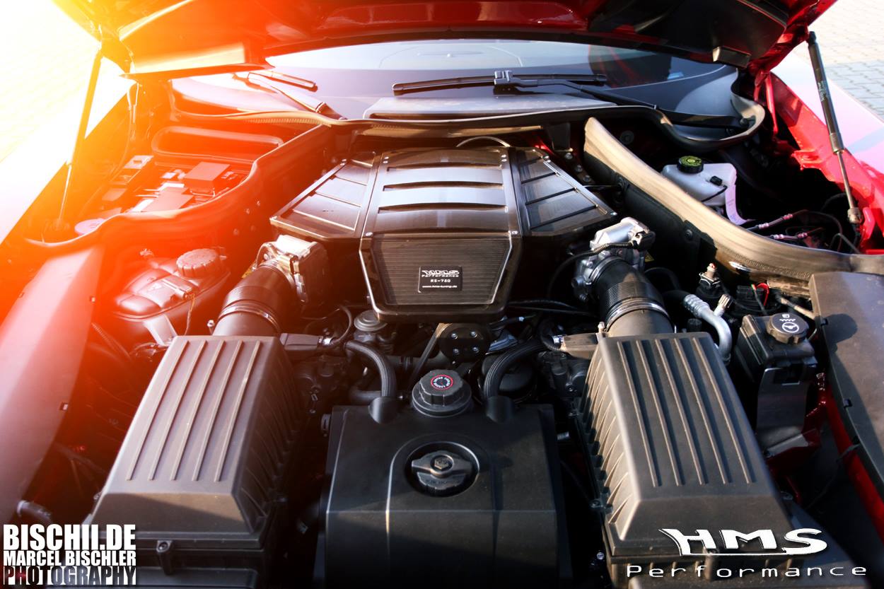 身為Mercedes Benz旗下當代旗艦超級跑車,SLS AMG原廠搭載6.2升V8自然進氣引擎,最大馬力為571HP,扭力峰值為66.3kgm,已經表現相當不俗,然而在追求極致性能的改裝狂人眼中依舊略嫌不足,但是那高達6.2升之排氣量卻提供增壓改裝一途絕佳的先天優勢。HMS Performance將整顆引擎從車頭卸下,重新拆解後換裝鍛造活塞、連桿與高角度凸輪軸,並且施以曲軸萬轉平衡工程與精密重組,另外換裝全段高性能排氣管與高效率碳纖維進氣系統等部品,最後將最大馬力提升至785HP,扭力暴增為93.9kgm,於各種數據方面皆超越進階版本SLS AMG Black Series。