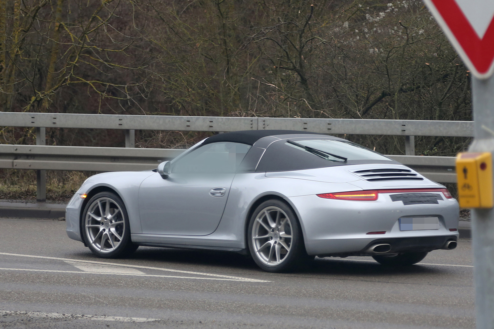 即將在2014底特律車展上出現的全新2015 Porsche 911 Targa近來有越來越多的訊息釋出,而照片中的她偽裝也越來越少,讓人們越來越可以見到他的真面貌,事實上全新991 Targa與991 Targa S將連袂在2014底特律車展上發表,很明顯的照片中的原形車幾乎就會是量產版本的樣子,可以看到其車尾已經鑲上了銘牌,儘管用黑色膠帶貼住也遮不住其所透露出的氣勢。