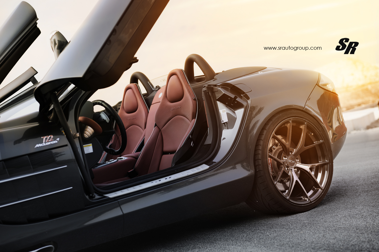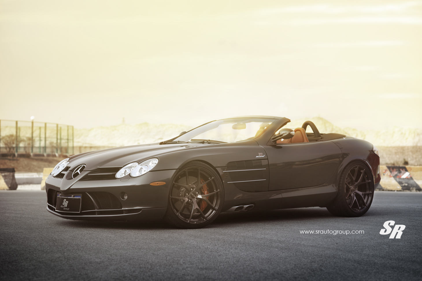 今天帶給各位的是部敞篷版本的Mercedes Benz SLR McLaren Roadster,葉子板處雖然貼有722字體,但其實並非正版722車款,不過透過點綴性改裝後依然相當具有看頭。輪圈部分,改裝店家換上知名品牌PUR Wheels出品、型號4OUR的輕量化輪圈,尺寸為前20x9J、後20x11.5J的前後配規格,圈面採用鑽石黑色塗裝,另外換裝高低軟硬可調式避震器將車身降低,跑格油然而生。