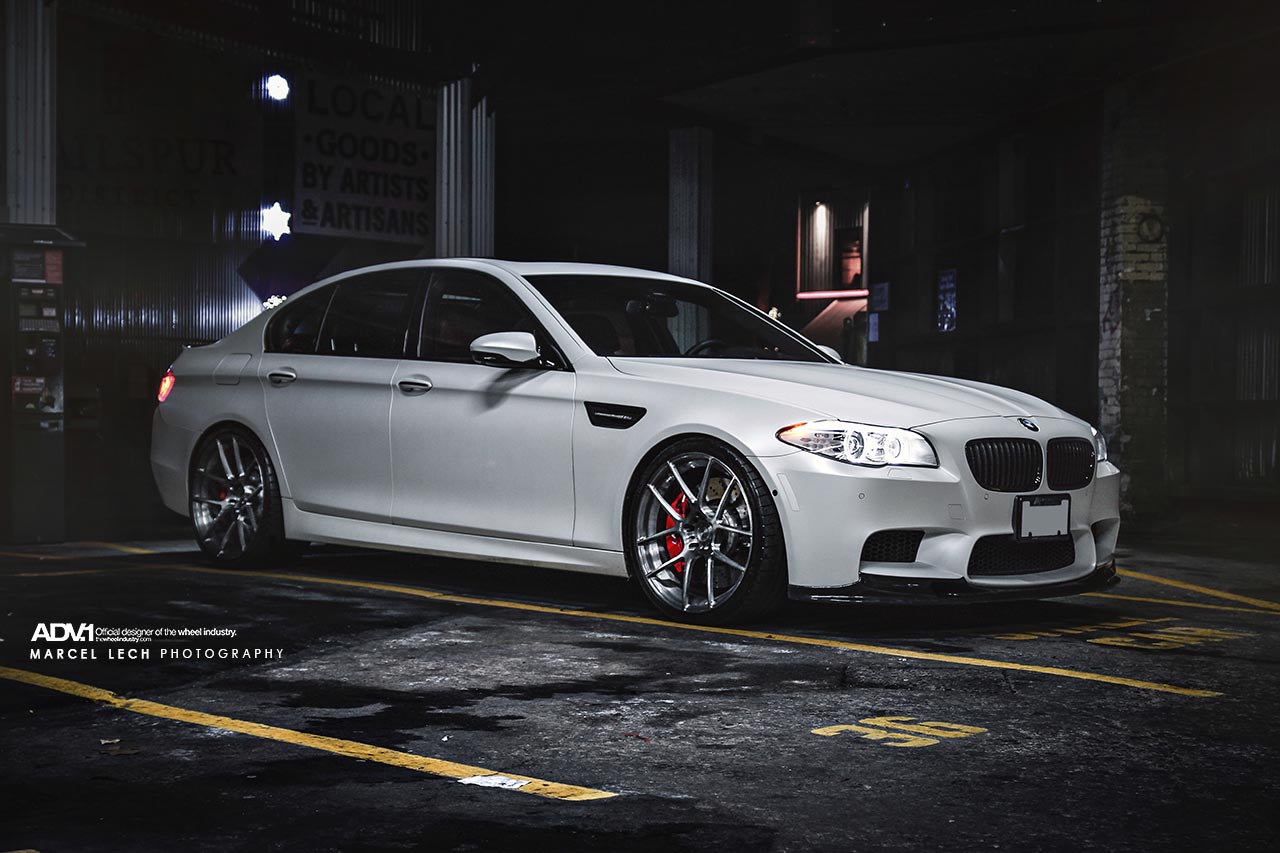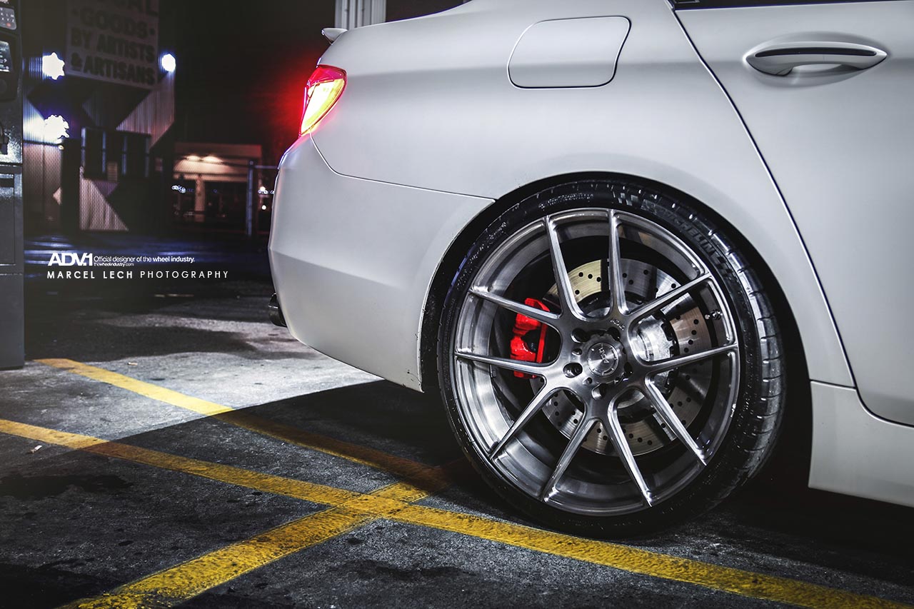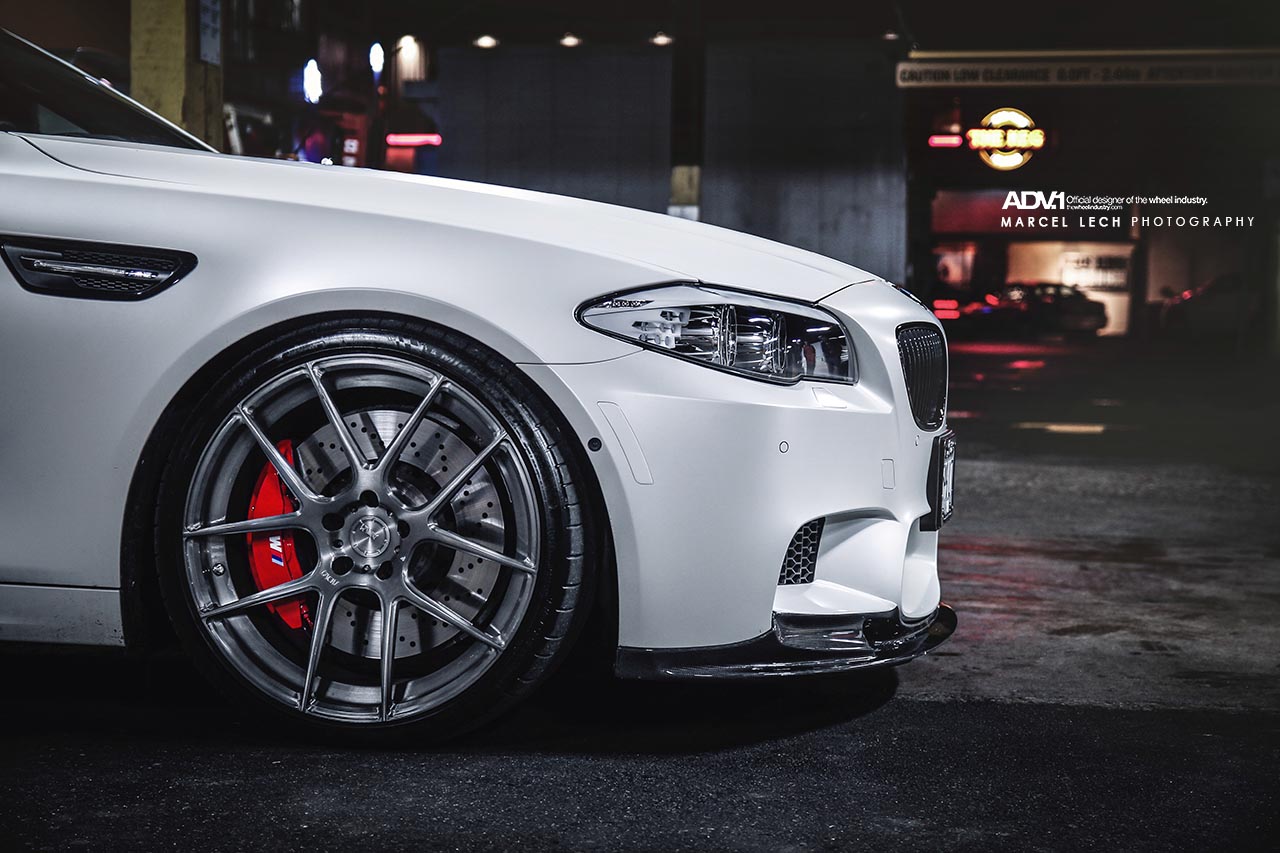 今天帶給各位一部2013年款式的消光白色塗裝BMW F10 M5,車主自行換裝知名品牌ADV.1 Wheels、型號ADV5.0 TS SL款式的21吋輪圈搭配Michelin Pilot Super Sport高性能跑胎,另外透過換裝高低軟硬可調式避震器組將車身降低。此外,選用來自3D Design的碳纖維前下巴、後下擾流板與後擾流尾翼等部品,並將煞車卡鉗施以紅色塗裝,視覺效果相當鮮明。