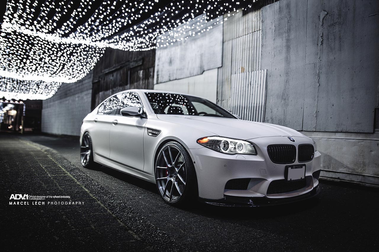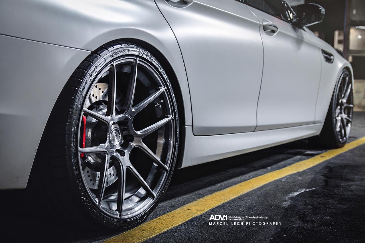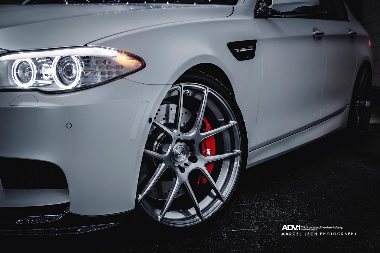 今天帶給各位一部2013年款式的消光白色塗裝BMW F10 M5,車主自行換裝知名品牌ADV.1 Wheels、型號ADV5.0 TS SL款式的21吋輪圈搭配Michelin Pilot Super Sport高性能跑胎,另外透過換裝高低軟硬可調式避震器組將車身降低。此外,選用來自3D Design的碳纖維前下巴、後下擾流板與後擾流尾翼等部品,並將煞車卡鉗施以紅色塗裝,視覺效果相當鮮明。