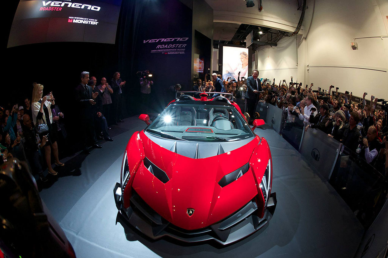 2013年日內瓦車展(Geneva Motor Show)當中,義大利超級跑車廠Lamborghini發表了以Aventador LP700-4為基礎打造而來的Lamborghini Veneno,並在發表之時便已將限量三部的配額銷售一空,隨後方追加9部敞篷版本車型供給世界各地的頂級買主。各位眼前這部Rosso Veneno金屬紅色塗裝的Lamborghini Veneno Roadster便是先前於美國比佛利山莊(Beverley Hills, USA)私人發表會現身的同一部,同時也是Lamborghini原廠與義大利空軍合力於杜拜(Dubai)舉辦全球發表會的同一台。