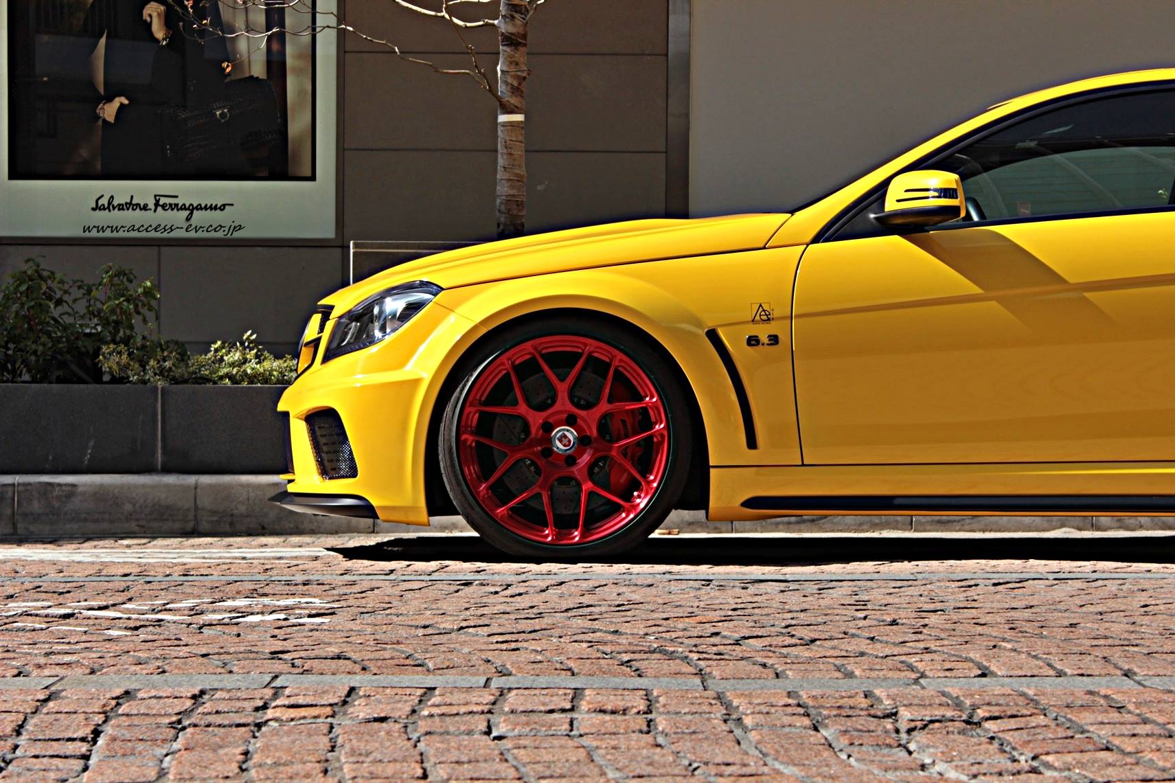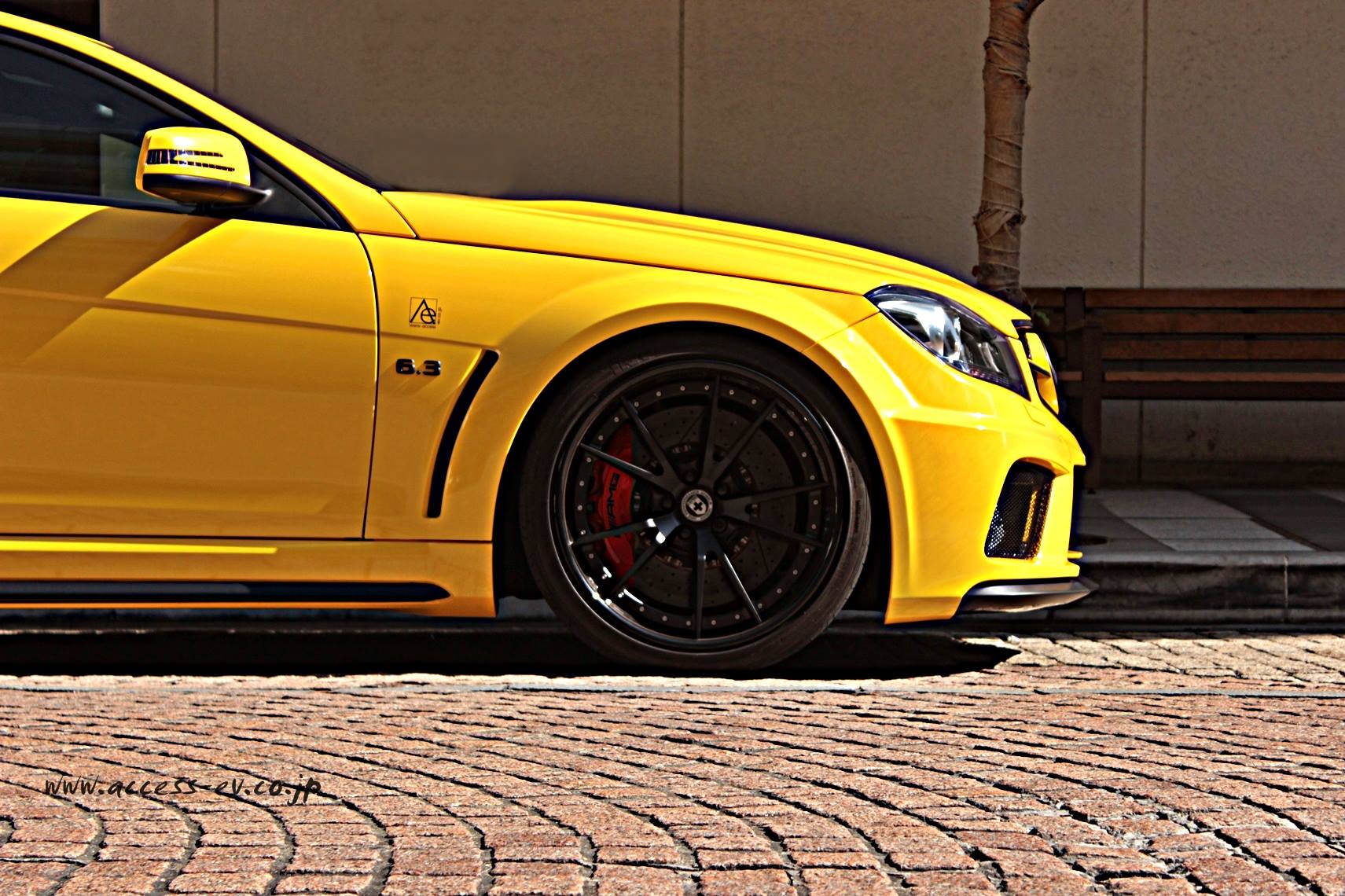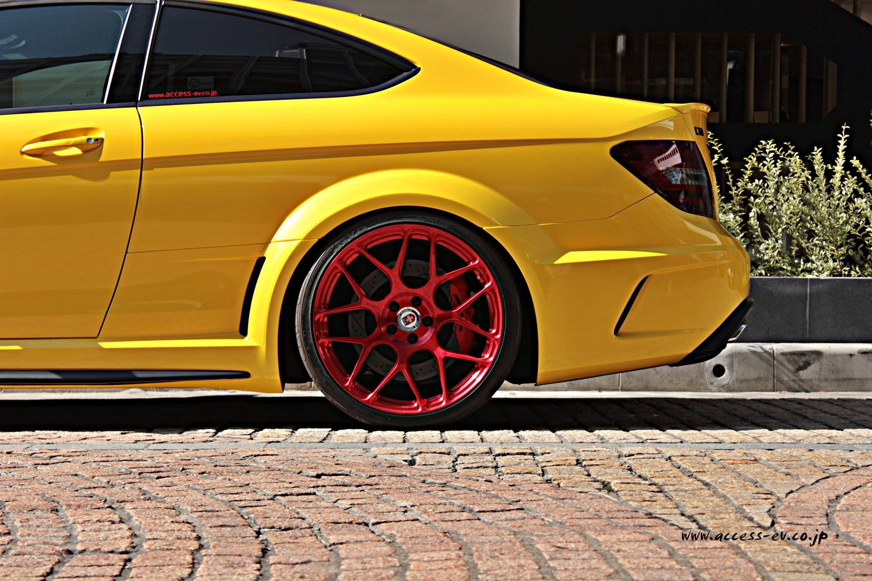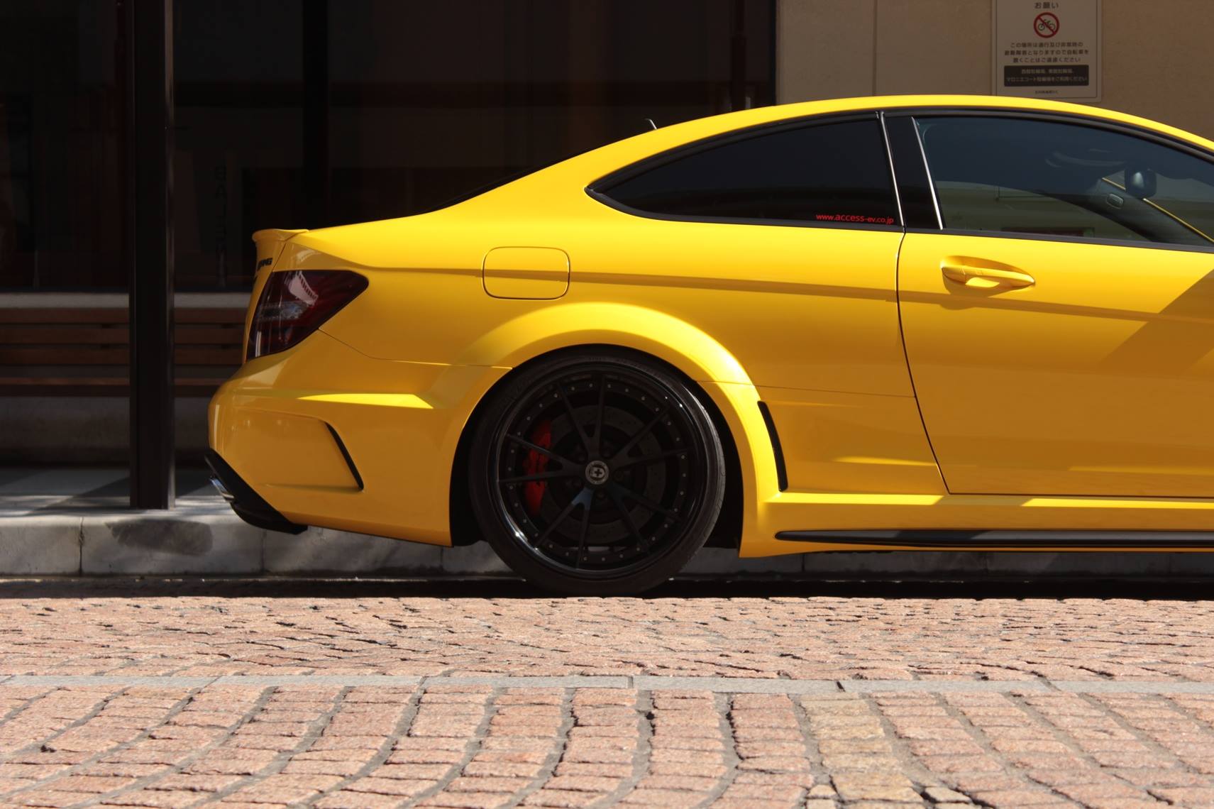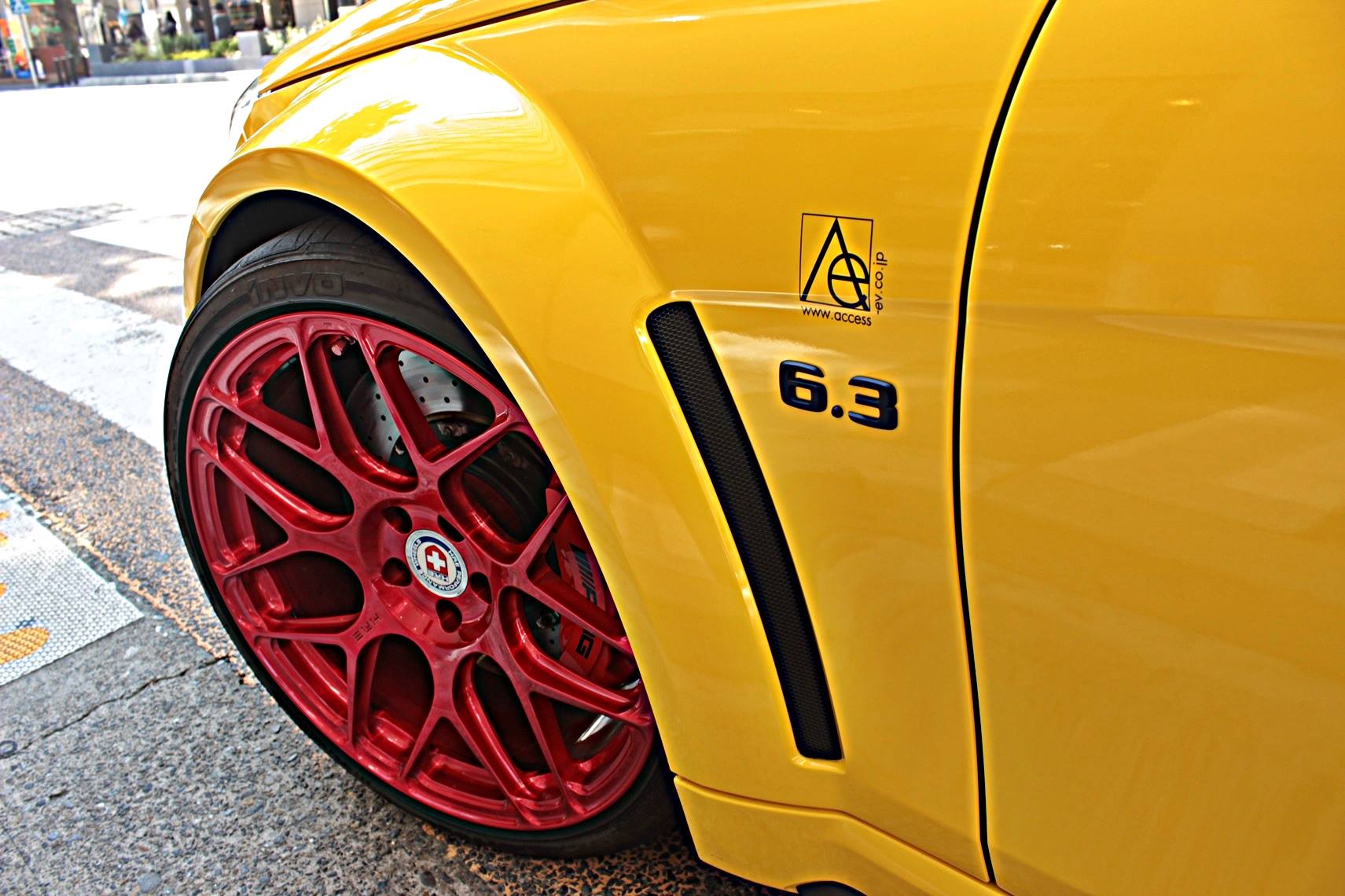 今天帶給各位的則是800部當中被銷往日本(Japan)的其中一部Mercedes Benz C63 AMG Coupe Black Series,由改裝廠Wing Auto與Access-ev共同操刀規劃,左右側輪圈換上兩組不同、皆由知名品牌HRE Performance Wheels之輪圈,型號分別為較新款式的S104與經典款P40SC,其中P40SC選用亮眼的電鍍紅色塗裝,S104則採用黑色處理,讓車身左右兩側呈現不同風格,另外換裝高低軟硬可調式避震器組將車身降低,搭配全車施以的3M黃色貼膜,吸睛程度百分百。