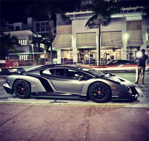 日前,限量三部雙門版本Lamborghini Veneno其中一部已運抵美國邁阿密(Miami, USA),世上僅有的三部Veneno都採用鐵灰色車身塗裝,然而在空力套件下緣、輪胎與煞車卡鉗處分別為紅、白、綠等義大利國旗三色,而該車是Verde Ithaca綠色版本。這位對於Lamborghini擁有無比狂熱的多金車主同時還擁有Lamborghini Murcielago LP670-4 Super Veloce與Aventador LP700-4等蠻牛品牌超級跑車,而在這部Veneno送到面前後,他立刻開上路兜風。