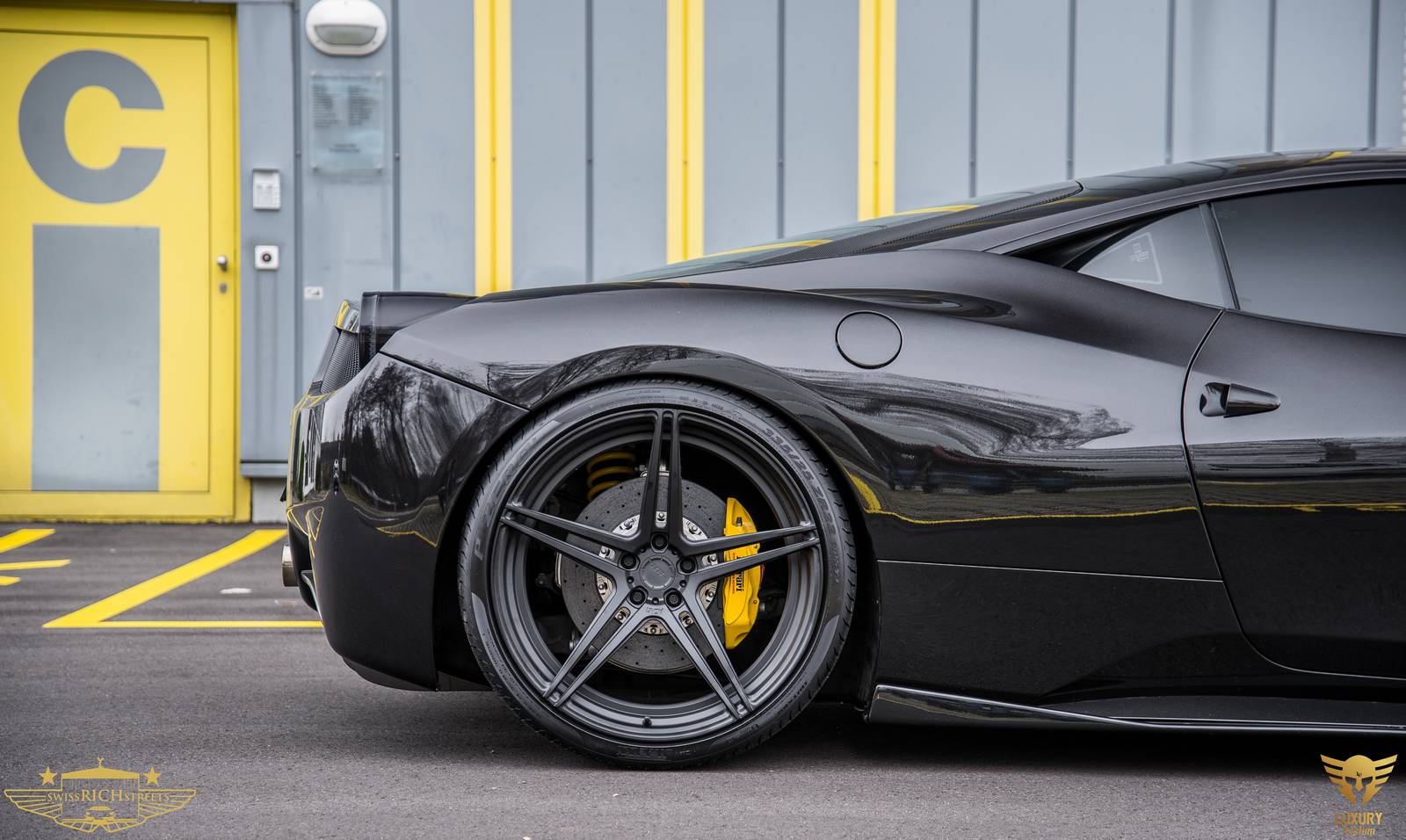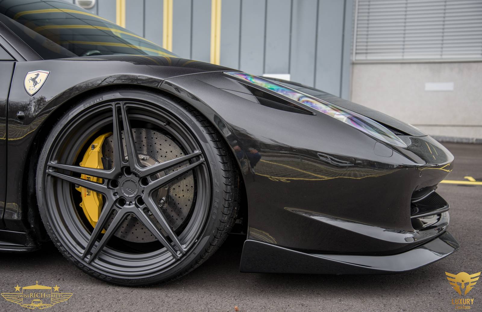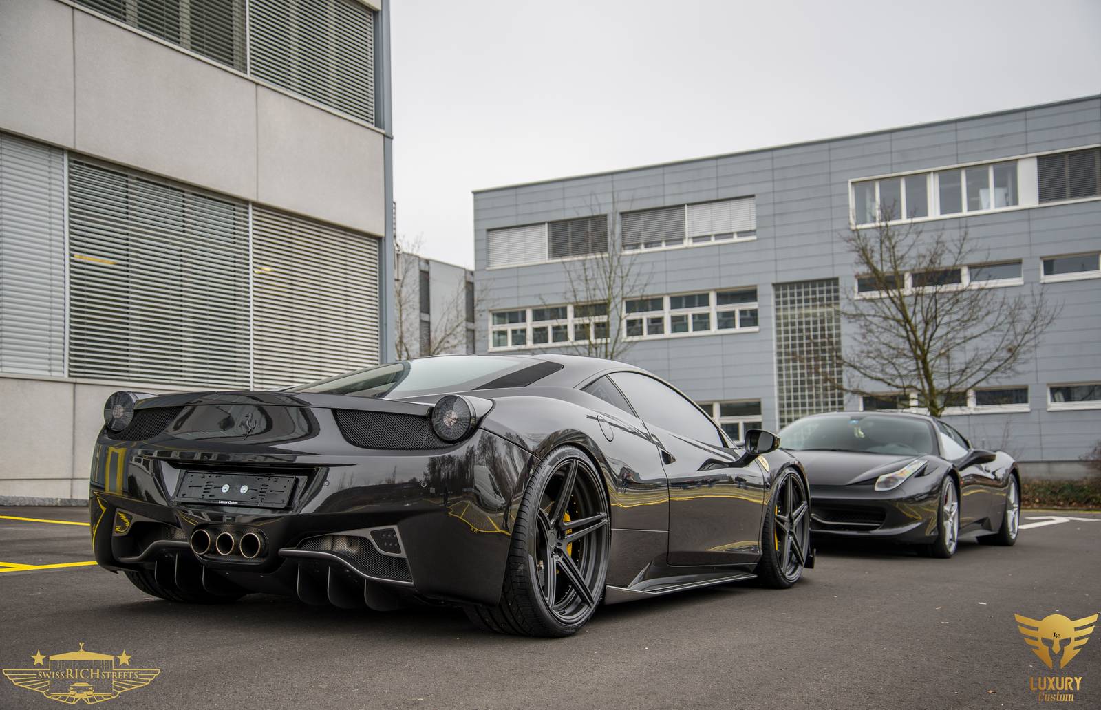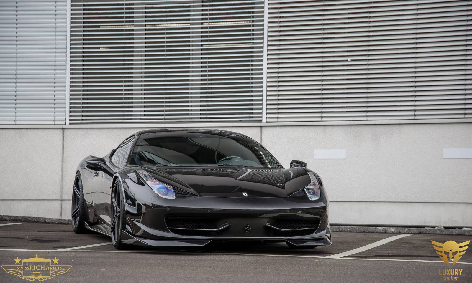 我們來欣賞一下眼前這部執行black on black計畫相當徹底的Ferrari 458 Italia,由瑞士(Switzerland)改裝廠Luxury Custom所操刀,首先將鍍鉻Ferrari銘板與尾燈施以燻黑處理並選用暗黑色系隔熱紙,另外換裝知名品牌ADV.1 Wheels的黑色輪圈、加裝前下巴、碳纖維氣壩定風翼與側裙組,再透過高低軟硬可調式避震器將車身降低,唯獨將煞車卡鉗保留著黃色塗裝,呼應葉子板上的Ferrari車隊金屬盾牌徽飾,這樣簡單塑造之後,讓這部Ferrari 458 Italia呈現出迷人無比的高質感。