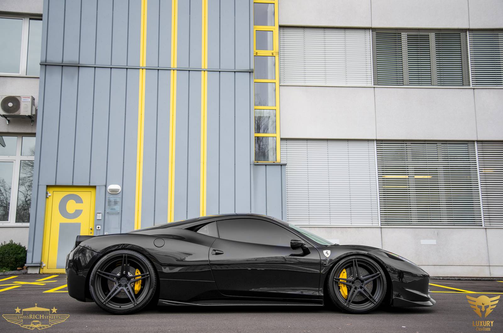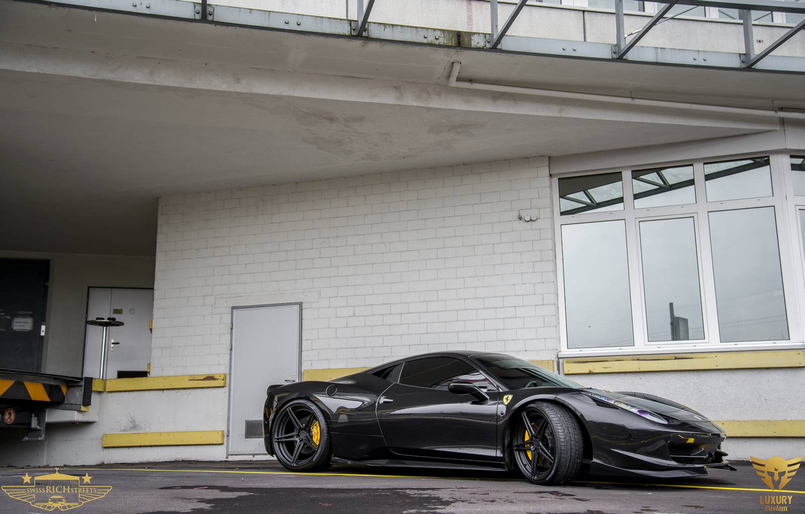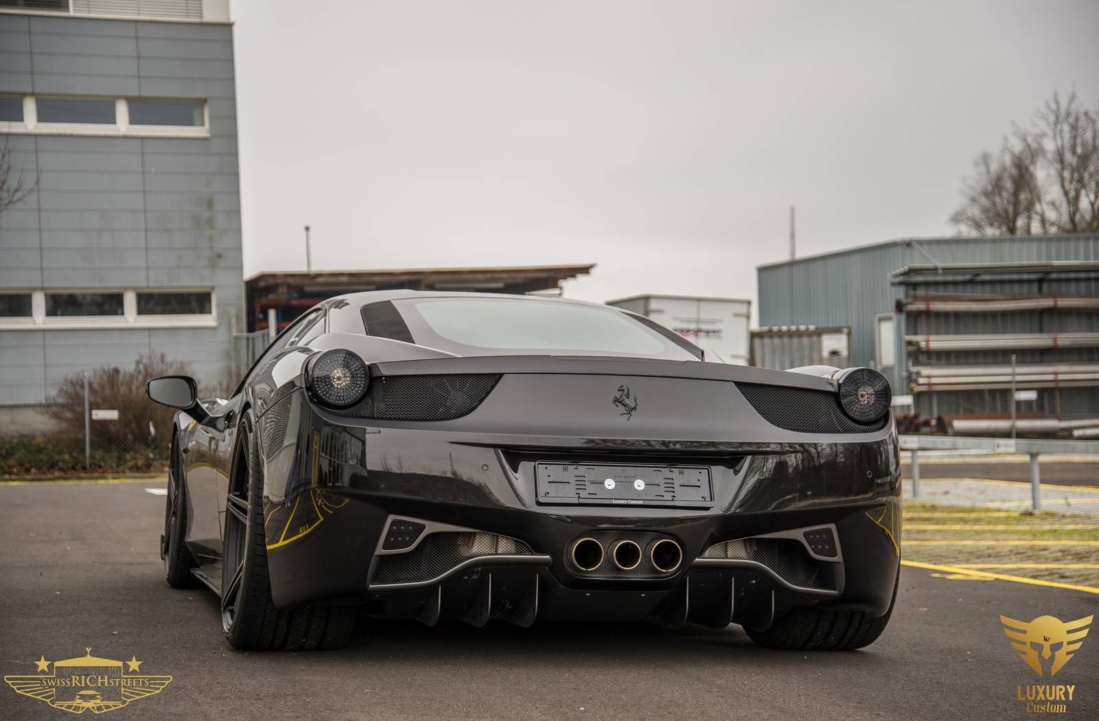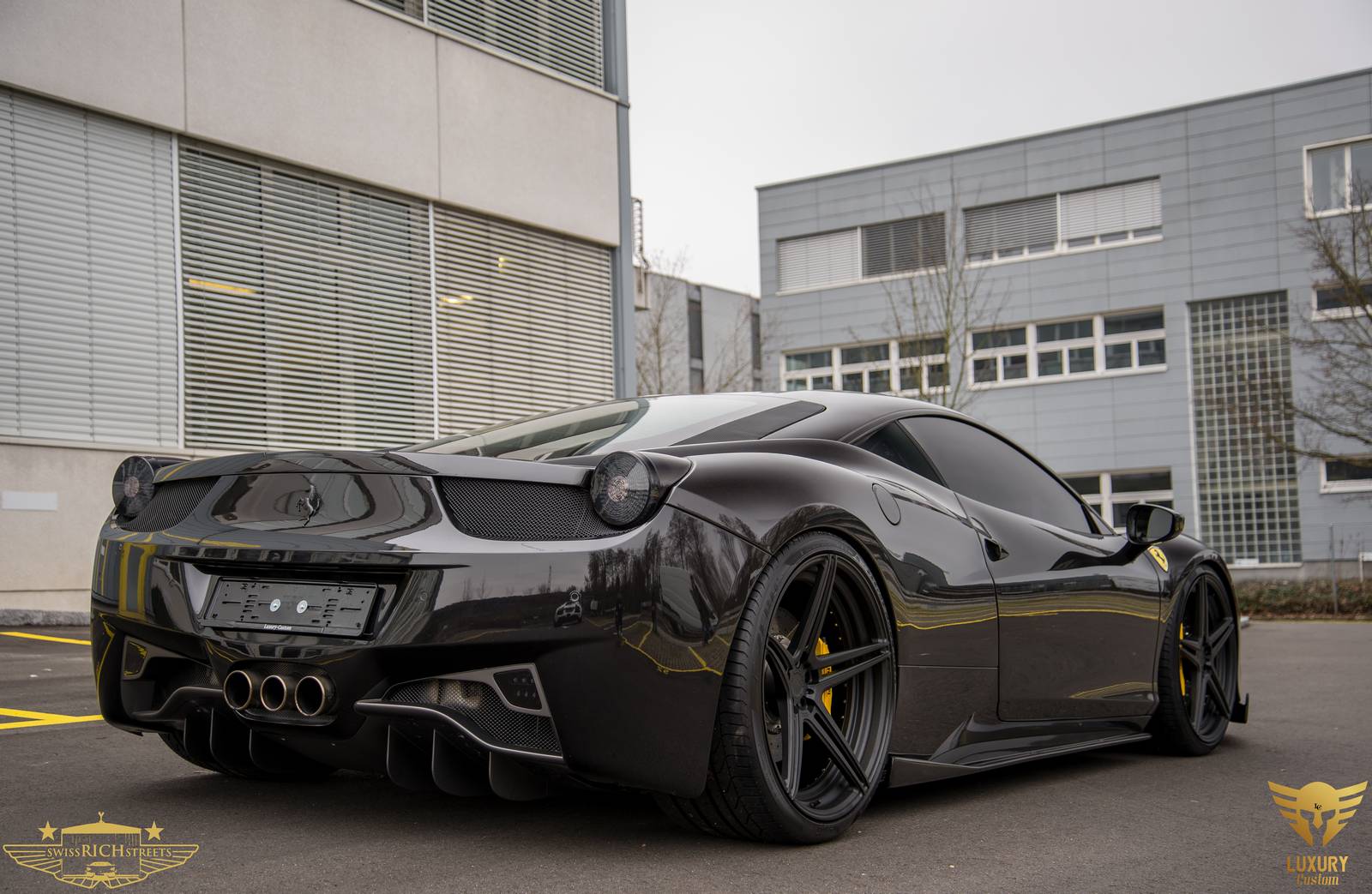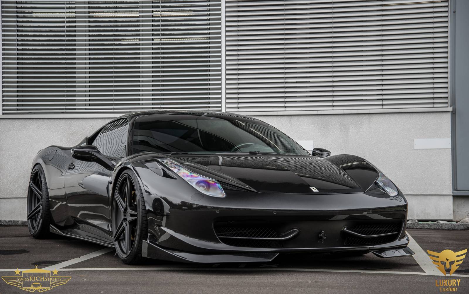 我們來欣賞一下眼前這部執行black on black計畫相當徹底的Ferrari 458 Italia,由瑞士(Switzerland)改裝廠Luxury Custom所操刀,首先將鍍鉻Ferrari銘板與尾燈施以燻黑處理並選用暗黑色系隔熱紙,另外換裝知名品牌ADV.1 Wheels的黑色輪圈、加裝前下巴、碳纖維氣壩定風翼與側裙組,再透過高低軟硬可調式避震器將車身降低,唯獨將煞車卡鉗保留著黃色塗裝,呼應葉子板上的Ferrari車隊金屬盾牌徽飾,這樣簡單塑造之後,讓這部Ferrari 458 Italia呈現出迷人無比的高質感。