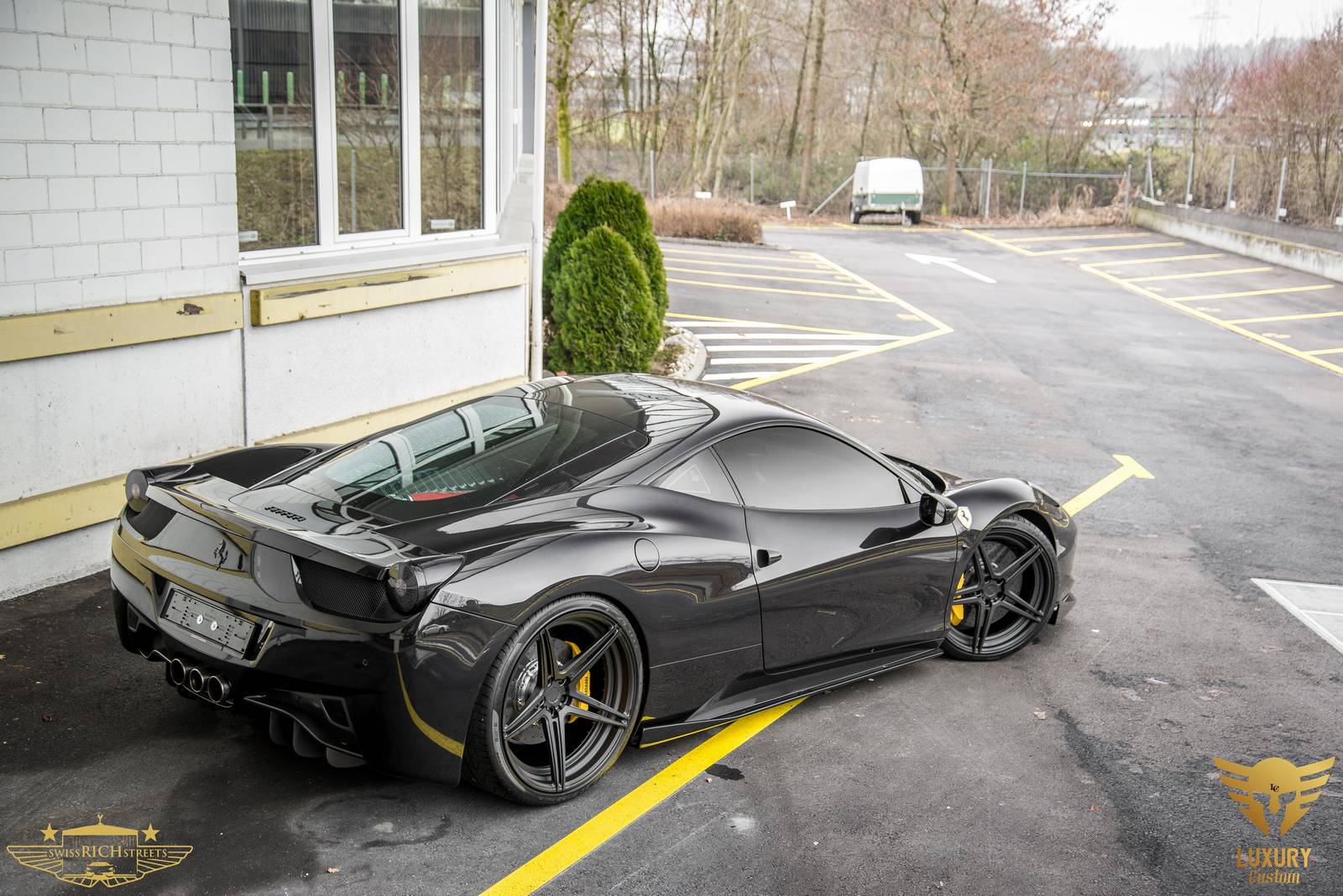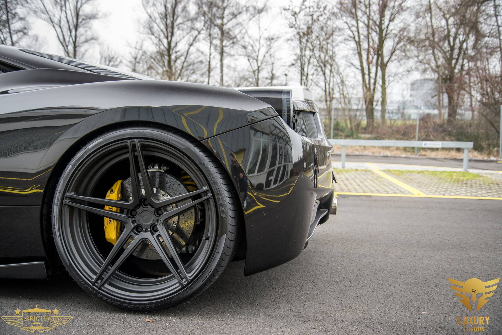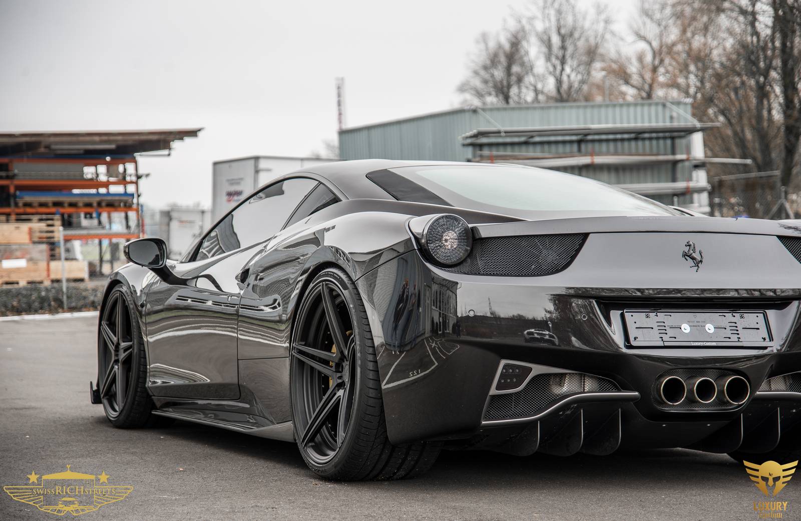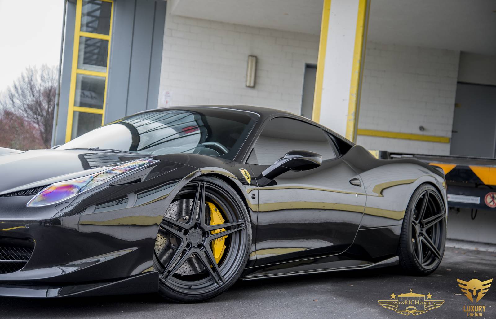 我們來欣賞一下眼前這部執行black on black計畫相當徹底的Ferrari 458 Italia,由瑞士(Switzerland)改裝廠Luxury Custom所操刀,首先將鍍鉻Ferrari銘板與尾燈施以燻黑處理並選用暗黑色系隔熱紙,另外換裝知名品牌ADV.1 Wheels的黑色輪圈、加裝前下巴、碳纖維氣壩定風翼與側裙組,再透過高低軟硬可調式避震器將車身降低,唯獨將煞車卡鉗保留著黃色塗裝,呼應葉子板上的Ferrari車隊金屬盾牌徽飾,這樣簡單塑造之後,讓這部Ferrari 458 Italia呈現出迷人無比的高質感。